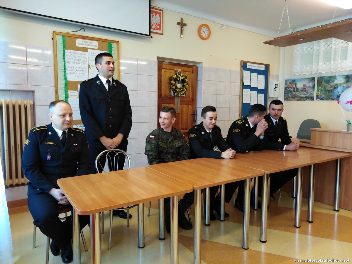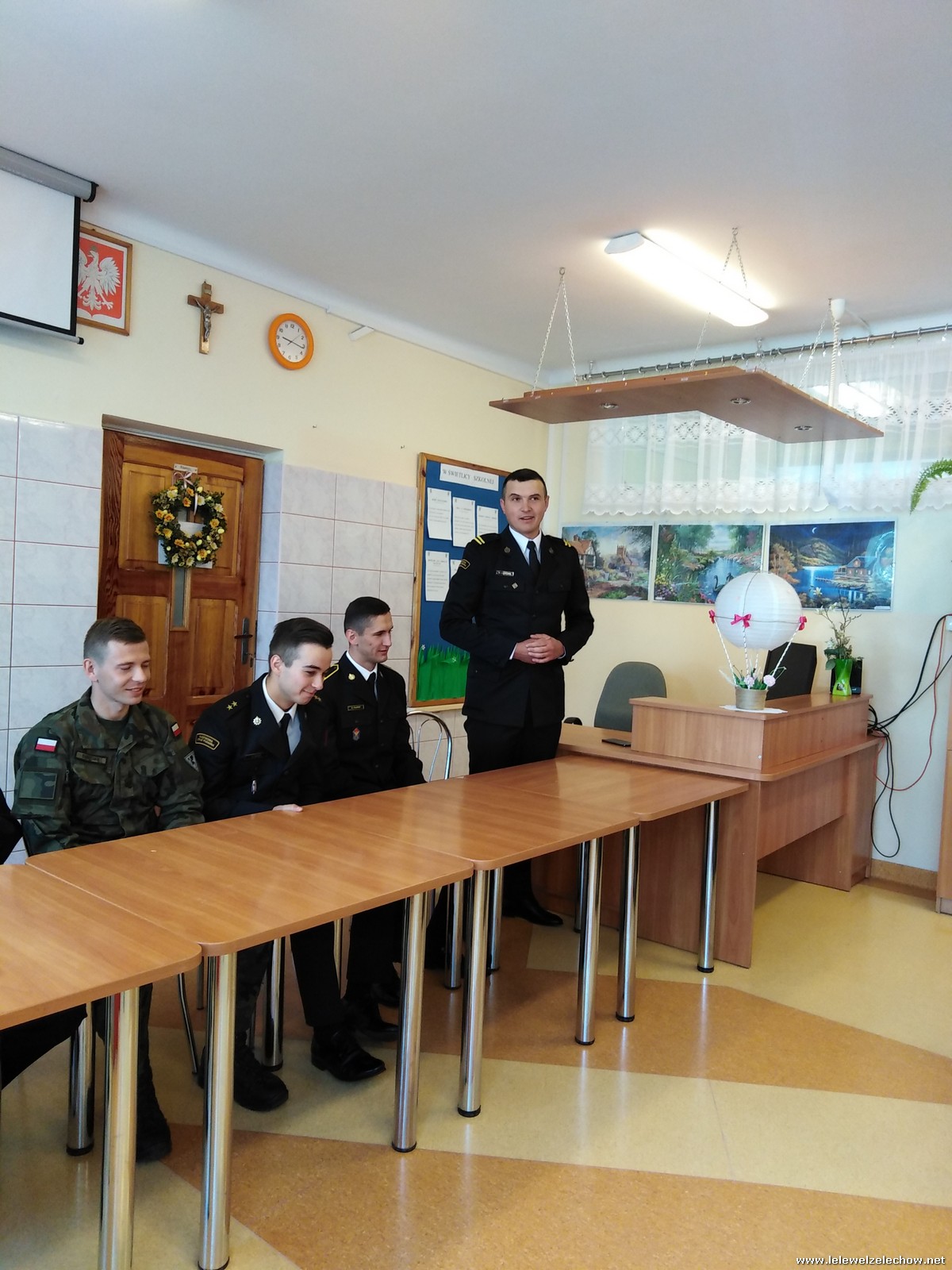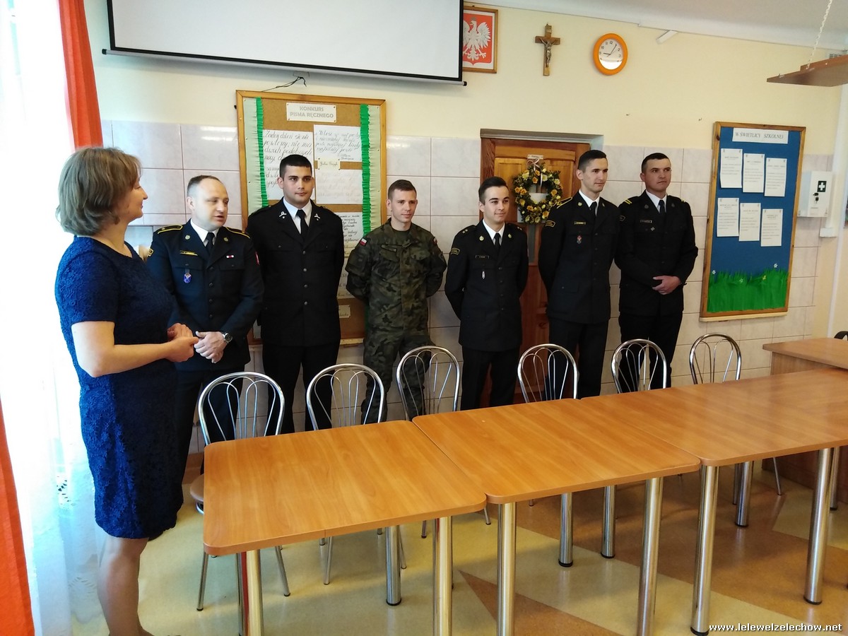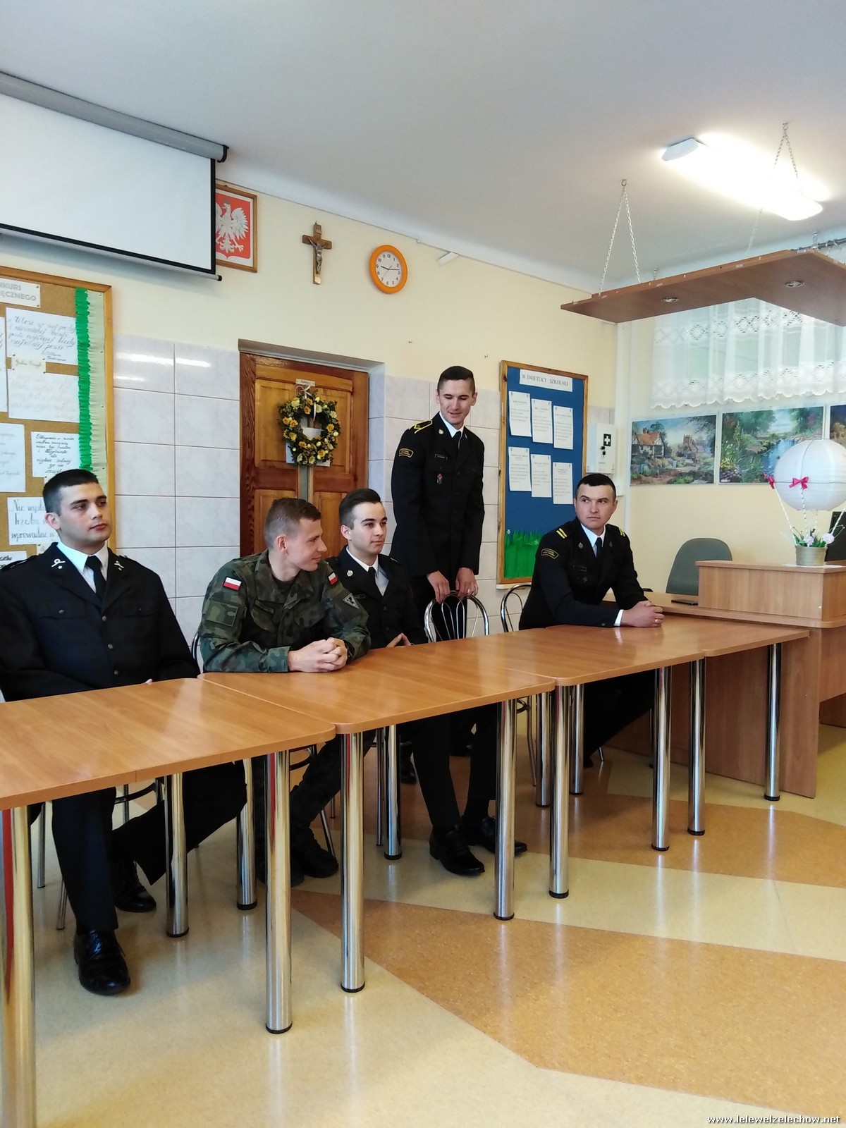 Na zaproszenie naszego niezastąpionego sora pana asp. Marcina Cicheckiego (który również jest funkcjonariuszem KP PSP w Garwolinie) panowie opowiedzieli zgromadzonej młodzieży "mundurowej" o swojej ścieżce do służby w Straży Pożarnej i odpowiedzieli na pytania uczniów. Chyba każdemu ze słuchaczy zaimponowała wytrwałość, z jaką realizowali swe cele i nadal pracują nad rozwojem osobistym. Dla nauczycieli to również było bardzo miłe spotkanie ze swoimi niedawnymi przecież uczniami Mamy nadzieję, że nasi goście z nie mniejszą radością odwiedzili szkolne mury
