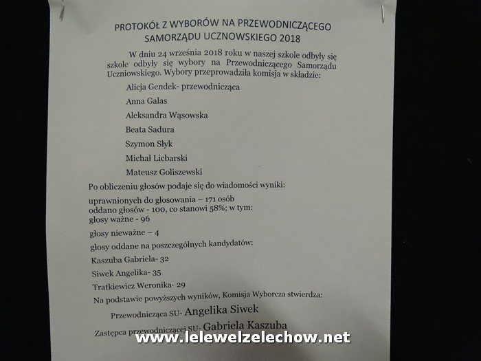 24 września odbyły się w naszej szkole wybory na Przewodniczącego SU. Kandydowały trzy uczennice: Gabriela Kaszuba, Angelika Siwek i Weronika Tratkiewicz. Lokal wyborczy stanowiła świetlica szkolna. Głosowanie odbywało się na przerwach o 8.30 do 12.25. Wybory przygotowała i przeprowadziła Komisja Wyborcza w składzie: Alicja Gendek – przewodnicząca, Ola Wąsowska, Beata Sadura, Ania Galas, Szymon Słyk, Mateusz Goliszewski i Michał Licbarski. Po zakończeniu głosowania Komisja przystąpiła do przeliczenia głosów. W sumie oddano 100 głosów, w tym 4 nieważne (frekwencja 58%). Rywalizacja pomiędzy kandydatkami była dość wyrównana. Ostatecznie głosami uczniów funkcję przewodniczącej Samorządu Uczniowskiego uzyskała Angelika Siwek z klasy II a , zaś zastępca została Gabriela Kaszuba z klasy I b. Gratulujemy! Na najbliższym spotkaniu Rady SU uczniowie wybiorą skarbnika oraz protokolanta.
