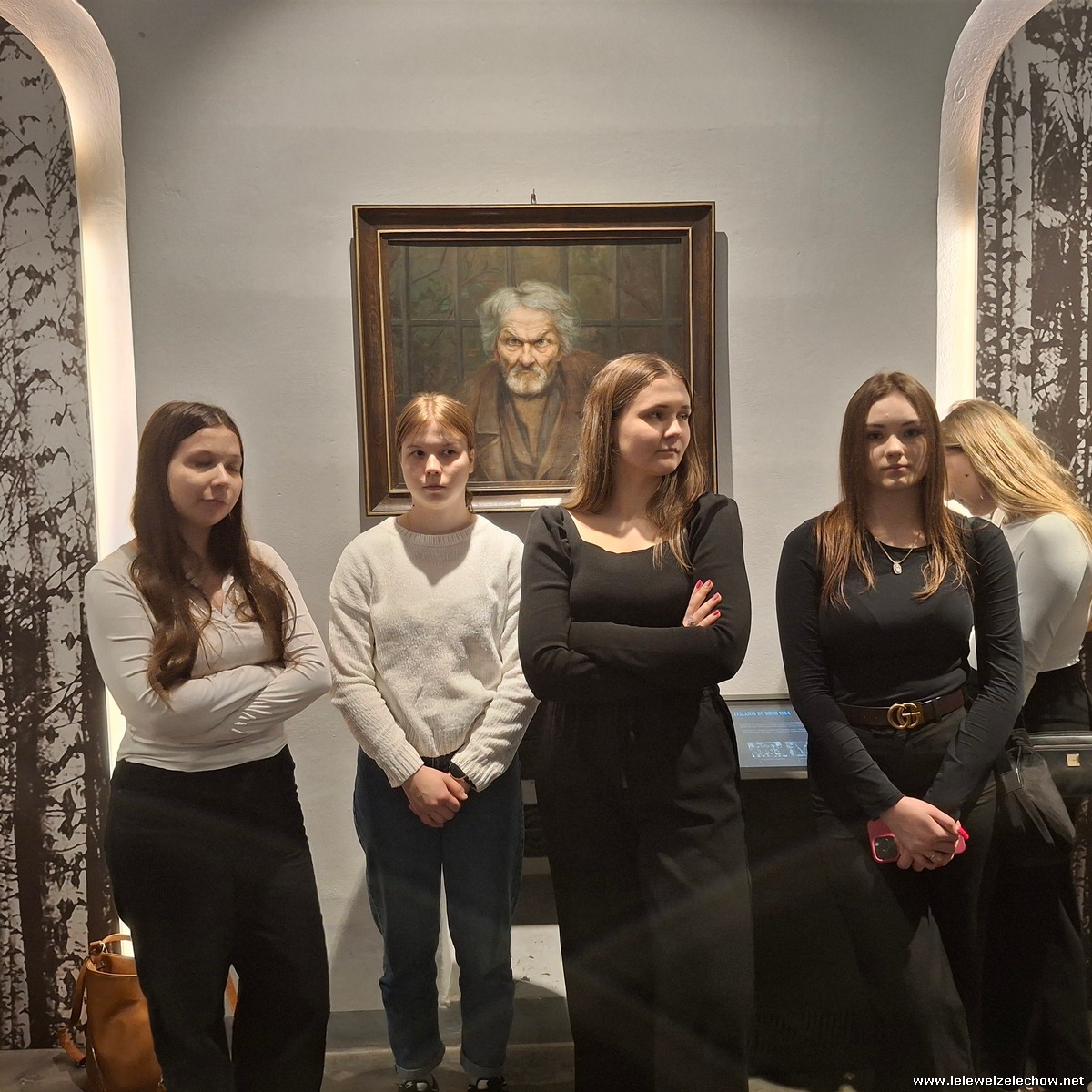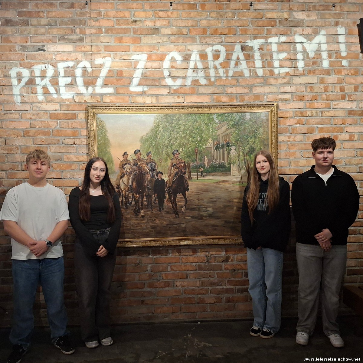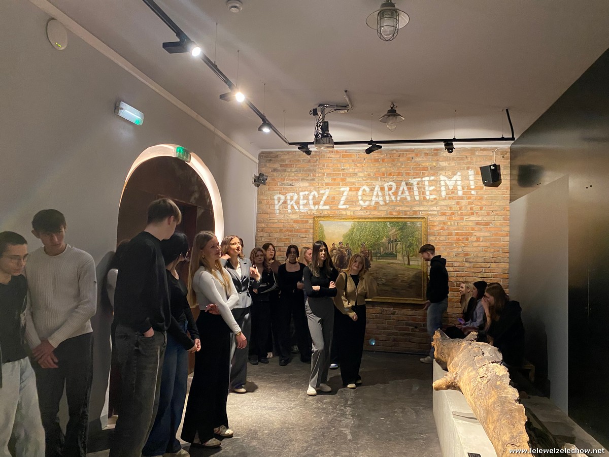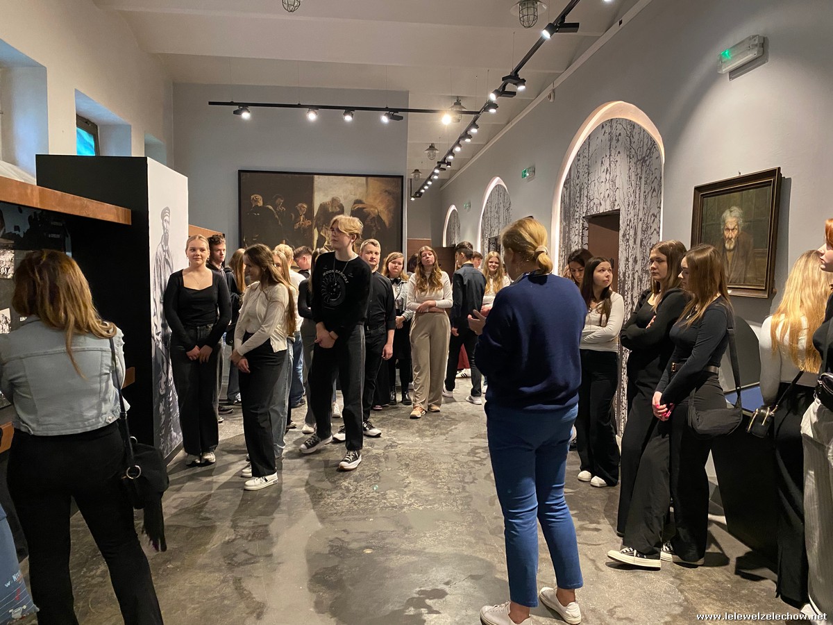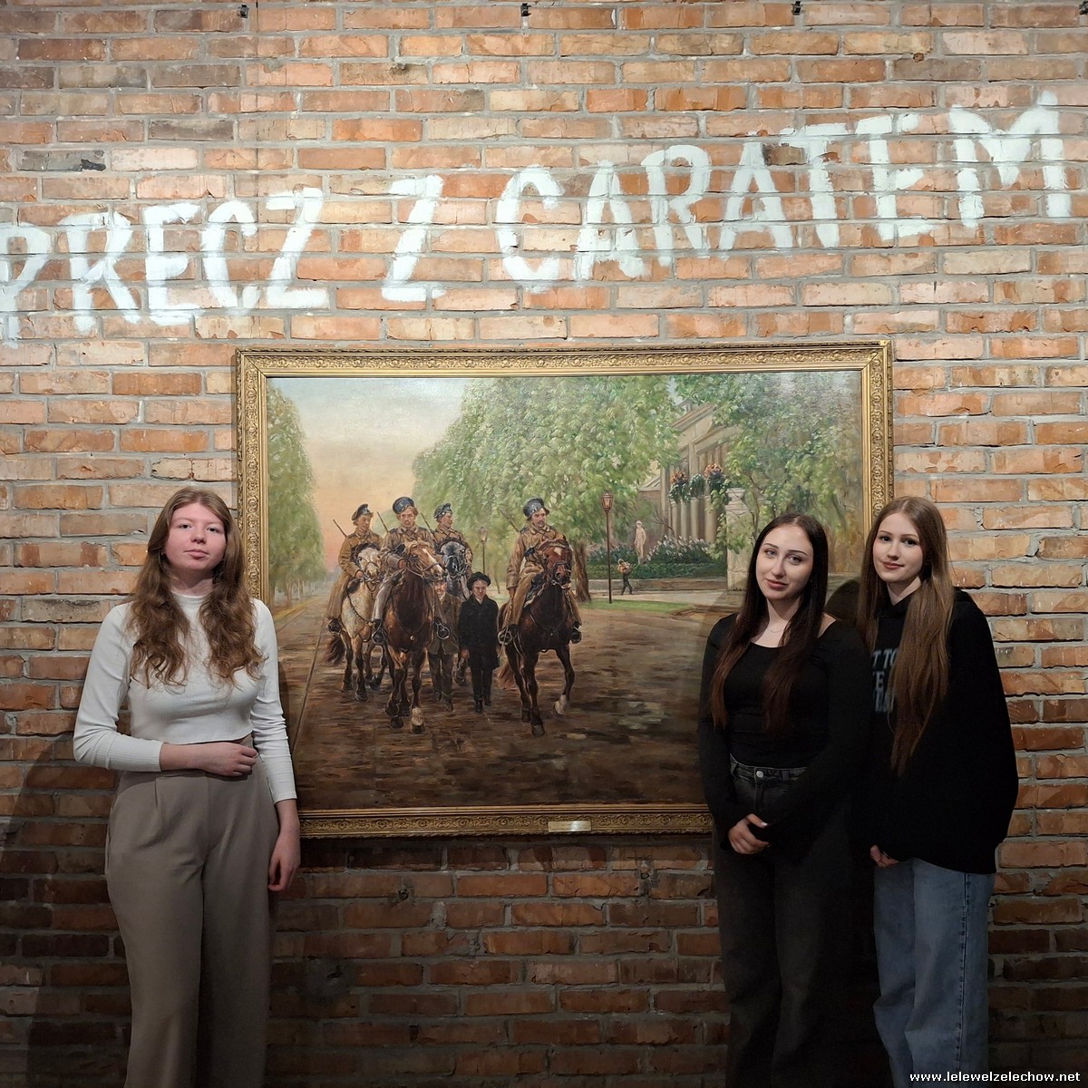Mogliśmy obejrzeć zachowane wnętrza z epoki, czyli cele więzienne z różnych okresów, w tym celę śmierci z czasów rewolucji 1905 r., salę śledczą czy pomieszczenia dla oczekujących na przesłuchania. Byliśmy m. in w celi Romualda Traugutta, księdza Piotra Ściegiennego, Józefa Piłsudskiego. Przewodniczka przybliżyła nam sylwetki przetrzymywanych tu więźniów politycznych, przypomniała życiorys Romualda Traugutta i okoliczności śmierci ostatniego dyktatora powstania styczniowego, który razem z innymi więźniami został stracony na stokach Cytadeli. Usłyszeliśmy też interesującą historię związaną z przetrzymywanym tu marszałkiem Piłsudskim. Ogromne wrażenie zrobiła na nas wystawa obrazów „kronikarza syberyjskiej katorgi”, czyli Aleksandra Sochaczewskiego. On również więziony był w Cytadeli, a po wybuchu powstania styczniowego został skazany na 20 lat pobytu na Syberii. Swoje życie poświęcił tworzeniu przejmujących dzieł dokumentujących katorgę i pobyt na zsyłce. Wszystkie obrazy były niezwykłe, jednak najbardziej poruszyło nas ogromnych rozmiarów płótno „Pożegnanie Europy”, na którym malarz uwiecznił szereg znanych zesłańców, w tym siebie – postać stojącą przy słupie granicznym z prawej strony patrzącą na słup.