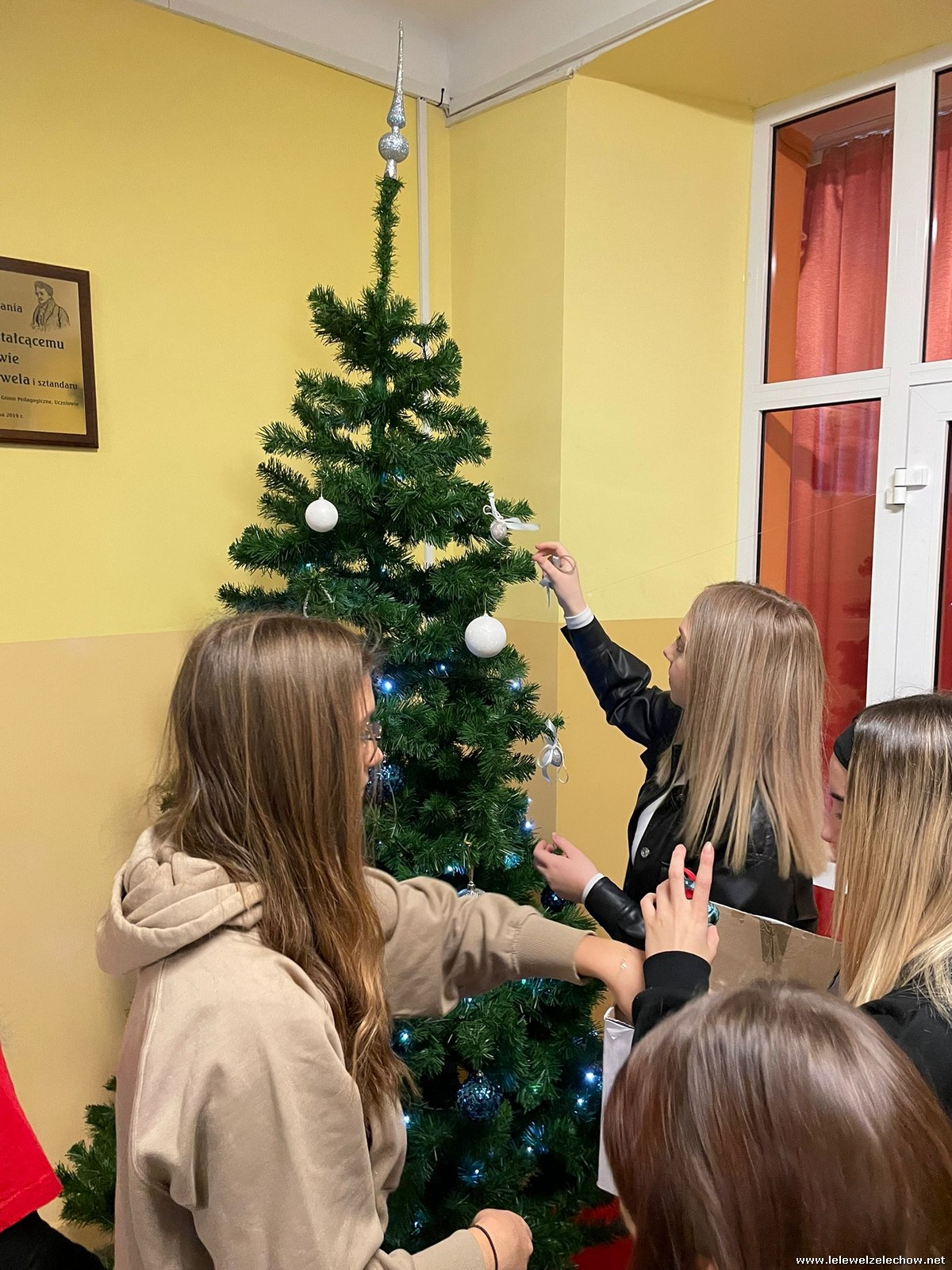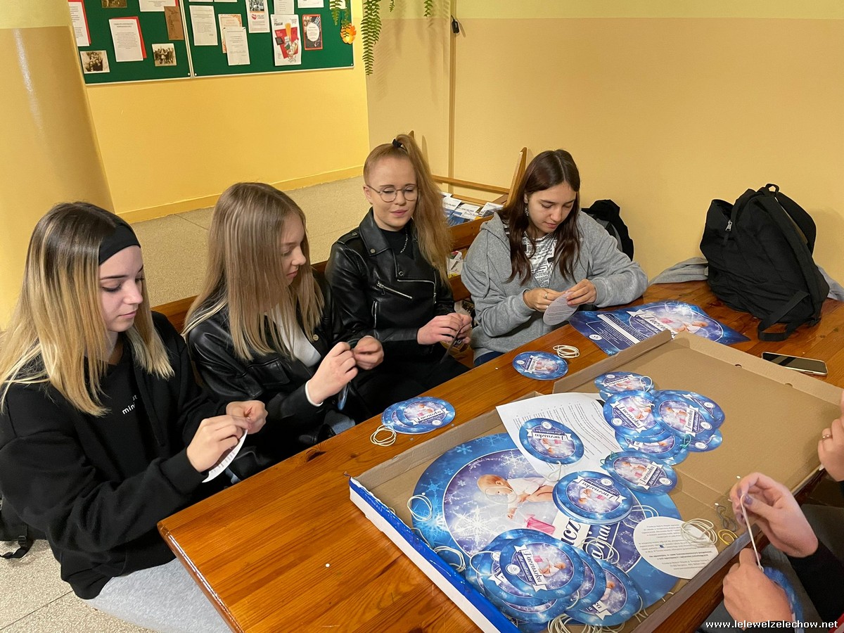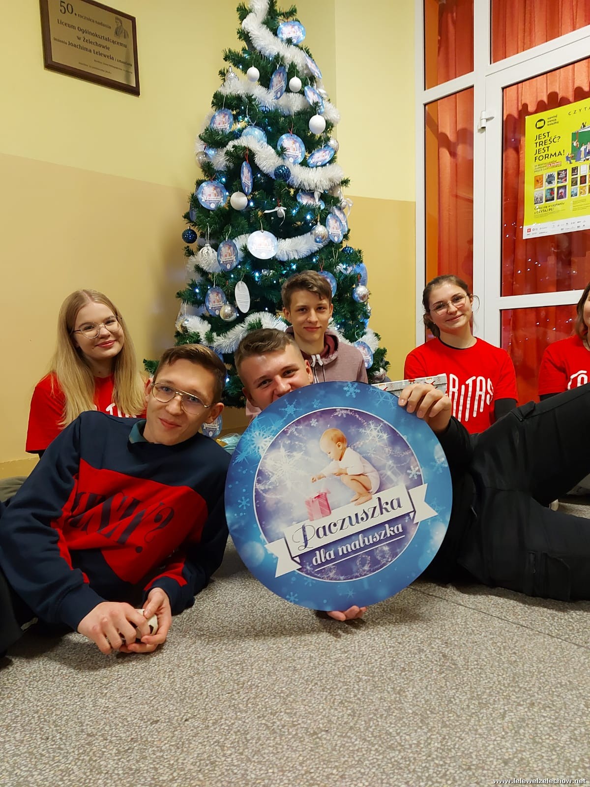Wolontariusze Szkolnego Koła Caritas z księdzem Mariuszem oraz Samorządem Szkolnym ubrali choinkę, na której zawisły specjalne paczuszkowe bombki.