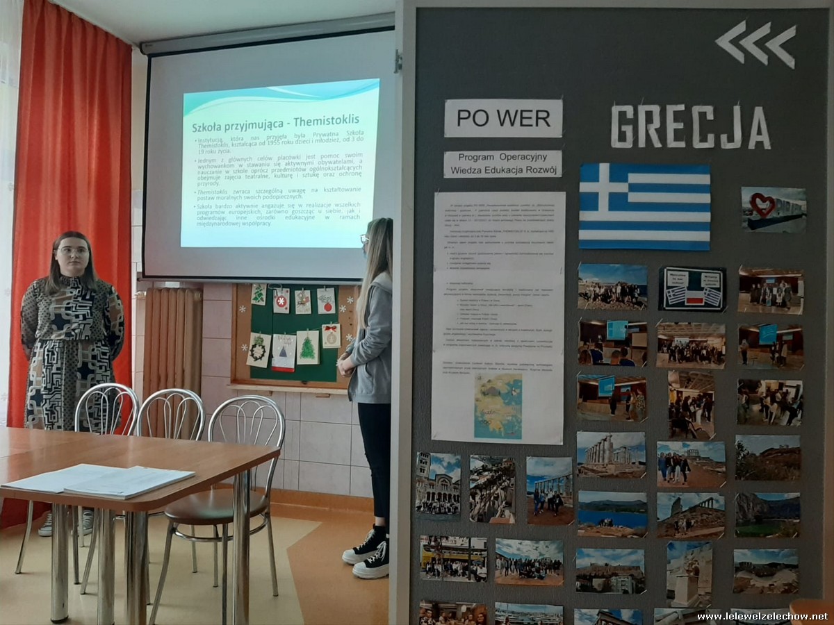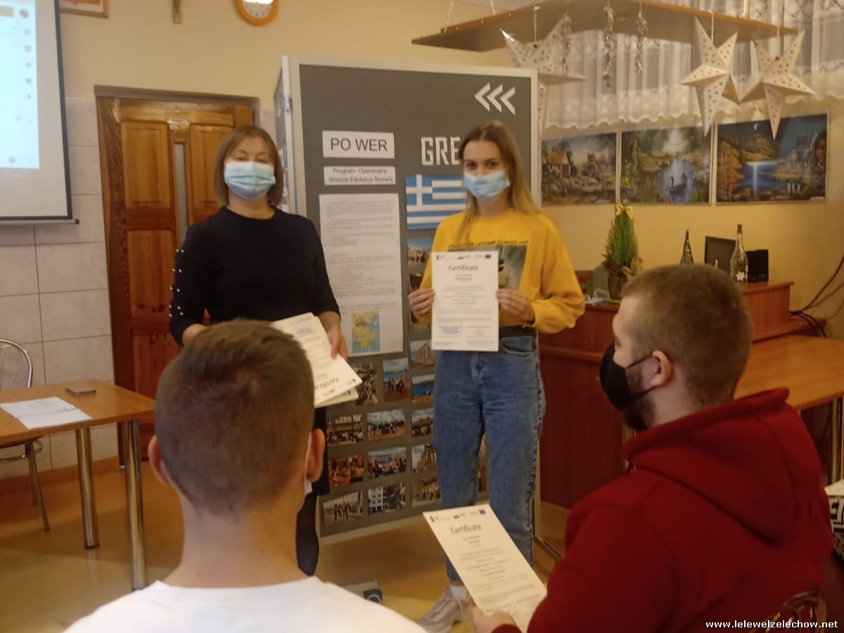 Pani Urszula Kobielu w imieniu Starosty Powiatu Garwolińskiego podziękowała pani Dyrektor, opiekunom oraz młodzieży za realizację tego projektu. Wyraziła zadowolenie z wybranego kierunku mobilności zagranicznej - podczas wyjazdu uczniowie odwiedzili Grecję – gdzie mogli obcować z wielowiekową historią i kulturą - kolebką naszej europejskiej cywilizacji. Wspólnie z panią Dyrektor wręczyła uczestnikom certyfikaty potwierdzające wspólne realizacje zadań z rówieśnikami ze szkoły partnerskiej. Młodzież uzyskała również certyfikaty z realizacji przygotowania pedagogiczno – kulturowo – językowego oraz dokumenty Europass Mobilność.