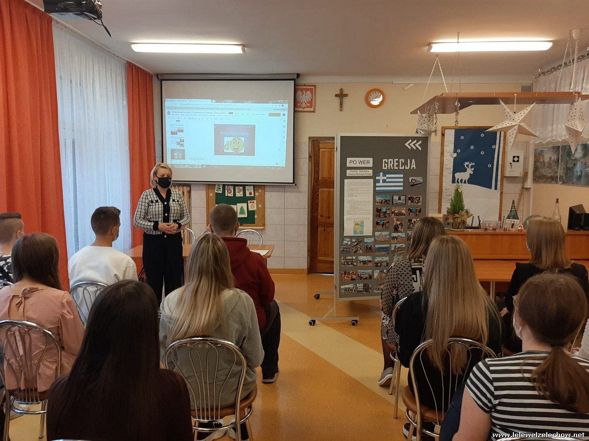Pani Dyrektor przedstawiła cele i etapy realizacji projektu. Podziękowała koordynatorce, opiekunom i uczniom za to, iż dzięki ich zaangażowaniu kolejny projekt w szkole udało się w pełni zrealizować. Uczniowie przedstawili prezentację podsumowującą wyjazd, podzielili się swoimi wrażeniami, zwracając uwagę na korzyści wyniesione z uczestnictwa w programie. Przedstawili też efekty udziału w projekcje w postaci wystawy plakatów i fotografii.