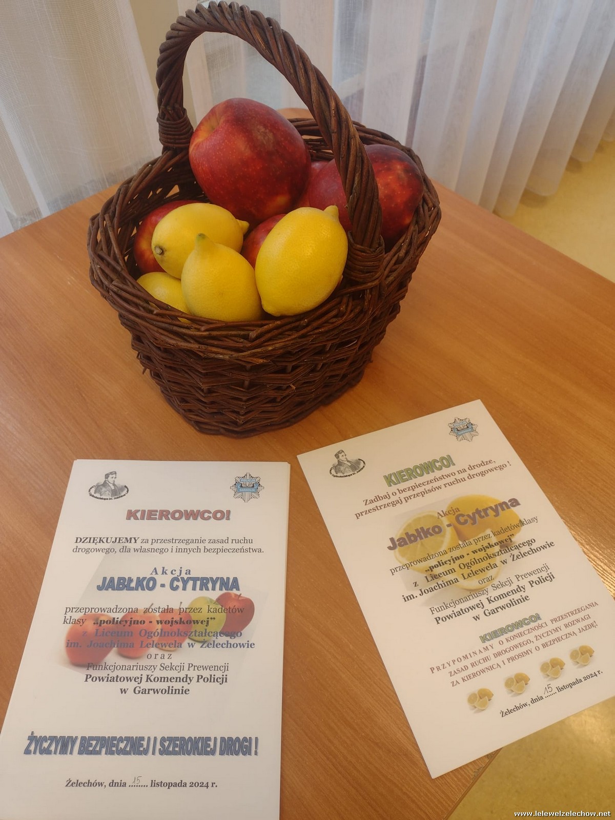 15 listopada kadeci klas mundurowych naszej szkoły uczestniczyli w akcji Jabłko - Cytryna. Działania prewencyjne były prowadzone wspólnie z funkcjonariuszami Posterunku Policji w Żelechowie. Akcja była ukierunkowana na pokaz prawidłowego zachowania się służb mundurowych w trakcie kontroli drogowej oraz zachowania się kierujących pojazdami. Za prawidłowe postępowanie zgodne z zasadami ruchu drogowego, kierujących nagradzano dyplomem i wręczano jabłko. Upomnienie i cytrynę dostawali kierowcy, którzy naruszyli przepisy ruchu drogowego. Cel akcji został osiągnięty.