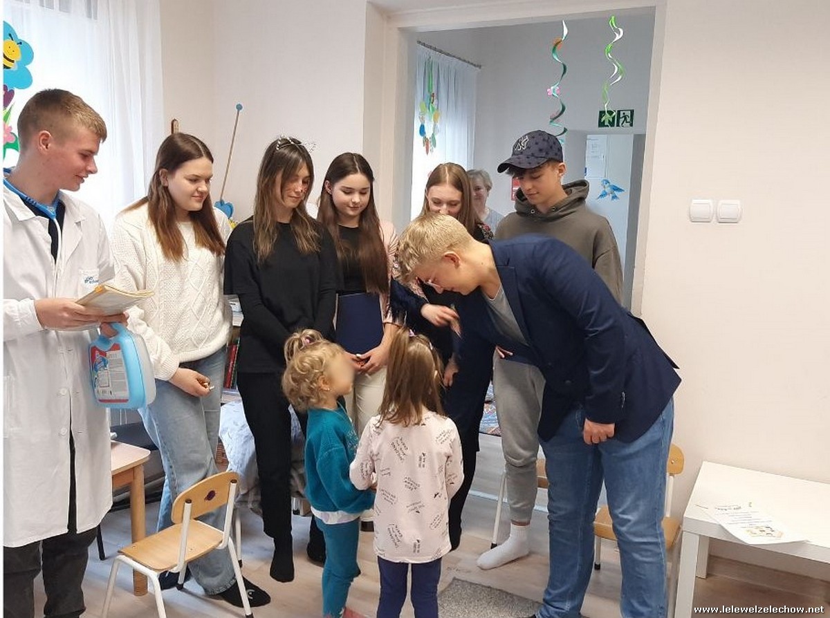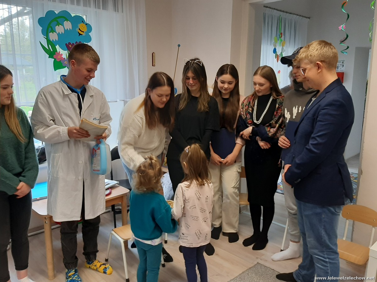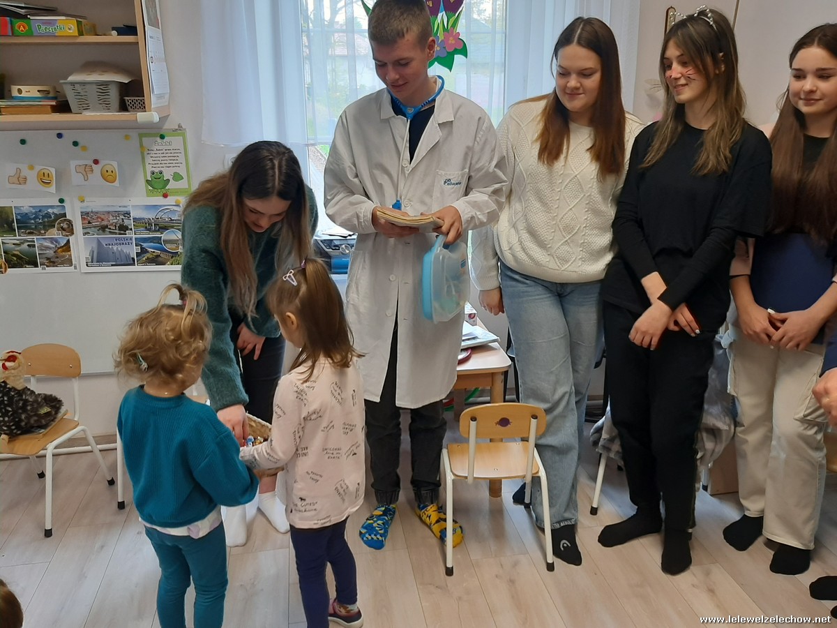 Nieco ucharakteryzowani i zaopatrzeni w odpowiednie gadżety licealiści pod opieką p. Magdaleny Woźniak zaprezentowali maluszkom następujące wiersze polskich poetów: „Chory kotek” Stanisława Jachowicza, „Naprawimy misia” Czesława Janczarskiego oraz „W aeroplanie”, „O Grzesiu kłamczuchu i jego cioci”, „Okulary” „Spóźniony słowik” Juliana Tuwima. Trzylatki słuchały i obserwowały nas z niezwykłą uwagą. Mamy nadzieję, że nasze interpretacje podobały się przedszkolakom. Na zakończenie spotkania wymieniliśmy się drobnymi upominkami. Dziękujemy „Żabkom” i pani Anecie Szczęsnej z Publicznego Przedszkola „Pluszowy Miś” za zaproszenie do wspólnego czytania.