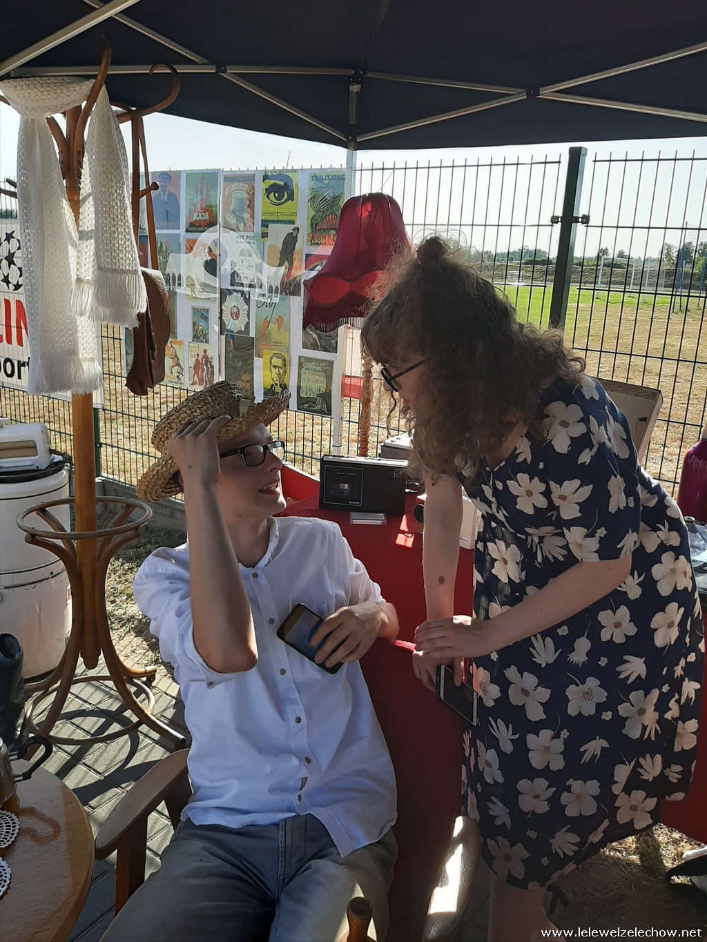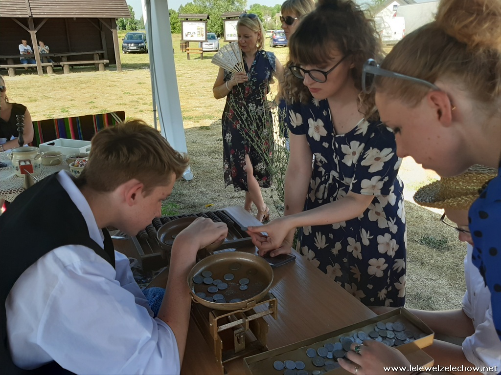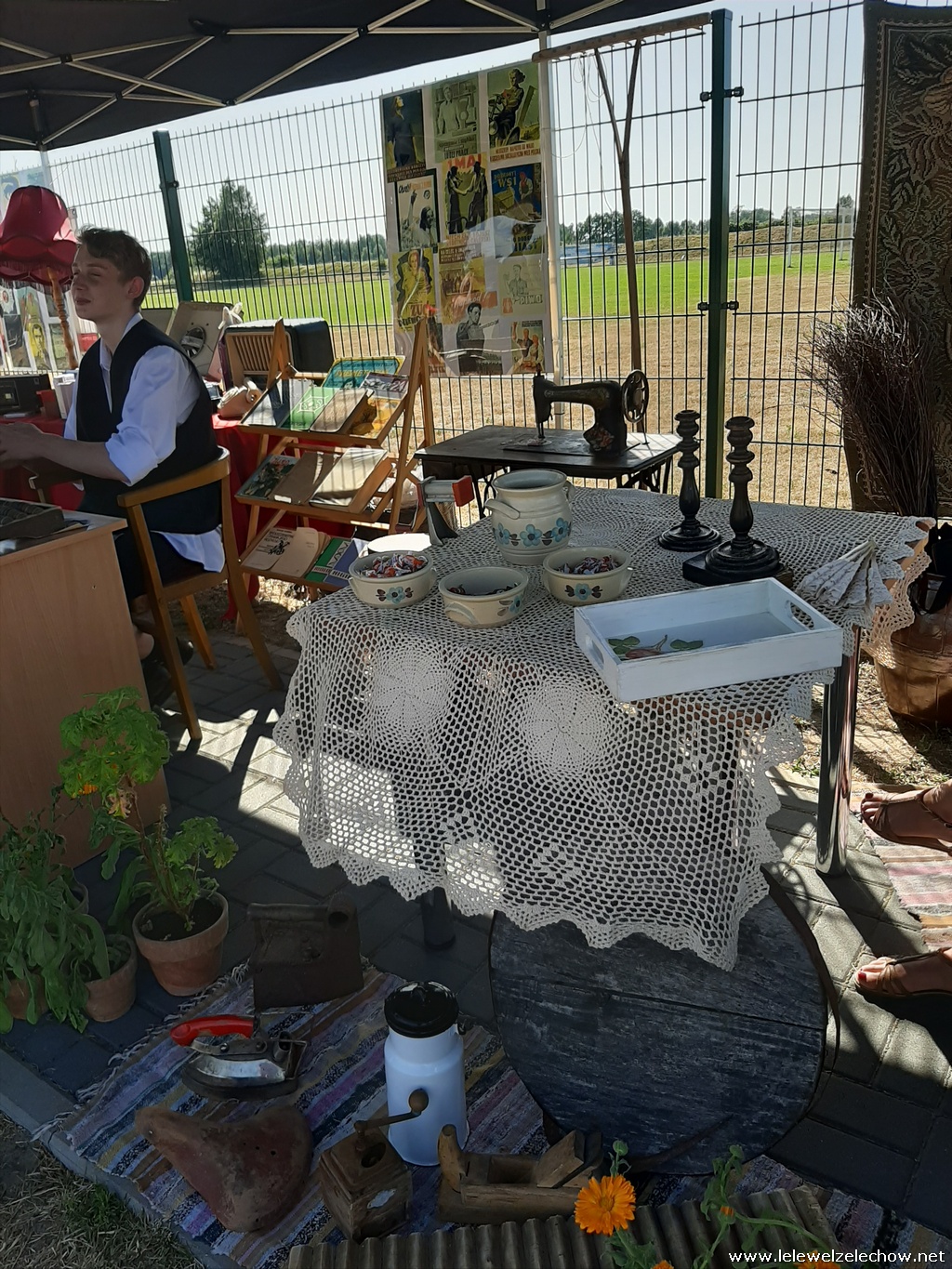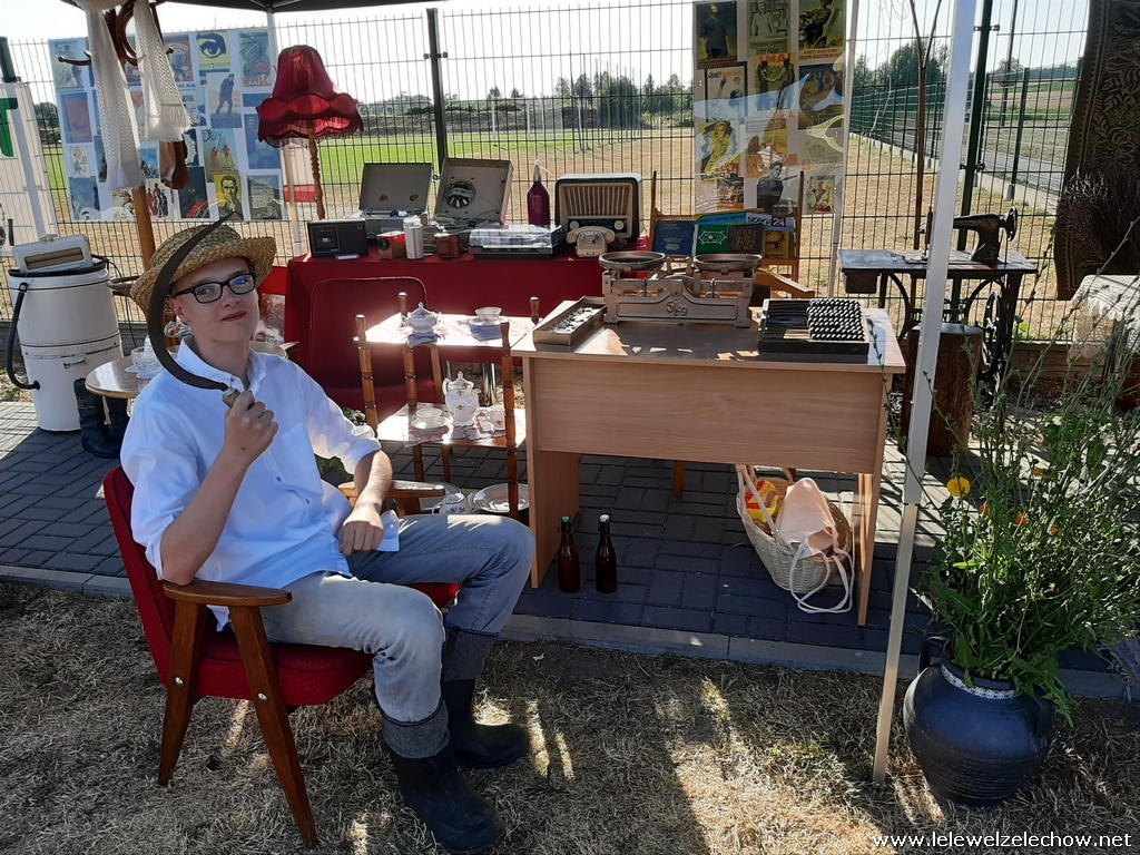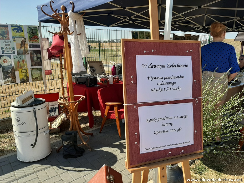 Dni Żelechowa i nasza wystawa przedmiotów codziennego użytku z XX w. Wśród nich znalazła się maszyna do szycia ,,Singer" (?), pralka ,,Frania", płyty analogowe, kasety magnetofonowe, stare monety, telefon, liczydła i wiele, wiele innych. Wystawę podzieliliśmy na część wiejską, część miejską i część handlową. Każdy z uczniów dopasował się strojem do danej strefy. Mimo upału dzielnie stali na swoich stanowiskach sami również się bawiąc. Wystawa cieszyła się zainteresowanie dorosłych i dzieci. Wśród odwiedzających znalazł się także Burmistrz Żelechowa Łukasz Bogusz oraz ...pani Halina Frąckowiak, która została obdarowana przez nas jednym z eksponatów, który sobie wypatrzyła.