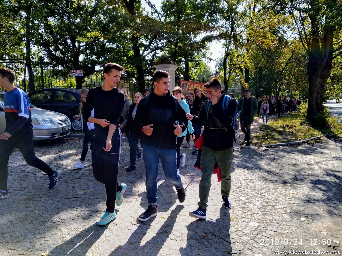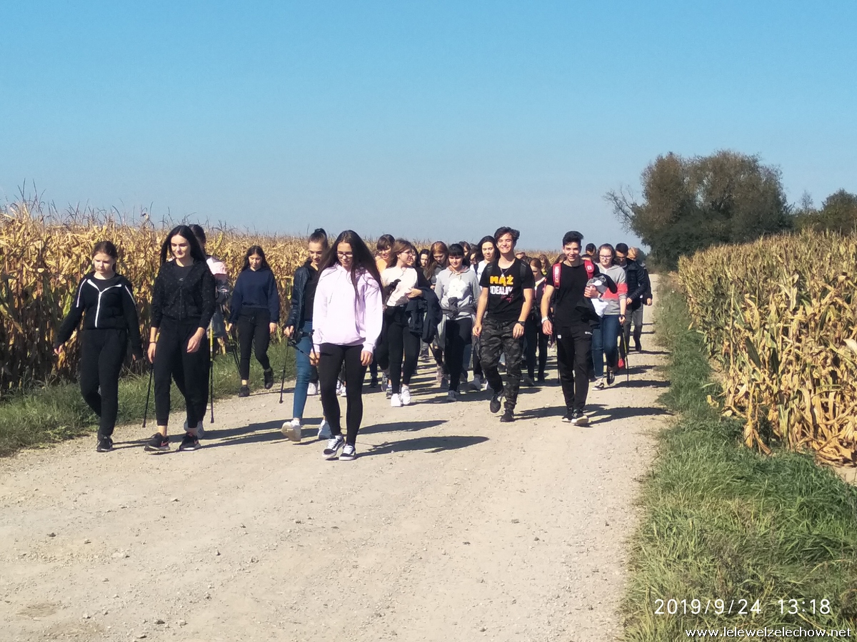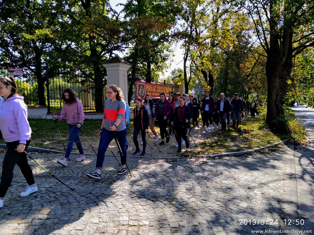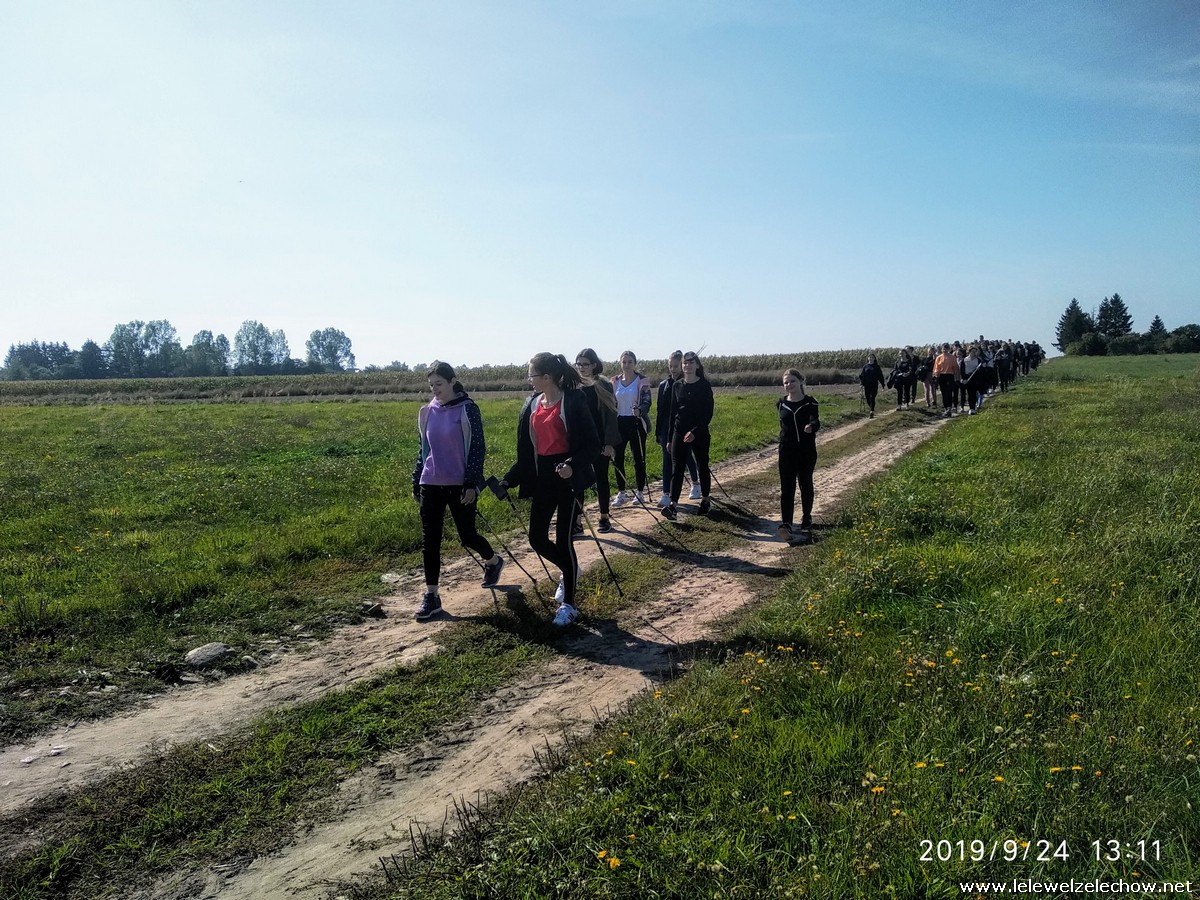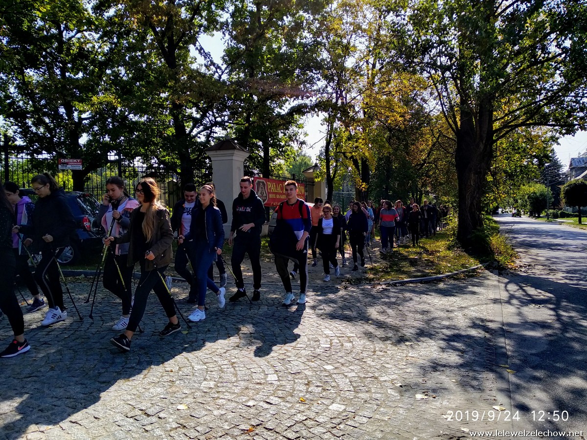 Marsz nordic walking, w trasę którego wyrusza ponad połowa szkoły. Ok. 100 uczniów pod opieką nauczycieli: Joanny Włodarczyk, Anetty Dziak, Joanny Baranieckiej, Andrzeja Głodka i ks. Leszka Mućki przemierza dystans 5 km. Kto nie miał kijów do nordic walkingu oczywiście mógł iść bez nich.