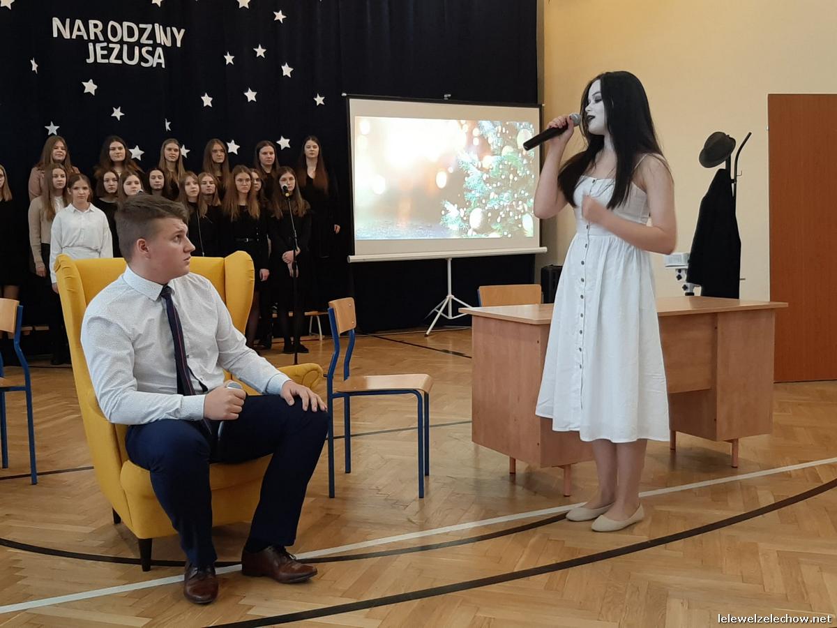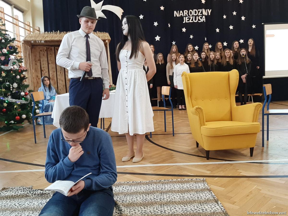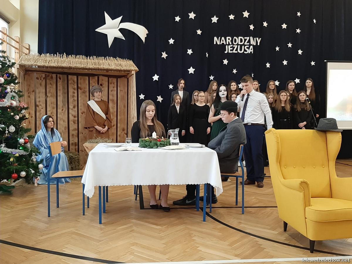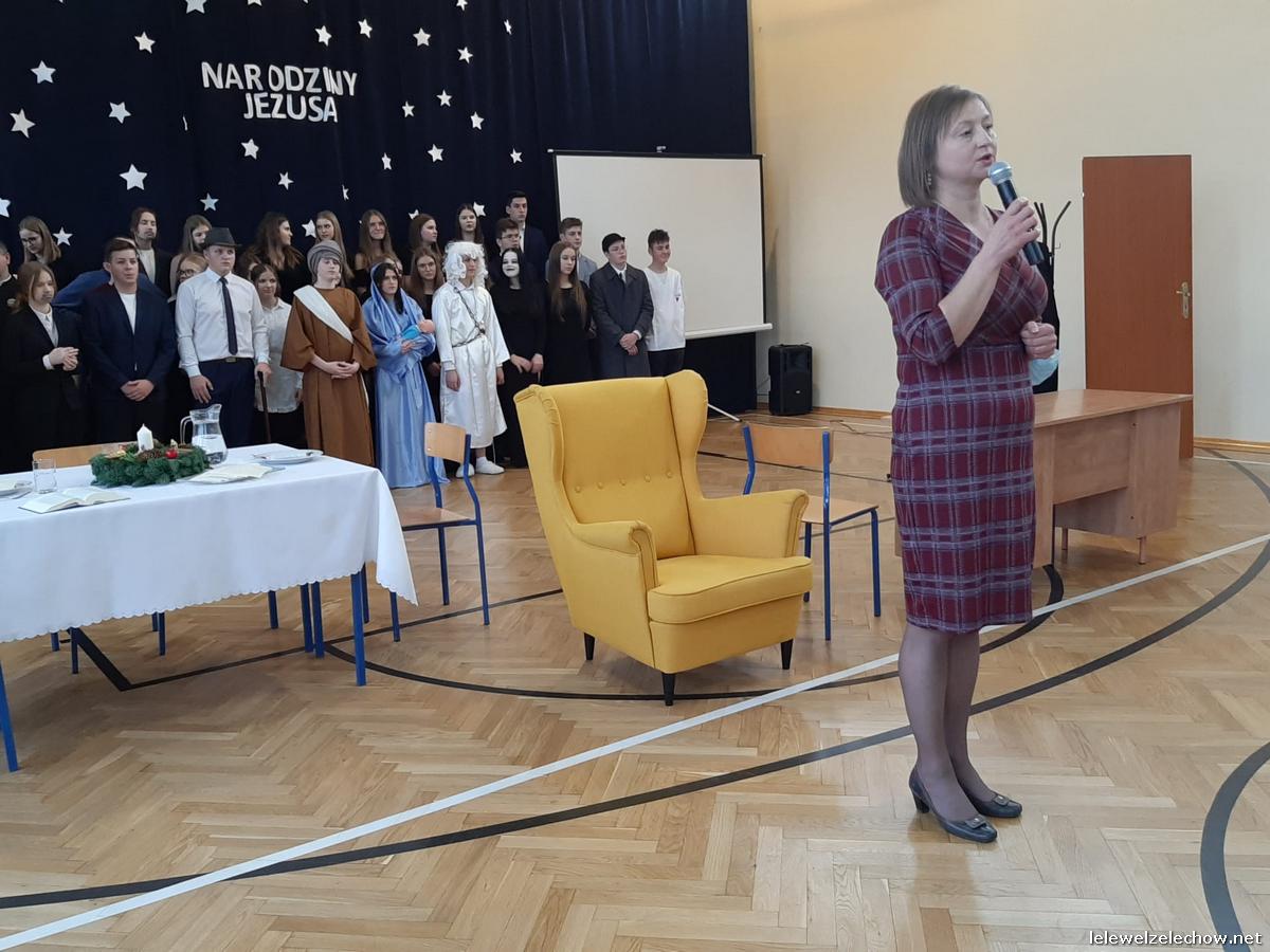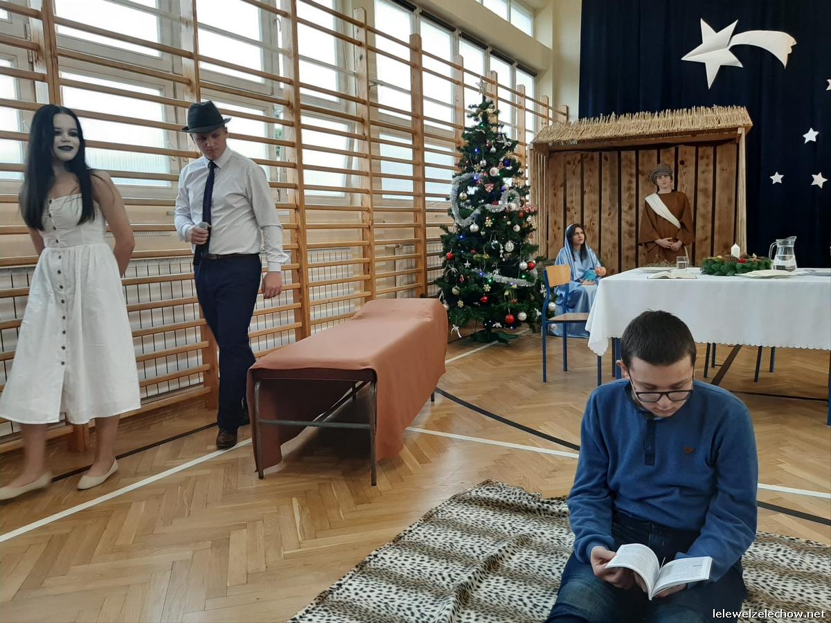 Przedstawienie dopełniały kolędy w niezwykłym wykonaniu Chóru Szkolnego oraz solistki Natalii Krawczyk. Zarówno pełne zaangażowania dialogi jak i przygotowana scenografia "wskazywały nam na to, co rzeczywiście jest najważniejsze w okresie świątecznym" jak powiedziała p. Dyrektor po przedstawieniu. Były również głębokie w swej treści życzenia dla uczniów, ich rodzin oraz pracowników szkoły od pani Dyrektor Sylwii Tomaszek oraz przewodniczącej Samorządu Uczniowskiego Patrycji Babiniec