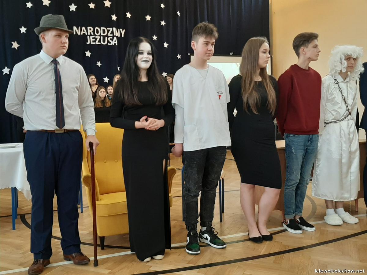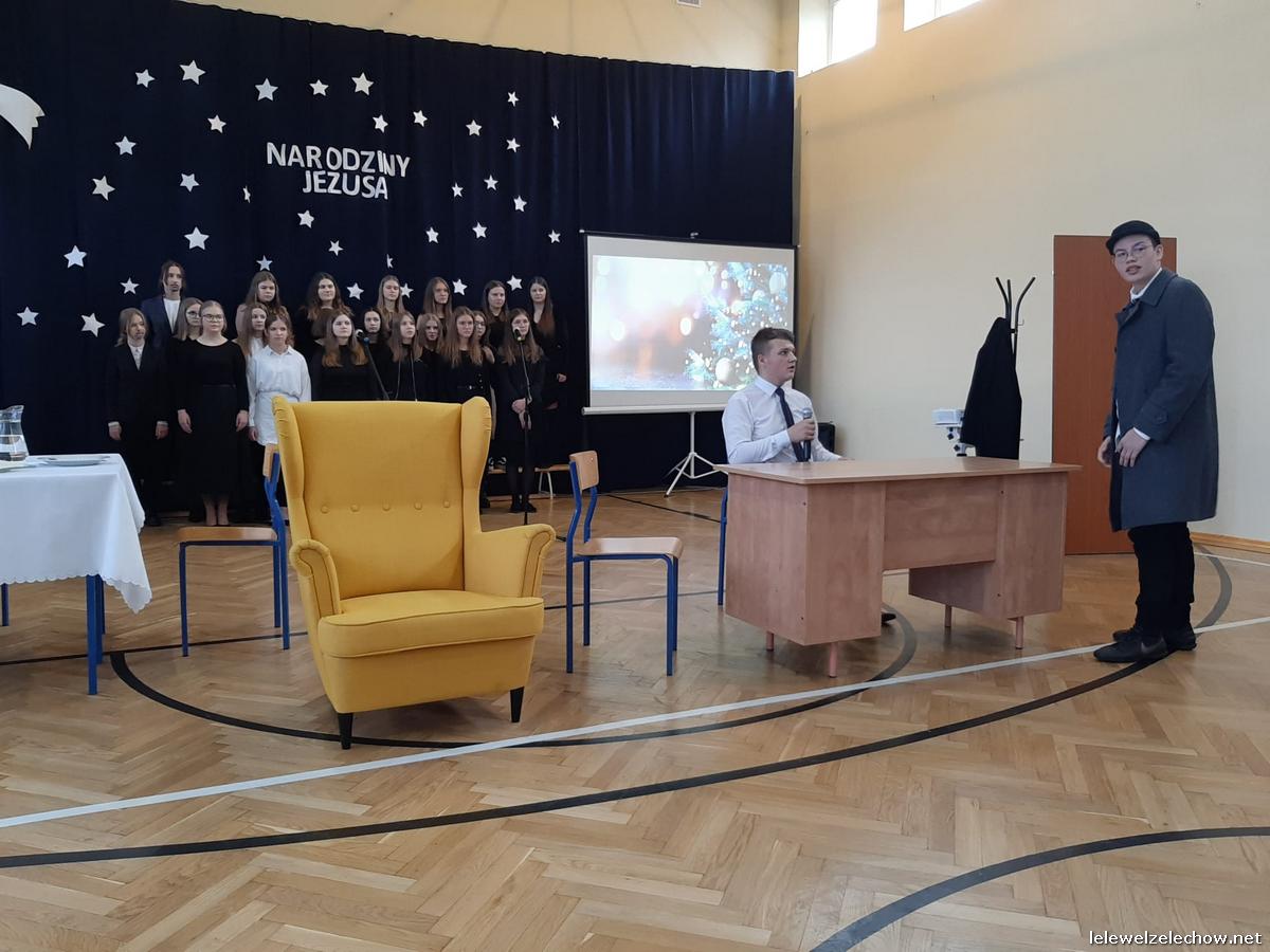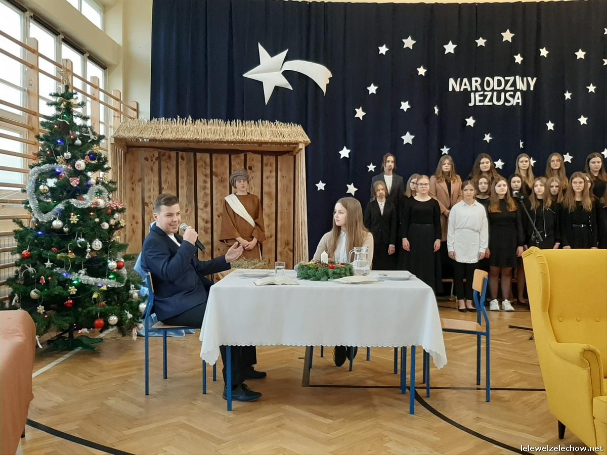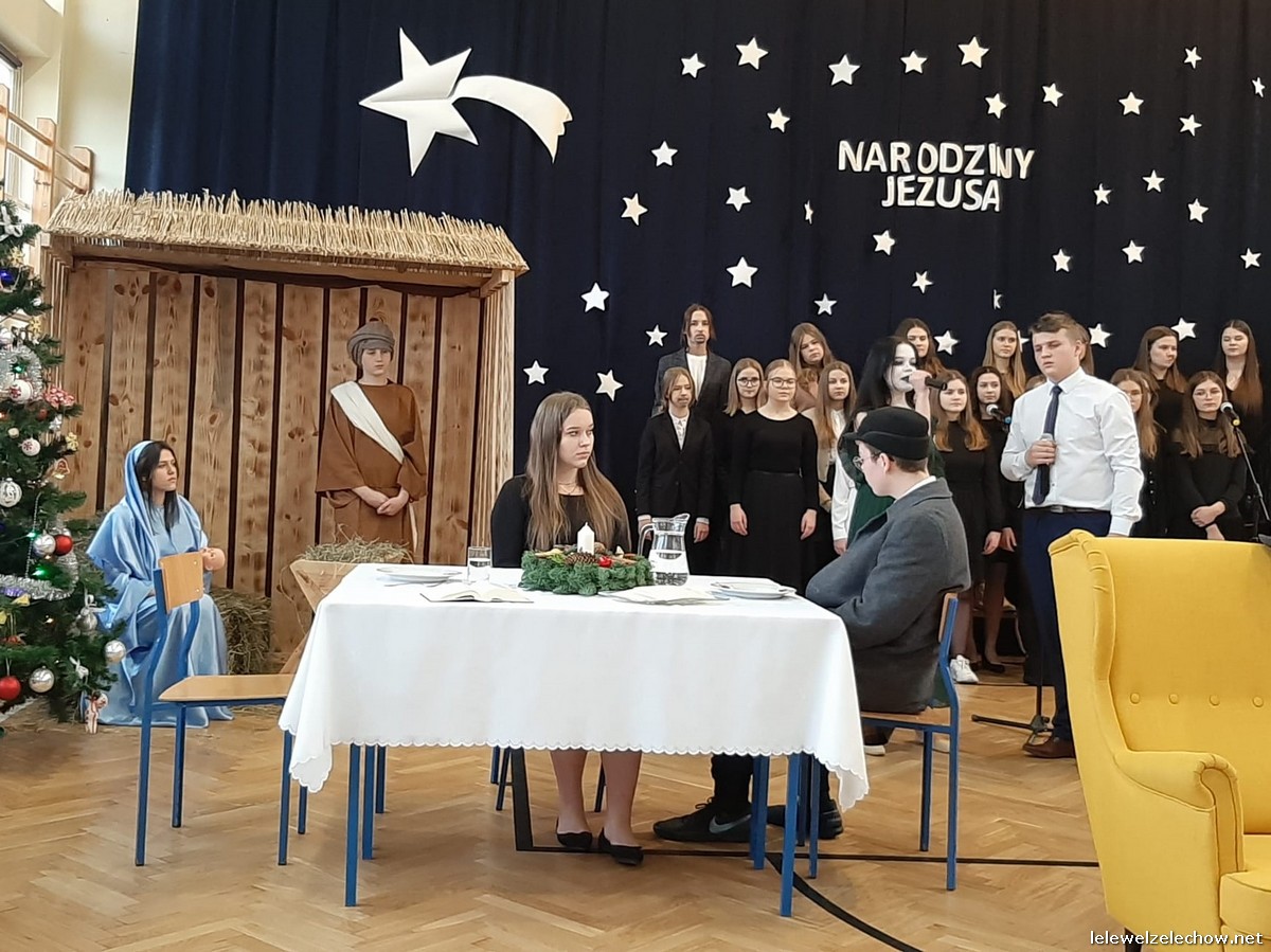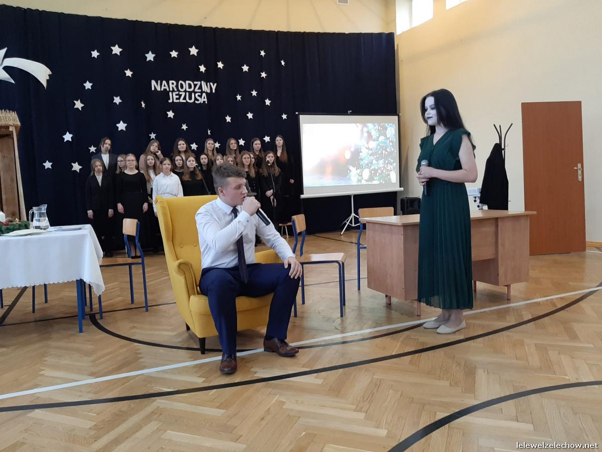 Przedstawienie dopełniały kolędy w niezwykłym wykonaniu Chóru Szkolnego oraz solistki Natalii Krawczyk. Zarówno pełne zaangażowania dialogi jak i przygotowana scenografia "wskazywały nam na to, co rzeczywiście jest najważniejsze w okresie świątecznym" jak powiedziała p. Dyrektor po przedstawieniu. Były również głębokie w swej treści życzenia dla uczniów, ich rodzin oraz pracowników szkoły od pani Dyrektor Sylwii Tomaszek oraz przewodniczącej Samorządu Uczniowskiego Patrycji Babiniec