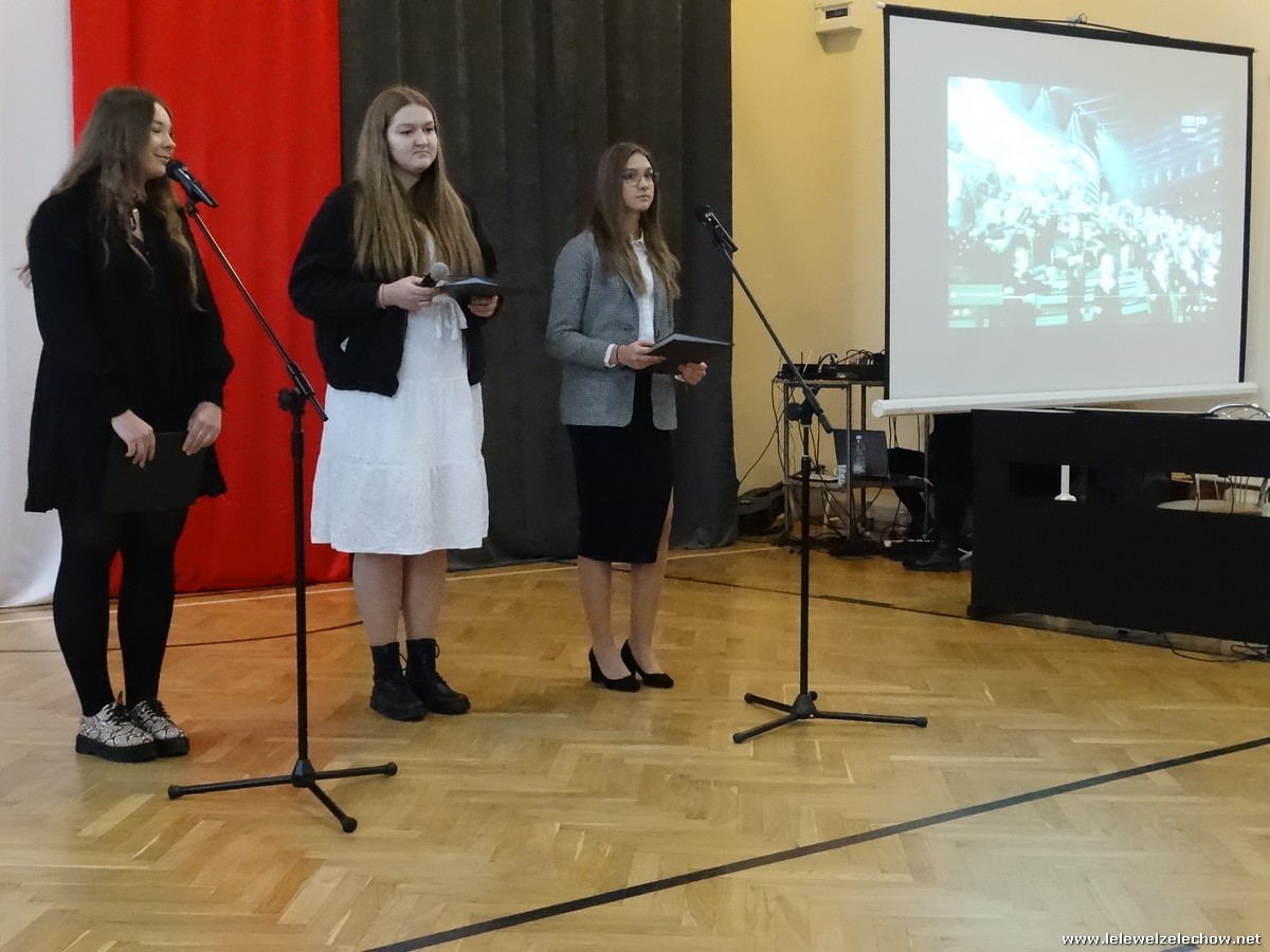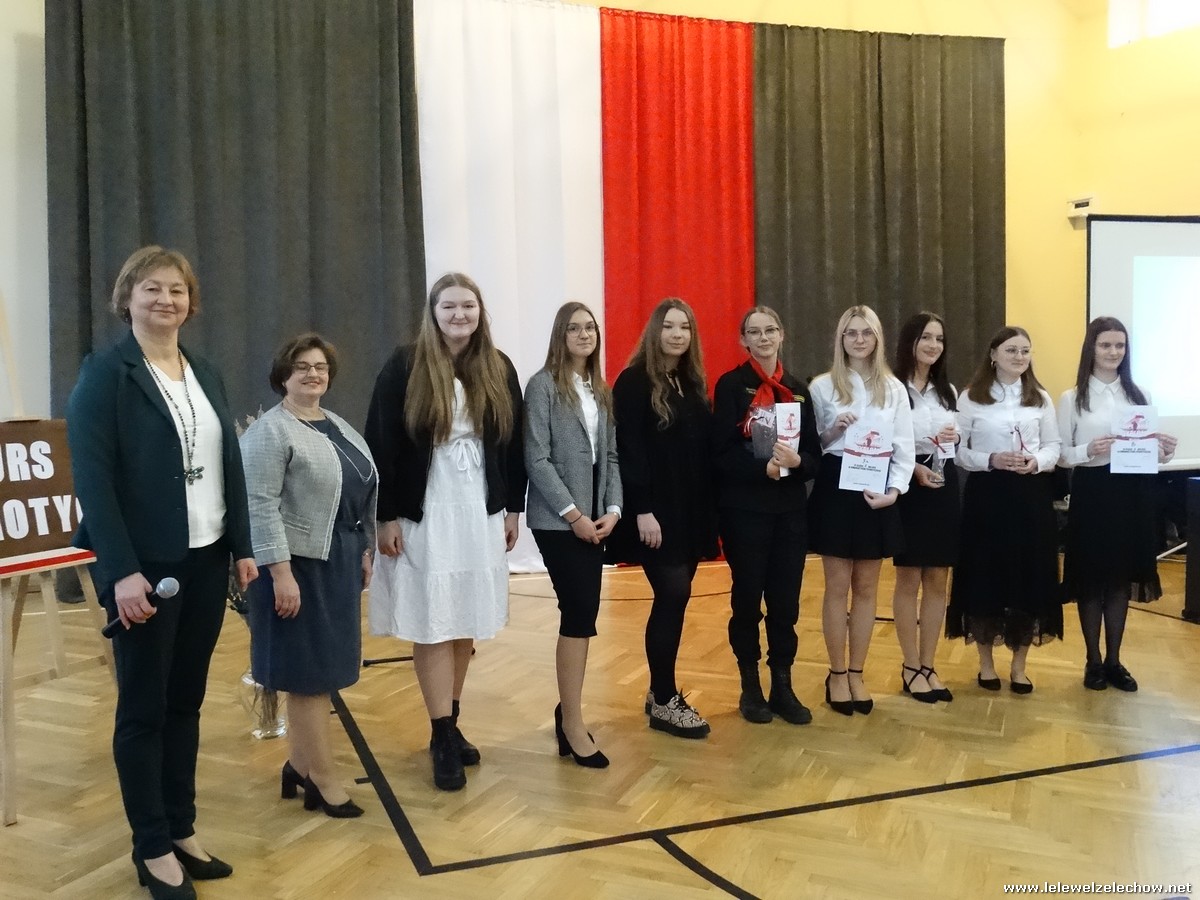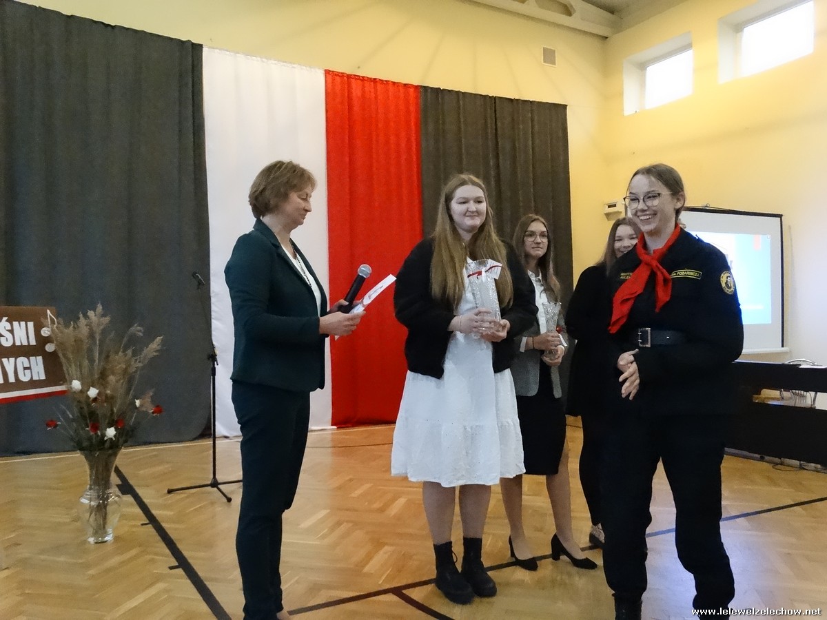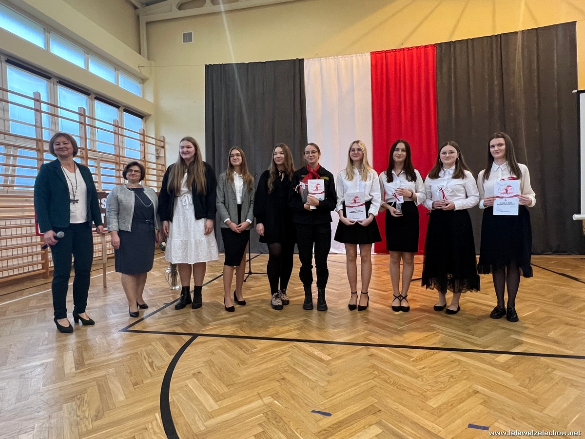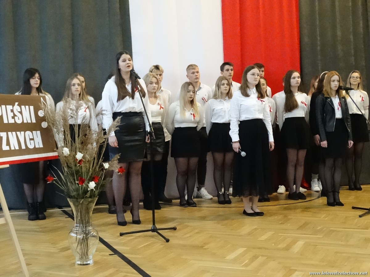 Konkurs Pieśni Patriotycznych to wieloletnia tradycja naszej szkoły. Jest nawet starszy od Święta Szkoły, bo odnotowano tego typu konkurs już w roku 1980! Po krótkiej przerwie został przywrócony przez Samorząd Uczniowski i od tej pory jest przez niego organizowany. Podobnie było w tym roku. Nad sprawnym przebiegiem i organizacją całości wydarzenia czuwały Patrycja, Oliwia D. i Oliwia J. przy nieocenionym wsparciu chłopców z 3b zajmujących się nagłośnieniem.