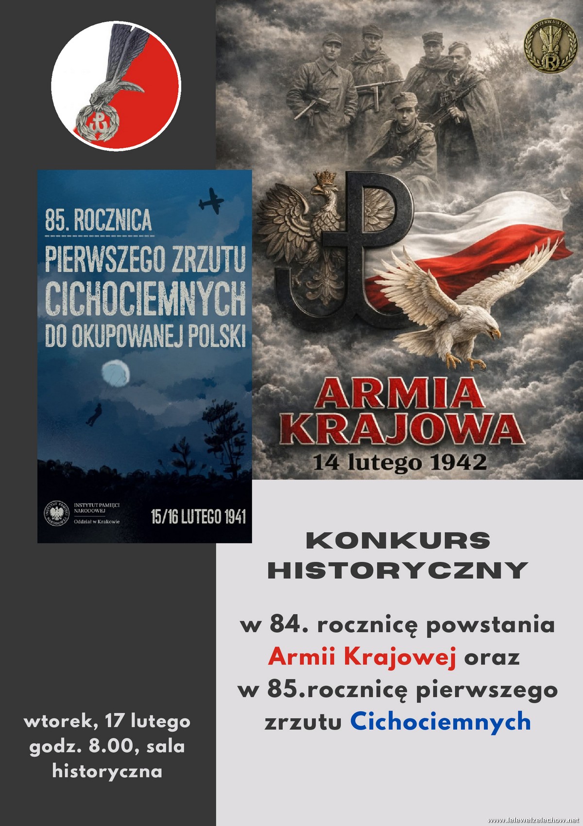W ostatnim czasie w naszej szkole odbyły się dwa konkursy historyczne. Pierwszy z okazji 84.rocznicy powstania Armii Krajowej oraz 85.rocznicy pierwszego zrzutu na teren okupowanego kraju Cichociemnych, drugi (plastyczny) z okazji Narodowego Dnia Pamięci Żołnierzy Wyklętych. W konkursach wzięli udział chętni uczniowie z wszystkich klas liceum. Oto wyniki pierwszego konkursu, konkursu wiedzy: