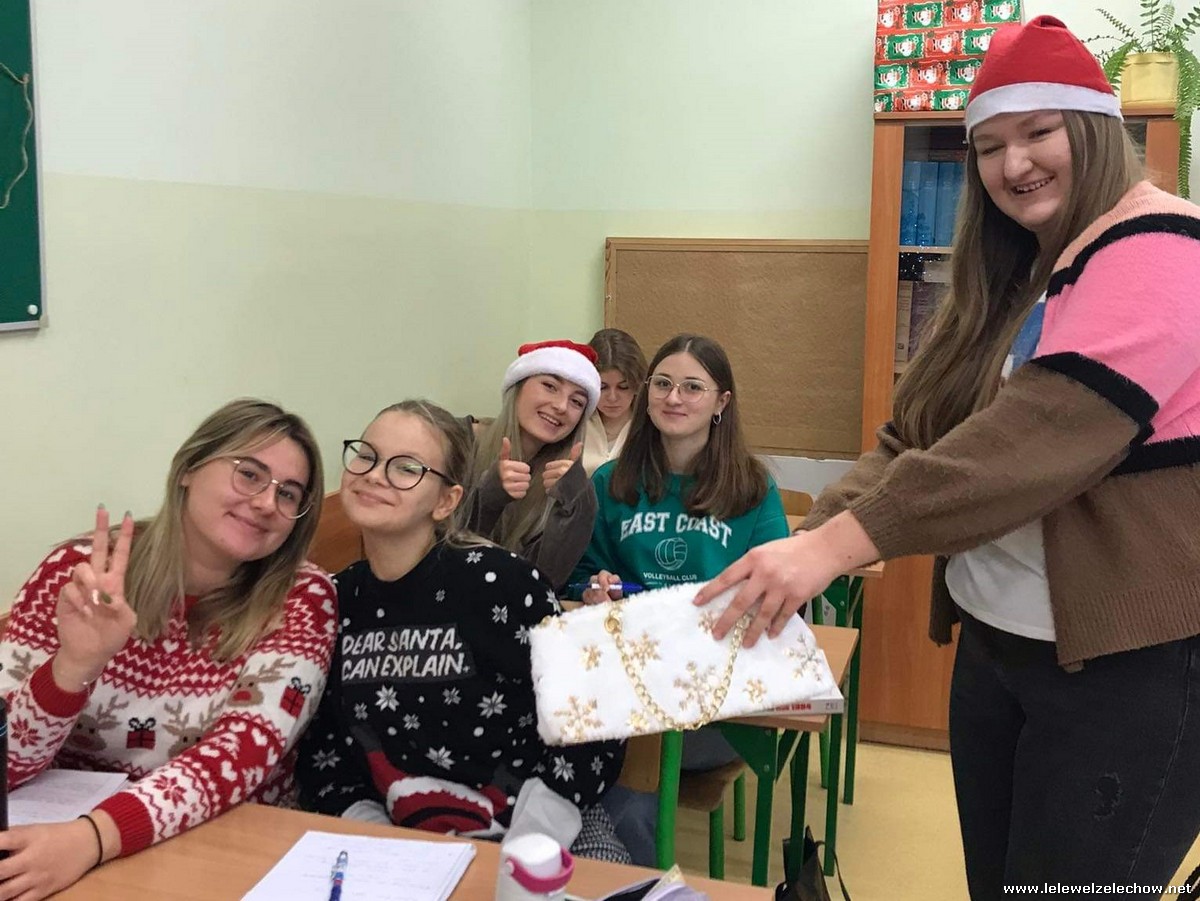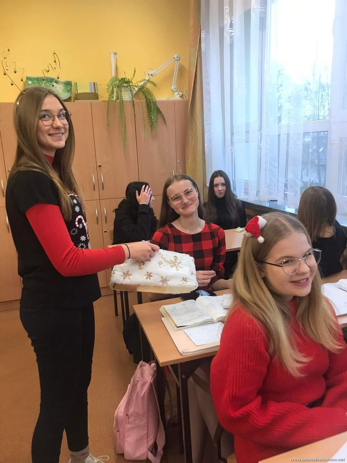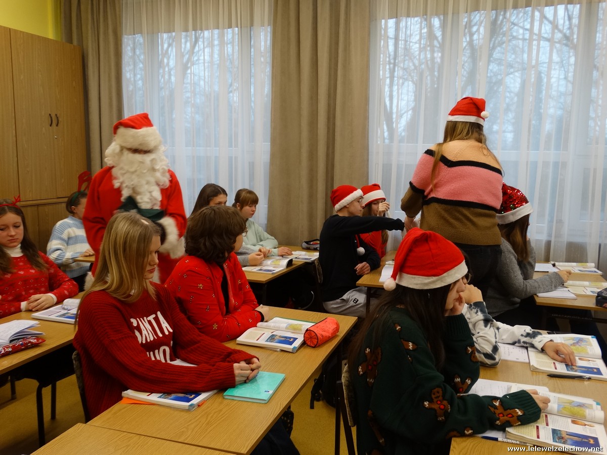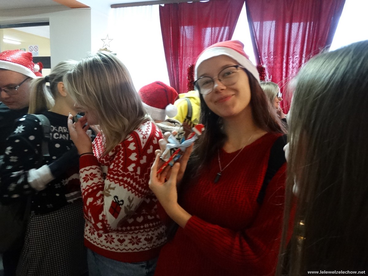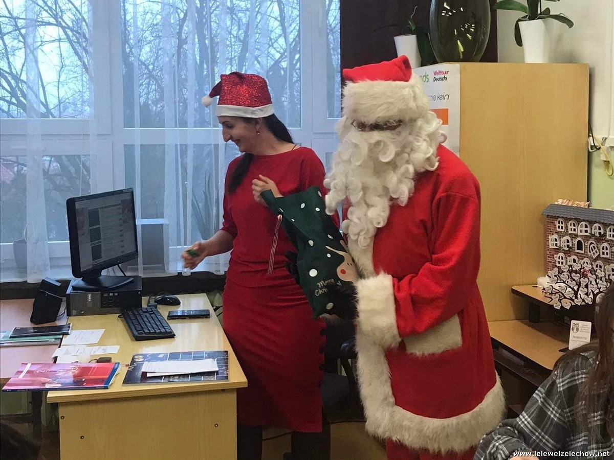 6 grudnia od rana zwyczajne lekcje - matematyki, historii czy języka niemieckiego…Tylko czerwone czapeczki z białymi pomponikami dominują nad zeszytami i książkami. Aż tu nagle! Puk! puk! Do klas przybywa Mikołaj, który wszystkie grzeczne dzieci, starsze i młodsze, obdarowuje cukierkami! Ale to nie koniec niespodzianek! Wszyscy, którzy założyli tego dnia mikołajkowe ubiory brali udział w loterii fantowej. Pieczołowicie zapakowane prezenciki wręczyli pomocnicy Mikołaja - Oliwia, Patrycja i Piotrek:) Radość i uśmiech zagościły na twarzach naszych uczniów!