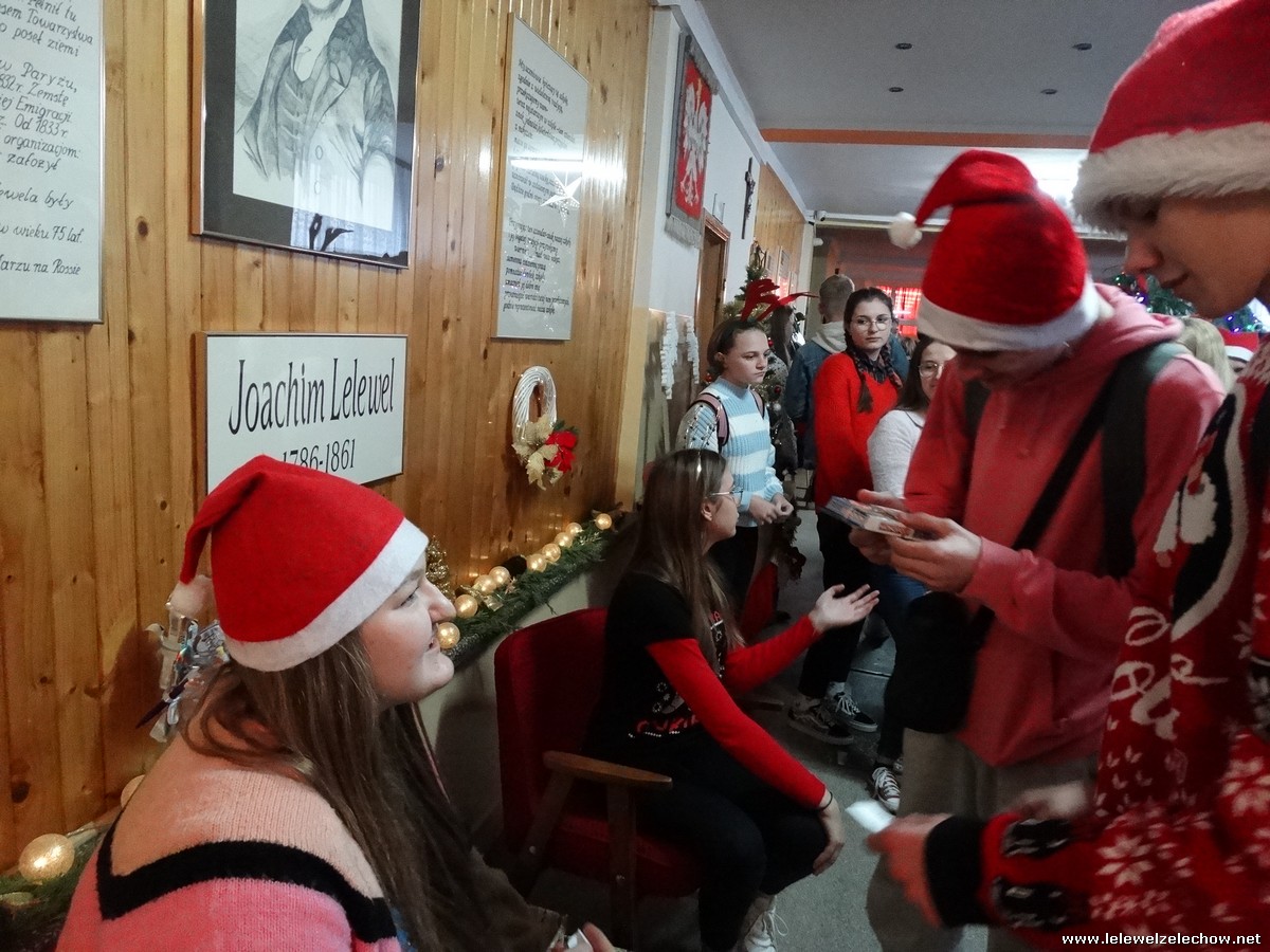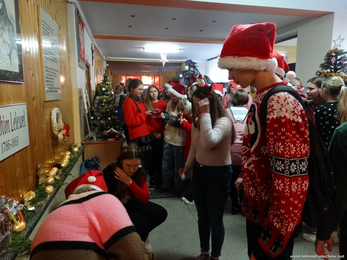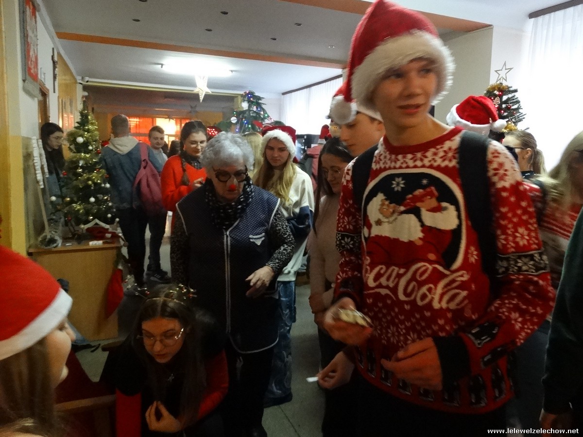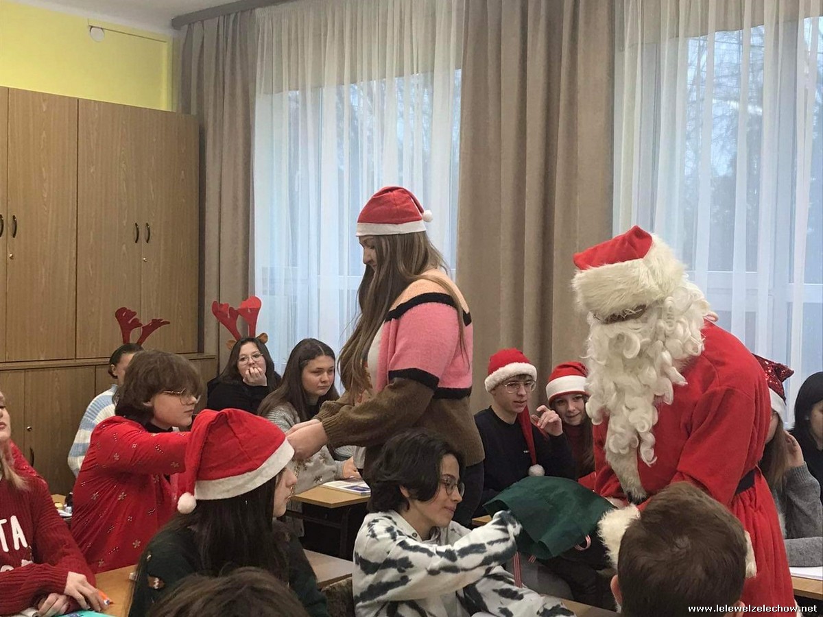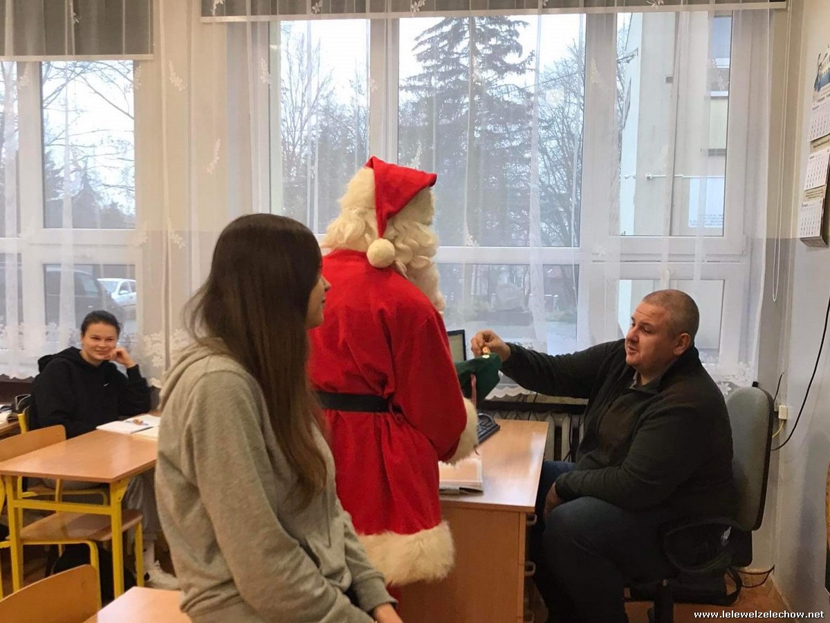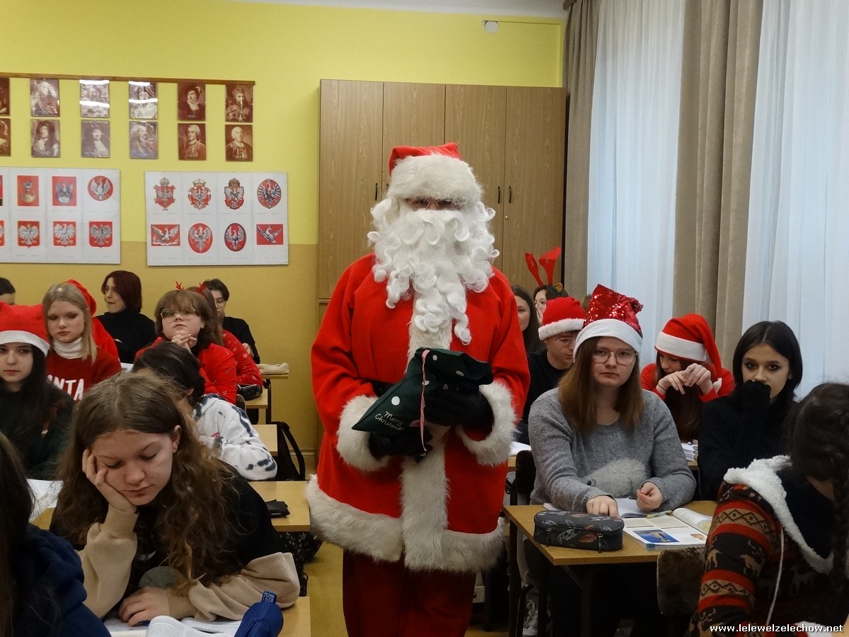 6 grudnia od rana zwyczajne lekcje - matematyki, historii czy języka niemieckiego…Tylko czerwone czapeczki z białymi pomponikami dominują nad zeszytami i książkami. Aż tu nagle! Puk! puk! Do klas przybywa Mikołaj, który wszystkie grzeczne dzieci, starsze i młodsze, obdarowuje cukierkami! Ale to nie koniec niespodzianek! Wszyscy, którzy założyli tego dnia mikołajkowe ubiory brali udział w loterii fantowej. Pieczołowicie zapakowane prezenciki wręczyli pomocnicy Mikołaja - Oliwia, Patrycja i Piotrek:) Radość i uśmiech zagościły na twarzach naszych uczniów!
