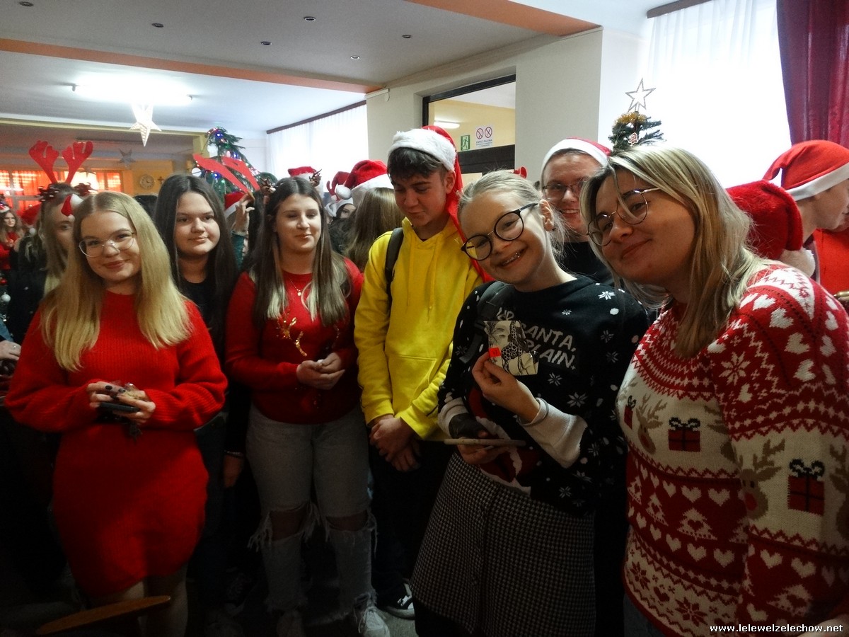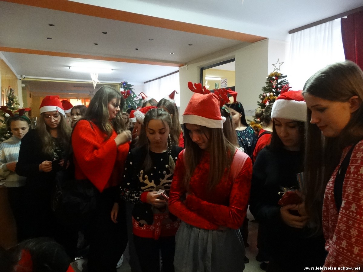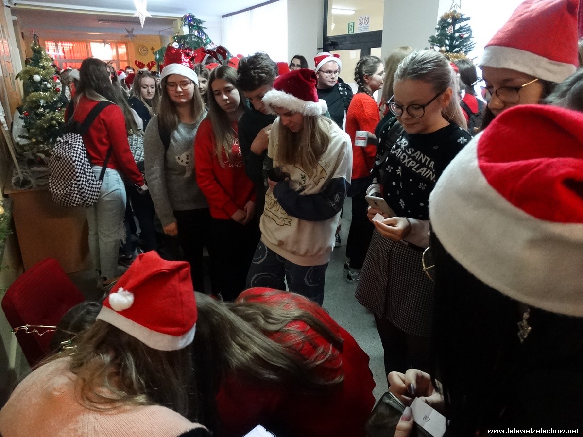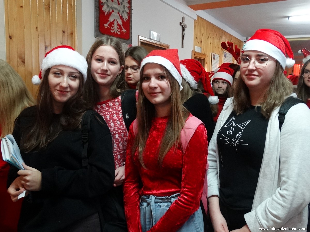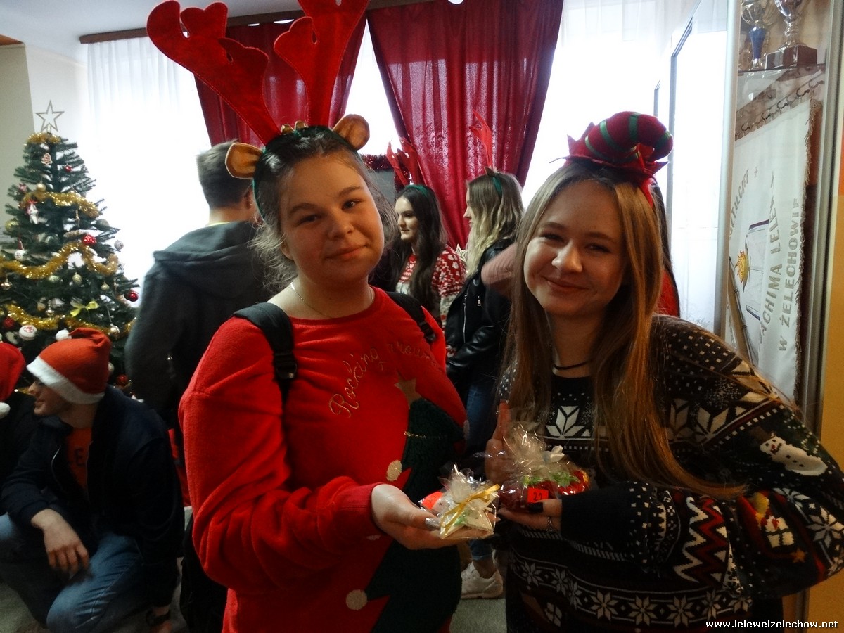 6 grudnia od rana zwyczajne lekcje - matematyki, historii czy języka niemieckiego…Tylko czerwone czapeczki z białymi pomponikami dominują nad zeszytami i książkami. Aż tu nagle! Puk! puk! Do klas przybywa Mikołaj, który wszystkie grzeczne dzieci, starsze i młodsze, obdarowuje cukierkami! Ale to nie koniec niespodzianek! Wszyscy, którzy założyli tego dnia mikołajkowe ubiory brali udział w loterii fantowej. Pieczołowicie zapakowane prezenciki wręczyli pomocnicy Mikołaja - Oliwia, Patrycja i Piotrek:) Radość i uśmiech zagościły na twarzach naszych uczniów!