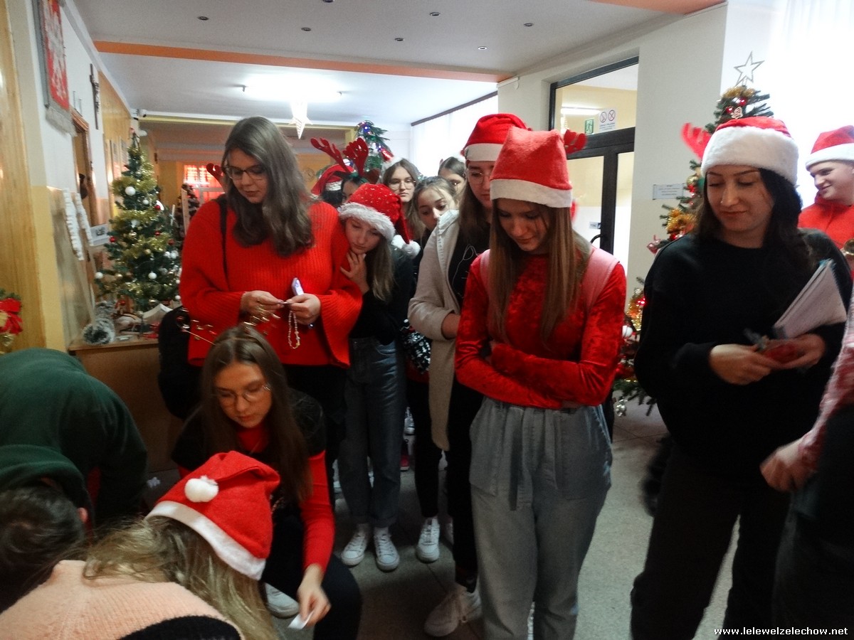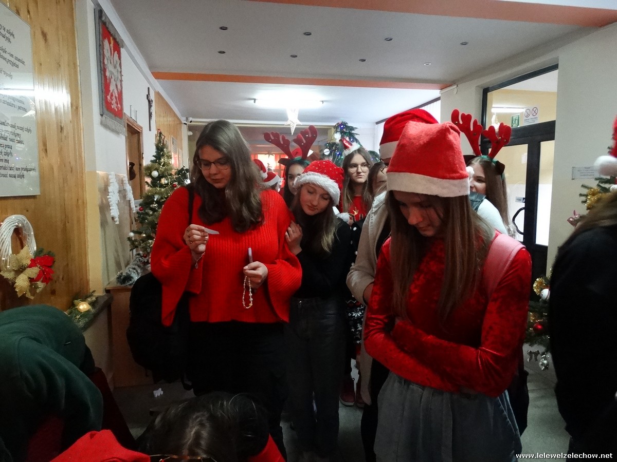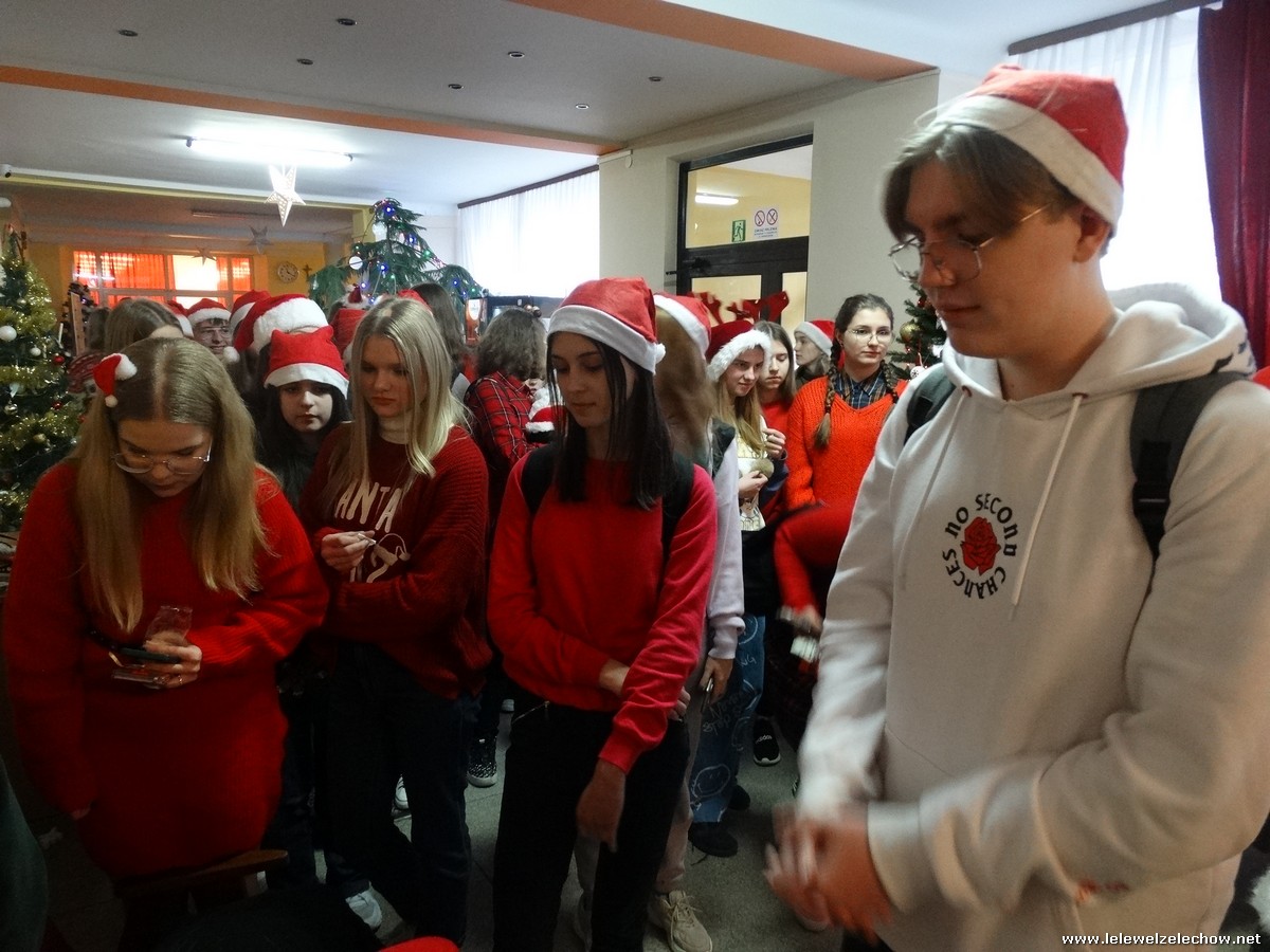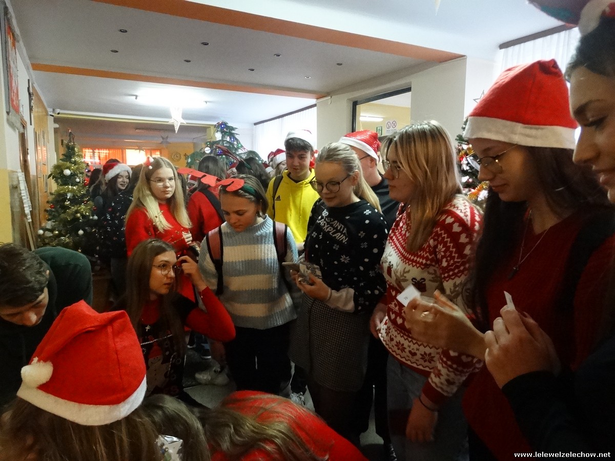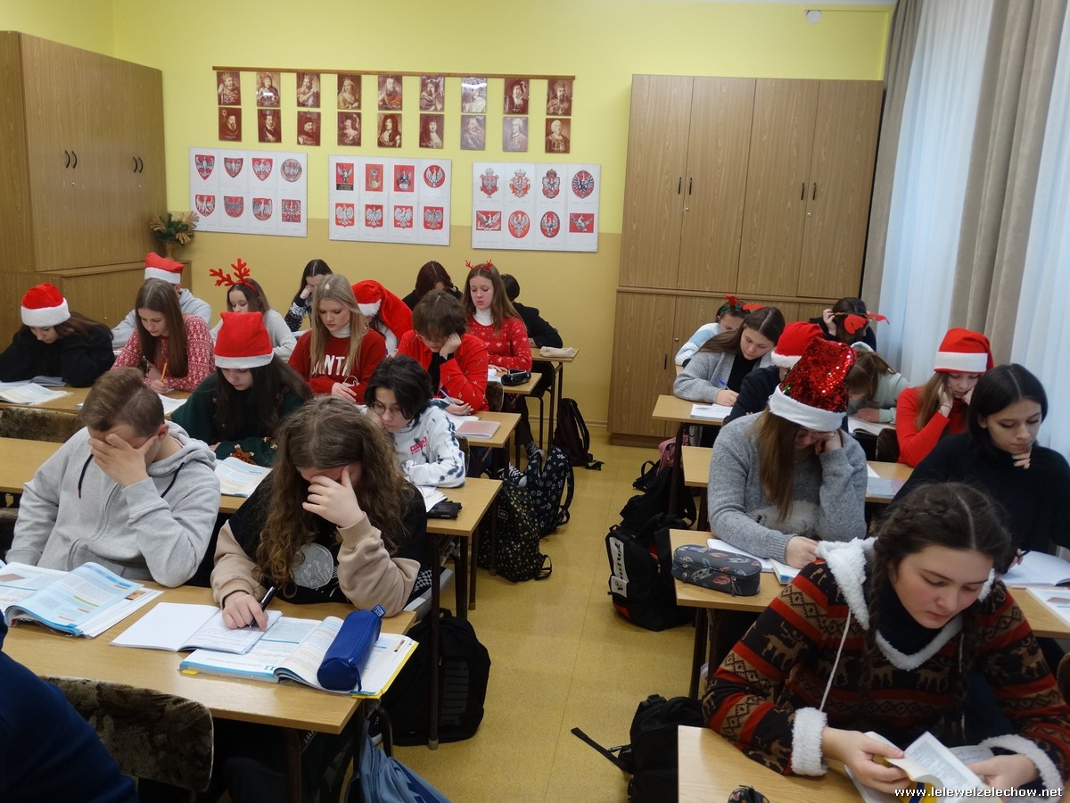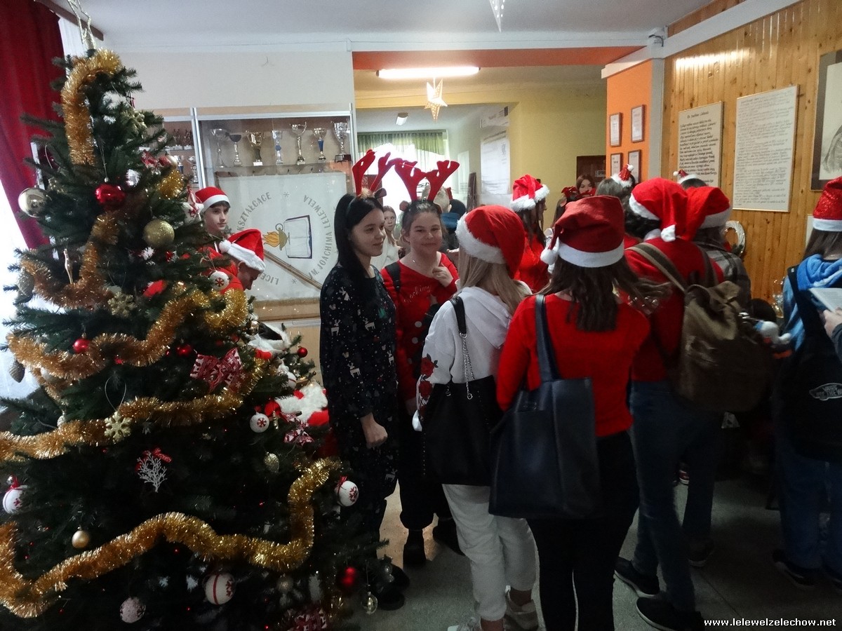 6 grudnia od rana zwyczajne lekcje - matematyki, historii czy języka niemieckiego…Tylko czerwone czapeczki z białymi pomponikami dominują nad zeszytami i książkami. Aż tu nagle! Puk! puk! Do klas przybywa Mikołaj, który wszystkie grzeczne dzieci, starsze i młodsze, obdarowuje cukierkami! Ale to nie koniec niespodzianek! Wszyscy, którzy założyli tego dnia mikołajkowe ubiory brali udział w loterii fantowej. Pieczołowicie zapakowane prezenciki wręczyli pomocnicy Mikołaja - Oliwia, Patrycja i Piotrek:) Radość i uśmiech zagościły na twarzach naszych uczniów!