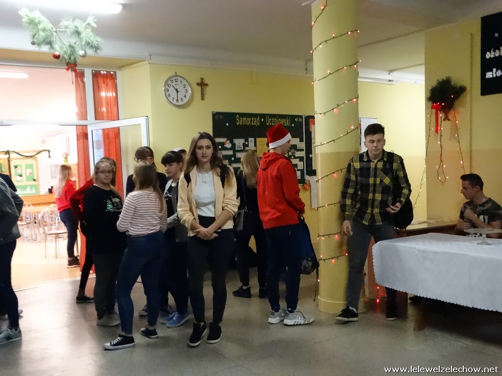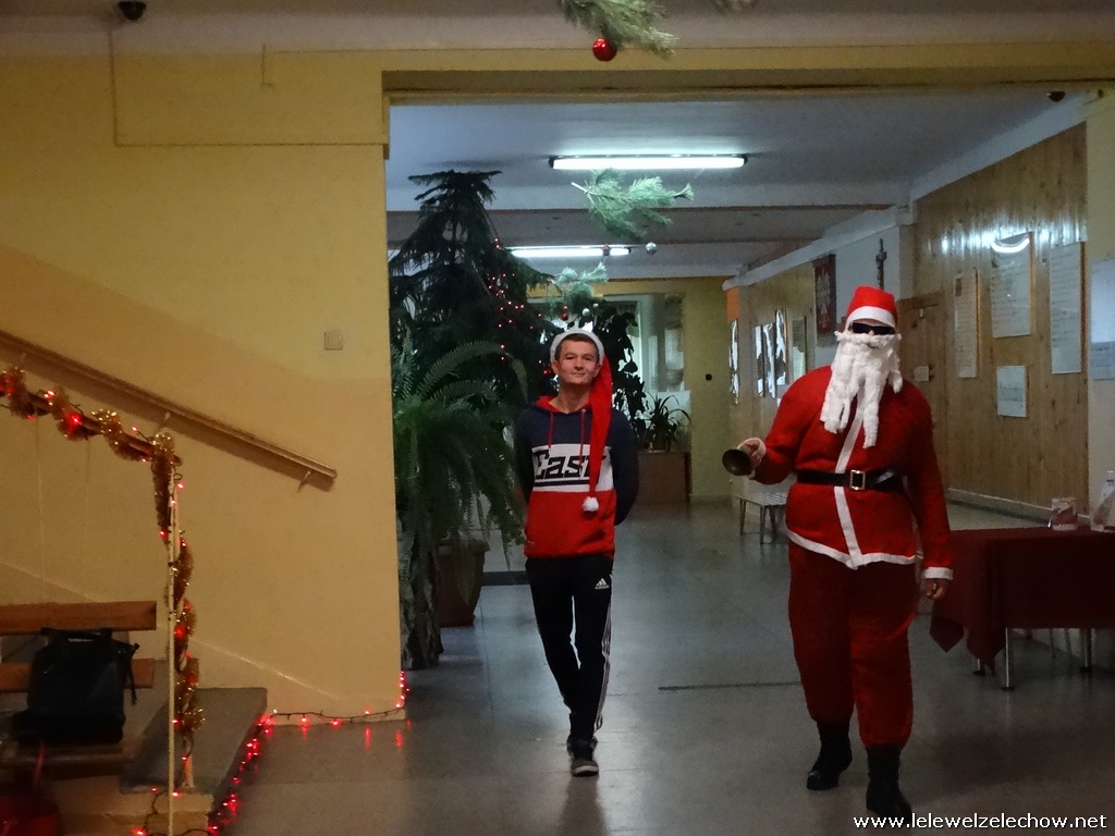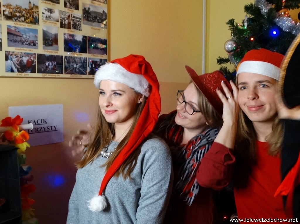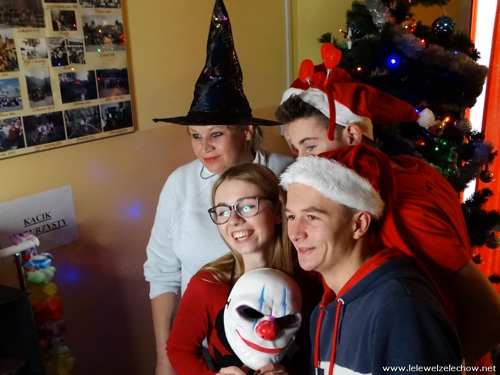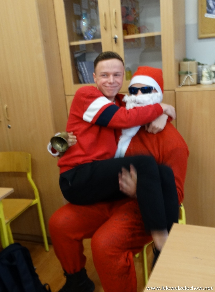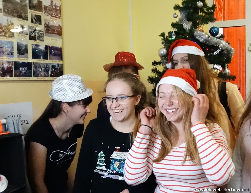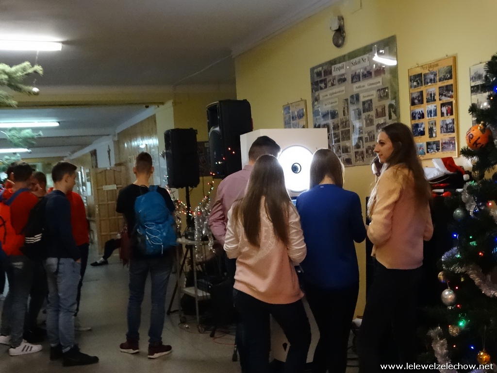 W holu przygotowane były ciasteczka oraz niespodzianka dnia …fotobudka! W nastrój świąteczny wprowadzała muzyka przygotowana jak zawsze przez Kubę i Michała oraz świąteczne dekoracje, które pieczołowicie tworzyli uczniowie z klas II pod czujnym okiem samorządu – Angeliki, Gabrysi, Weroniki i Michała.