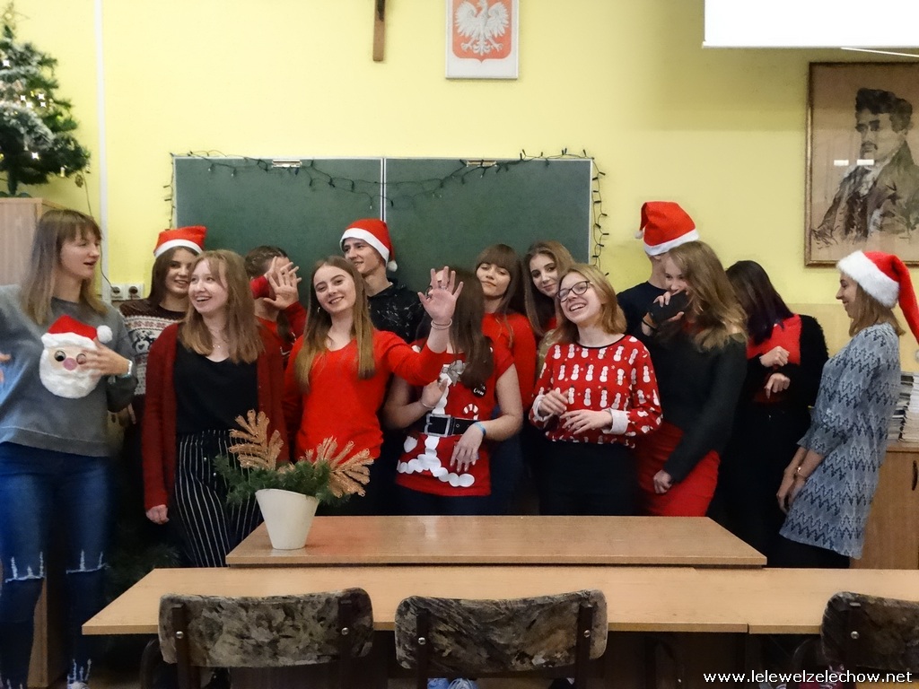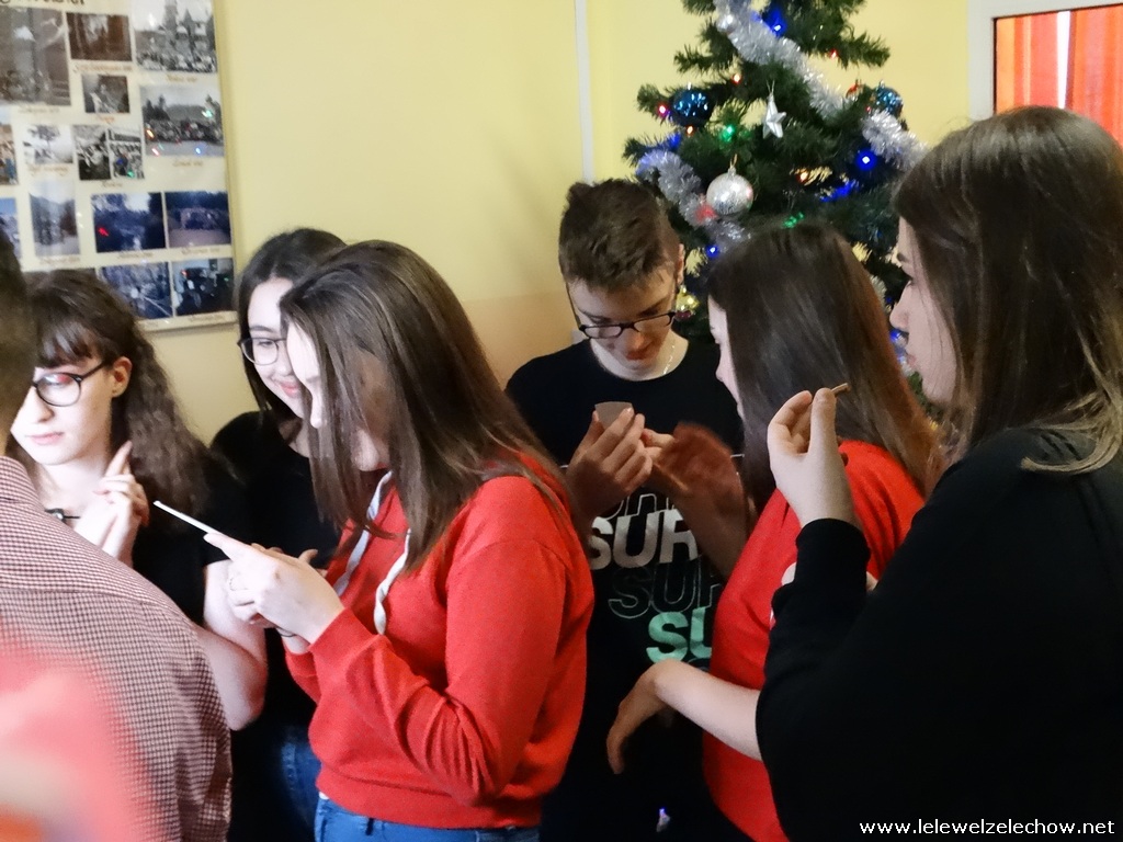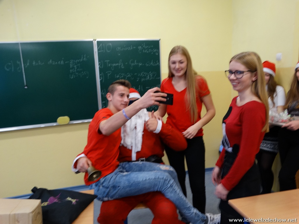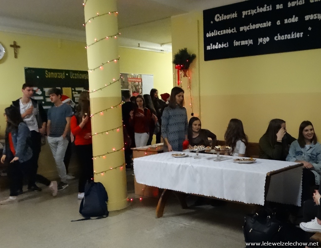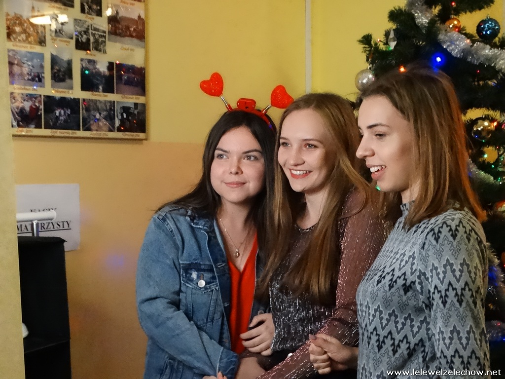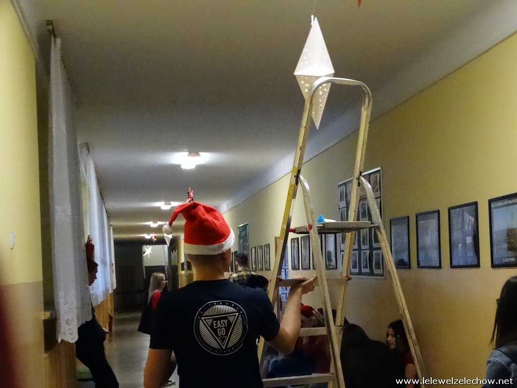 W holu przygotowane były ciasteczka oraz niespodzianka dnia …fotobudka! W nastrój świąteczny wprowadzała muzyka przygotowana jak zawsze przez Kubę i Michała oraz świąteczne dekoracje, które pieczołowicie tworzyli uczniowie z klas II pod czujnym okiem samorządu – Angeliki, Gabrysi, Weroniki i Michała.