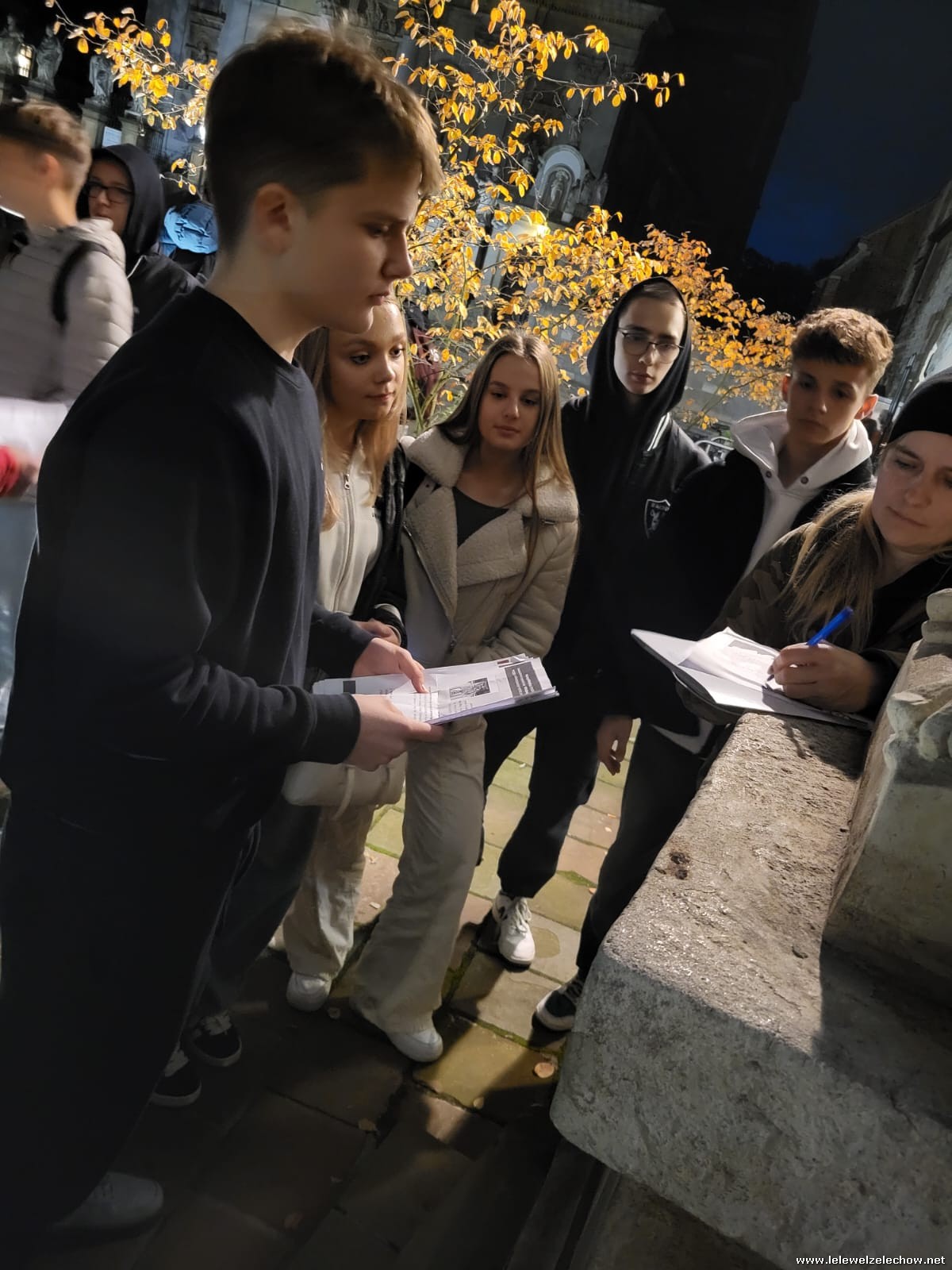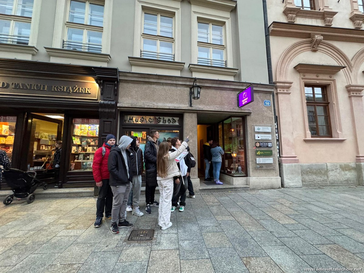 GRA MIEJSKA KRAKÓW to nowatorski sposób zwiedzania miasta, który w formie gry terenowej zabiera uczestników do najciekawszych zakątków starej stolicy. Uczniowie Lelewela podzieleni na 4 zespoły uczestniczyli w takiej 2- godzinnej zabawie. 11 osobowe drużyny miały wspólnie rozwiązać szereg zagadek, ukrytych na szlakach Krakowa. Łamigłówki skierowane były przede wszystkim na współpracę, dobrą zabawę połączone z poznawaniem starego rynku Krakowa i jego okolic. Liczyła się spostrzegawczość, łączenie faktów i logiczne myślenie.