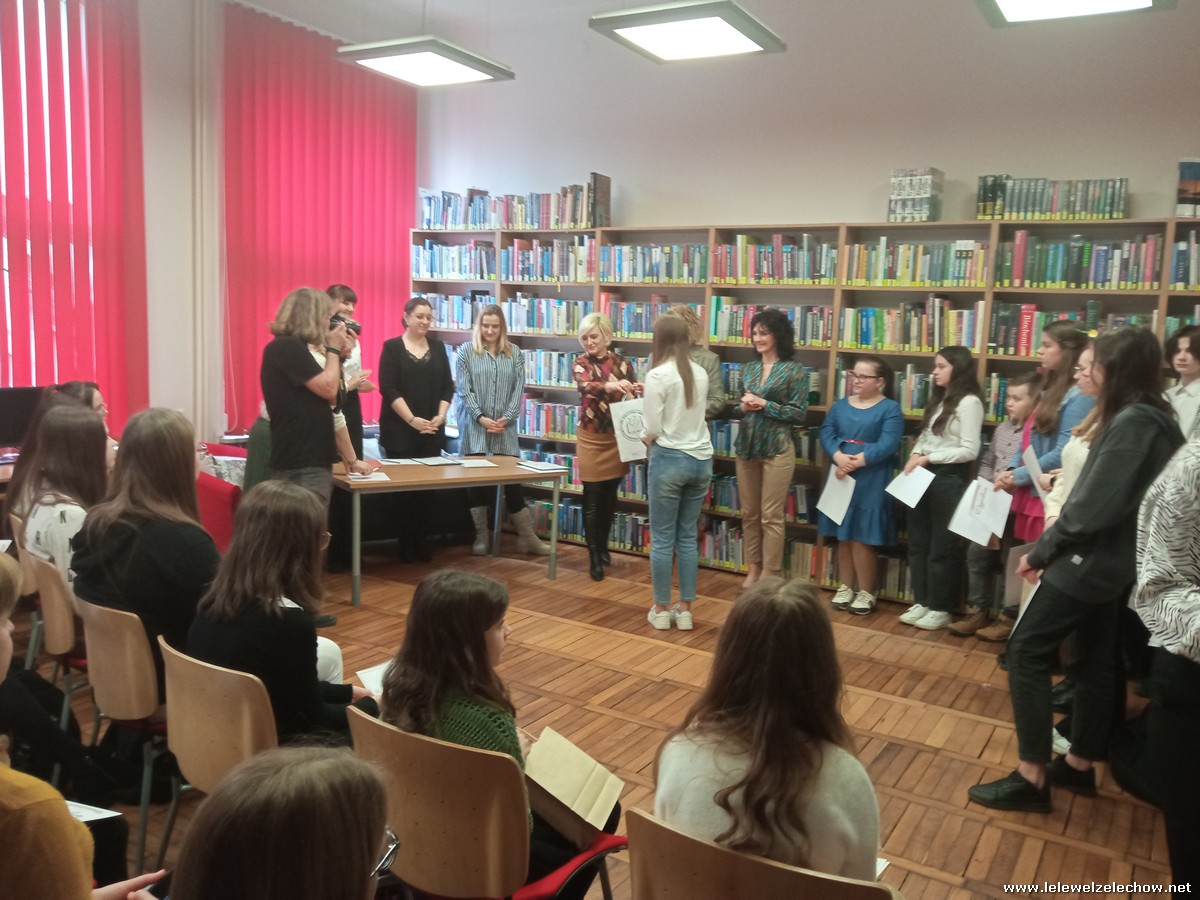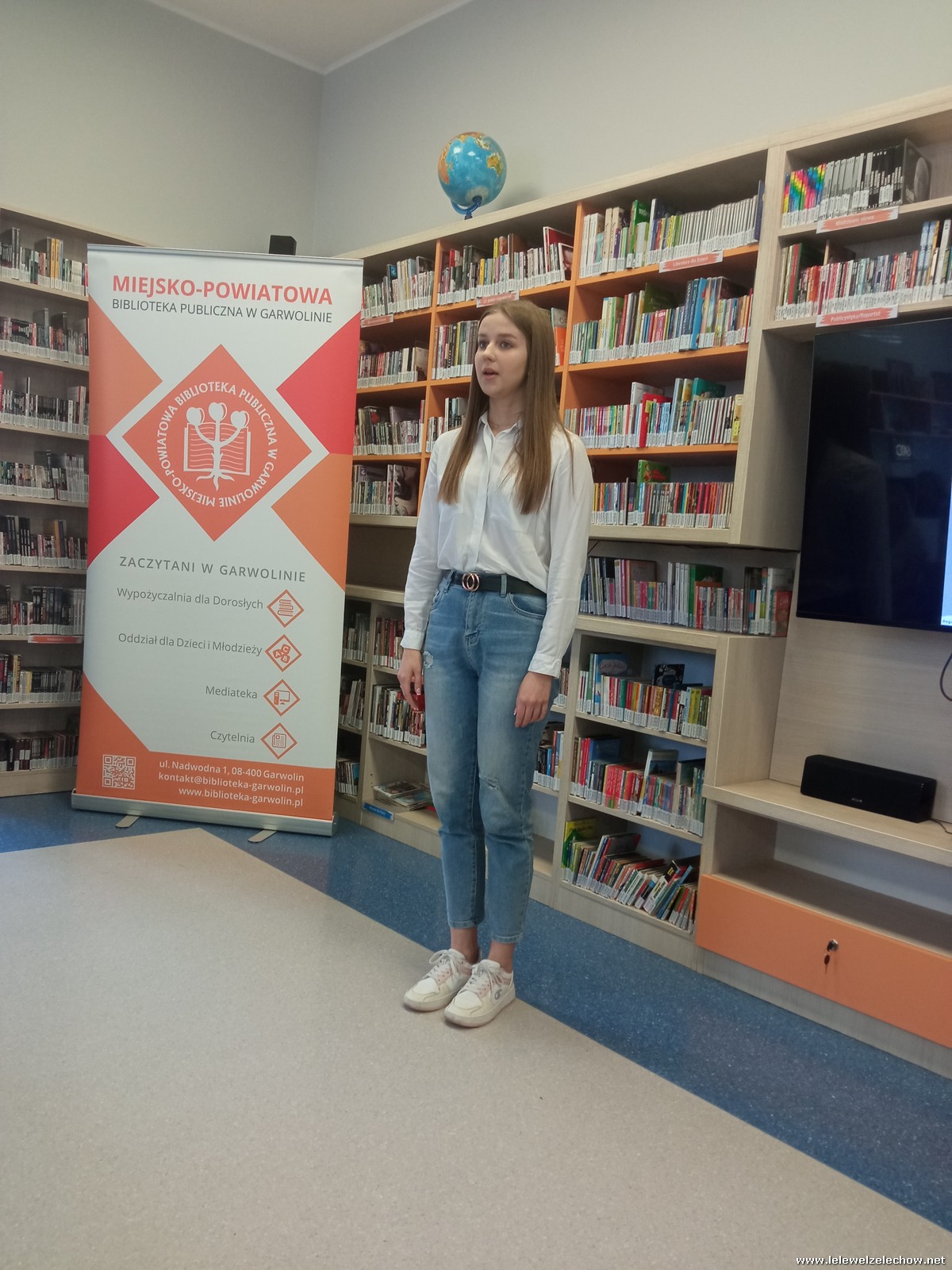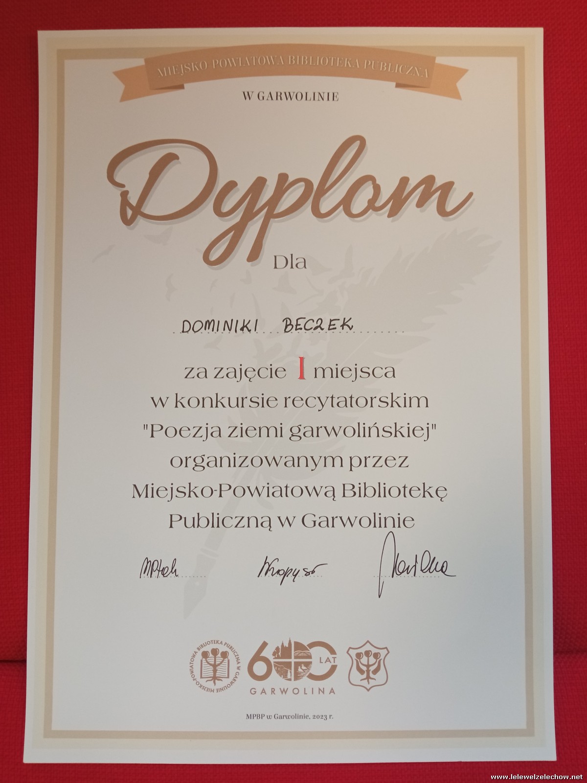 Miejska Biblioteka Publiczna w Garwolinie zorganizowała konkurs recytatorski, w którym wzięli udział przedstawiciele różnych szkół powiatowych. Wśród recytujących byli zarówno uczniowie klas podstawowych jak i ponadpodstawowych – w sumie ponad 50 osób. Poezja uczy wrażliwości, daje możliwość zetknięcia się z tym, co czasem nieuchwytne, wyraża emocje i skłania do przemyśleń. Niekiedy bawi, często stawia pytania o sens życia. Tego wszystkiego dało się doświadczyć podczas słuchania recytacji wierszy poetów, którzy mieszkali lub mieszkają w okolicach Garwolina. Różnorodność i piękno tej twórczości zaprezentowali uczestnicy konkursu. Tym bardziej cieszy nas fakt, że I miejsce w tym zdobyła nasza uczennica – Dominika Beczek z klasy II a, która przygotowała wiersz Marii Stefanowskiej „Mój książę”. Opiekunką uczennicy była pani Anna Włodarczyk. Bardzo cieszymy się z tego sukcesu.