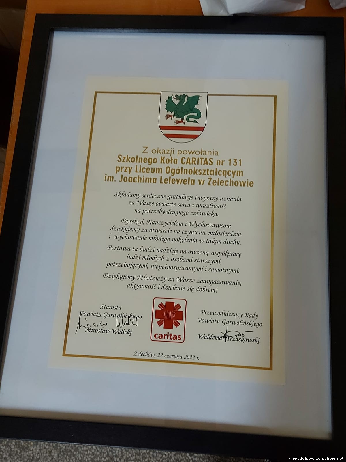 22 czerwca 2022 roku w Liceum Ogólnokształcącym im. Joachima Lelewela w Żelechowie zostało powołane Szkolne Koło Caritas nr 131.