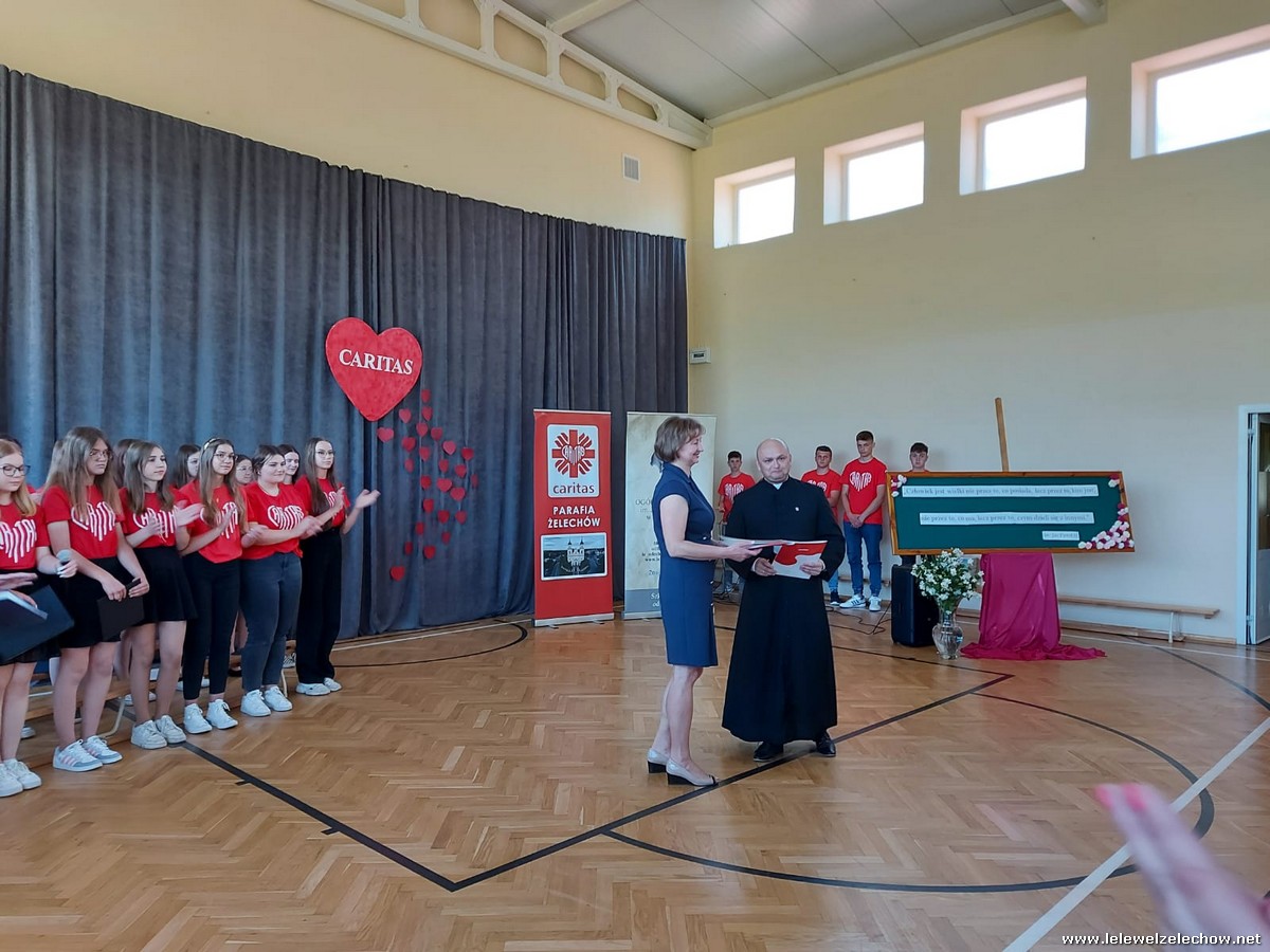 Obecni byli Opiekunowie Szkolnych Kół Caritas z miasta i gminy Żelechów z Siostrą Dawidą Kopek na czele, Nauczyciele oraz Wolontariusze – wspaniali, młodzi ludzie, którzy dzielą się dobrem, pomagając ludziom starszym, ubogim, potrzebującym, sami również wzbogacając się o nowe doświadczenia miłości do bliźniego.