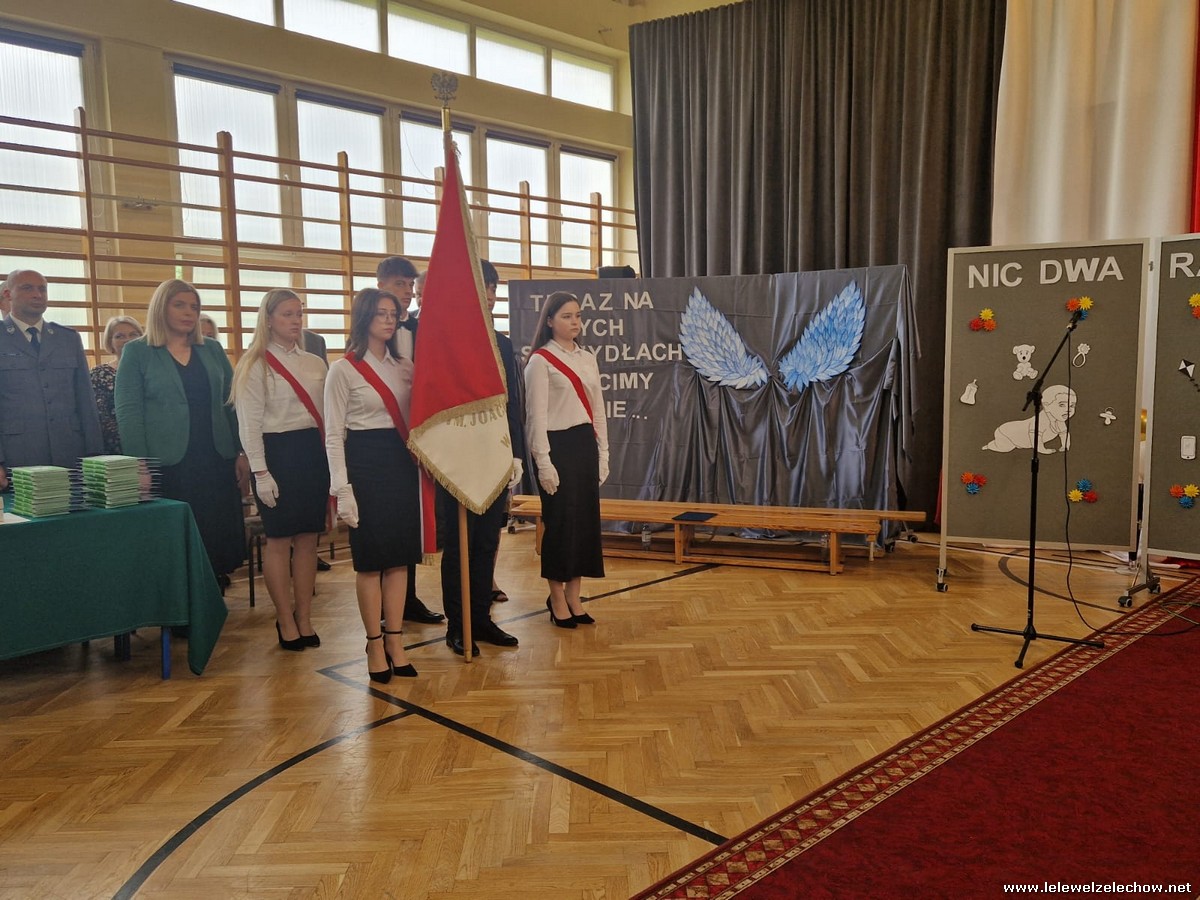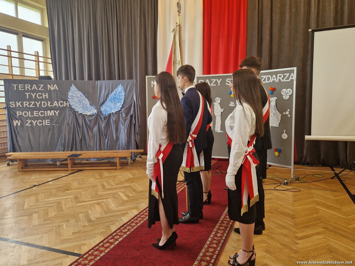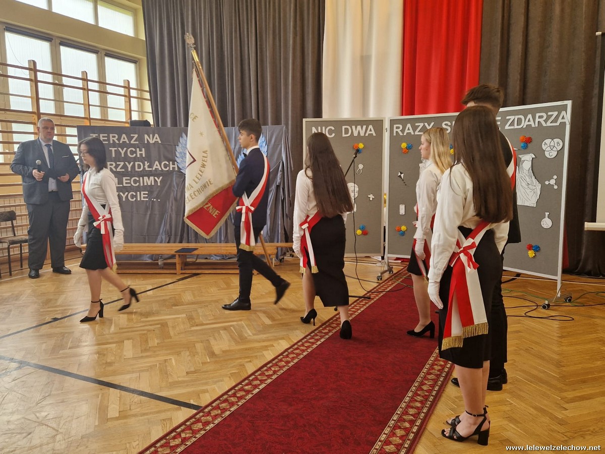 25 kwietnia 2025 roku pożegnaliśmy kolejny rocznik uczniów Lelewela. Wydarzenie to w naszym liceum obchodzone jest bardzo uroczyście i uczestniczy w nim cała społeczność szkolna. Tak było i tym razem. Po odśpiewaniu hymnu czwartoklasiści przekazali sztandar trzecioklasistom, którzy wypowiadając słowa przysięgi zobowiązali się do godnego reprezentowania szkoły i dbania o jej dobre imię.