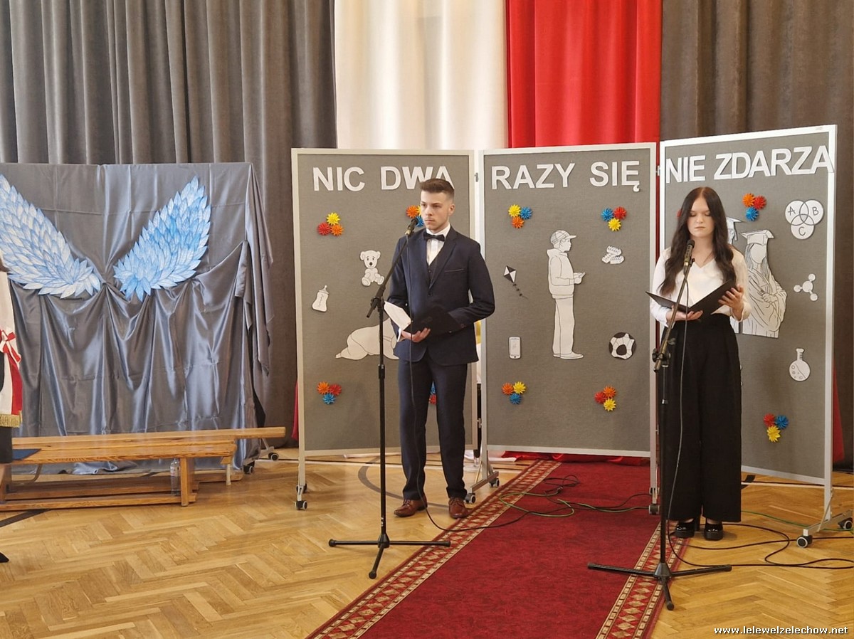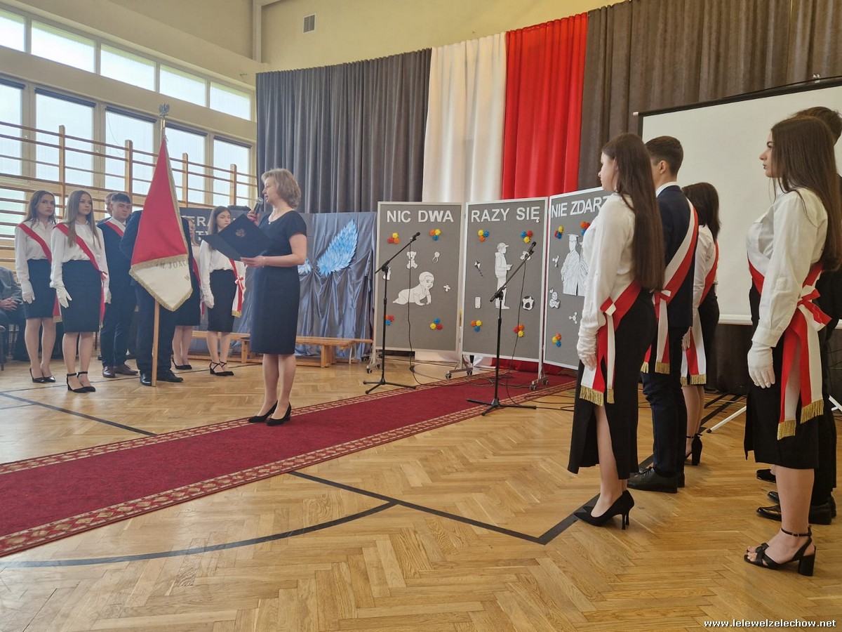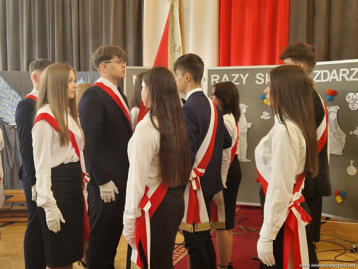 25 kwietnia 2025 roku pożegnaliśmy kolejny rocznik uczniów Lelewela. Wydarzenie to w naszym liceum obchodzone jest bardzo uroczyście i uczestniczy w nim cała społeczność szkolna. Tak było i tym razem. Po odśpiewaniu hymnu czwartoklasiści przekazali sztandar trzecioklasistom, którzy wypowiadając słowa przysięgi zobowiązali się do godnego reprezentowania szkoły i dbania o jej dobre imię.