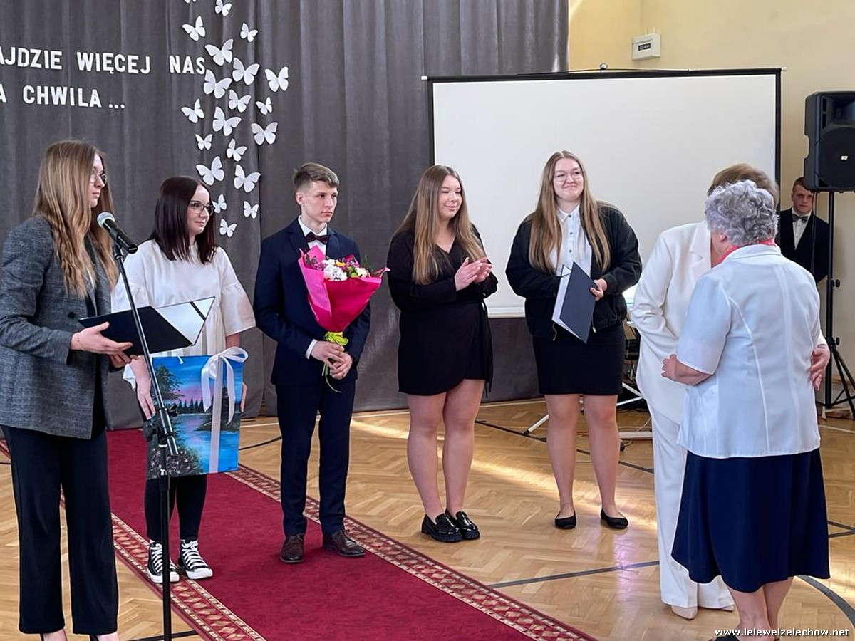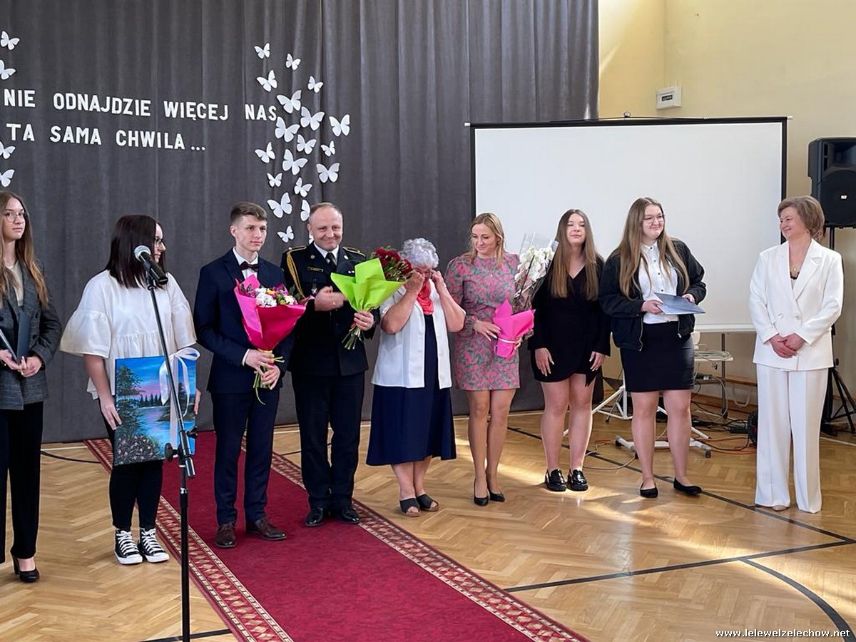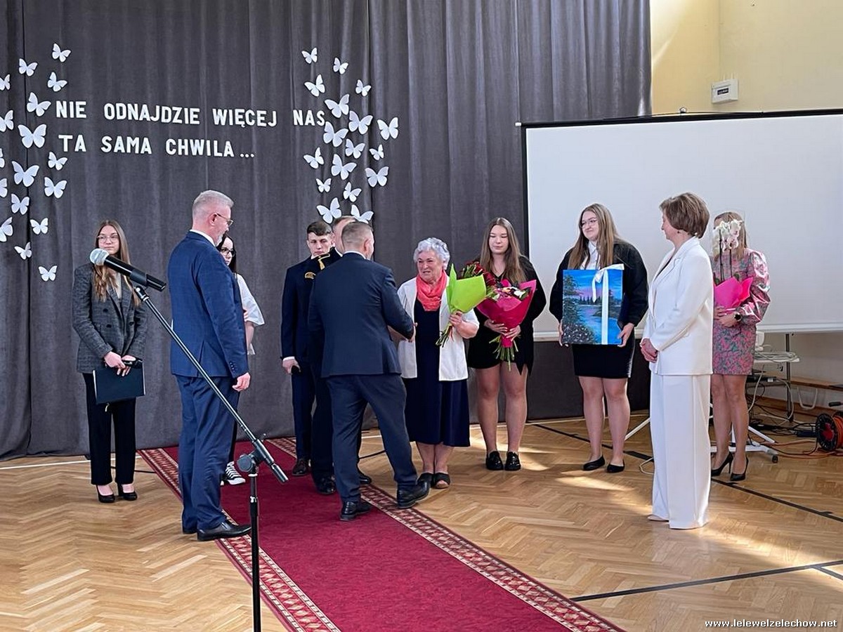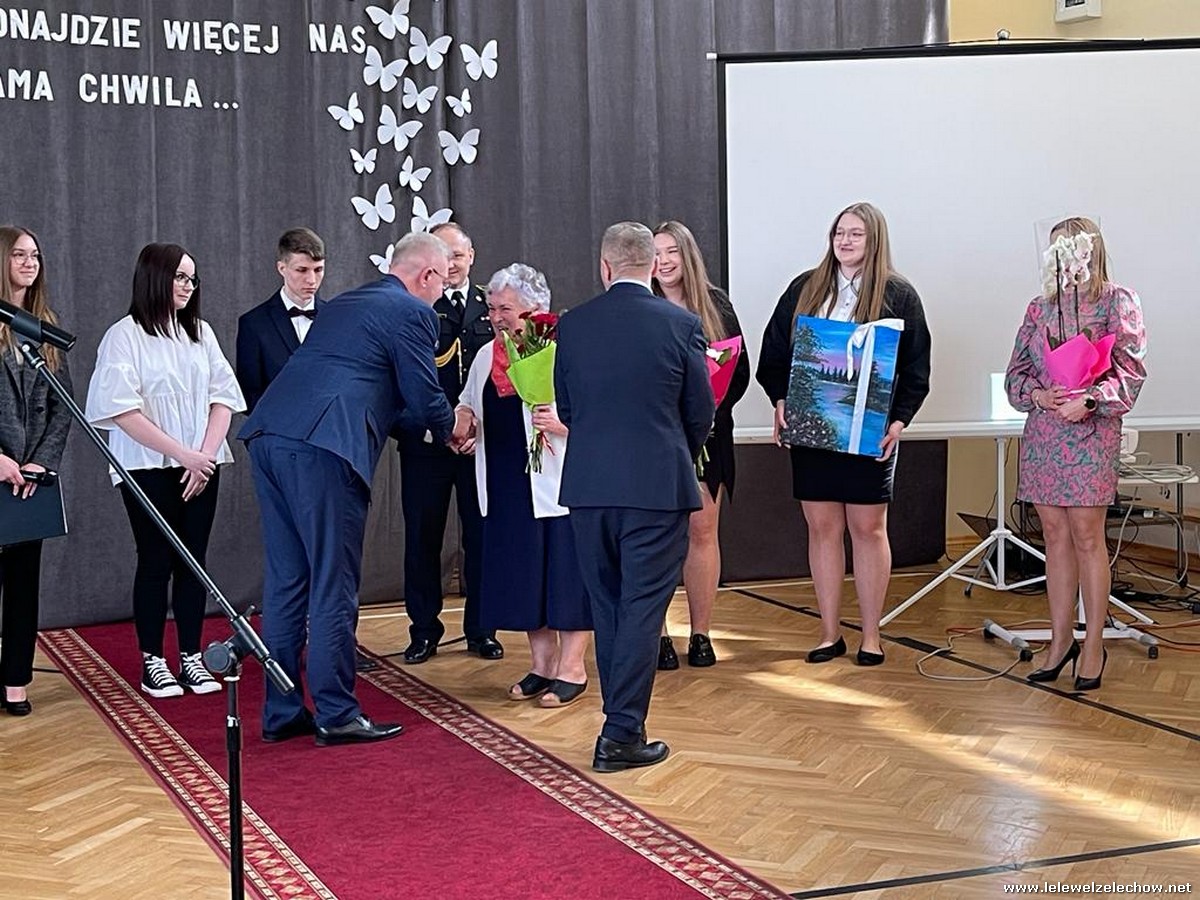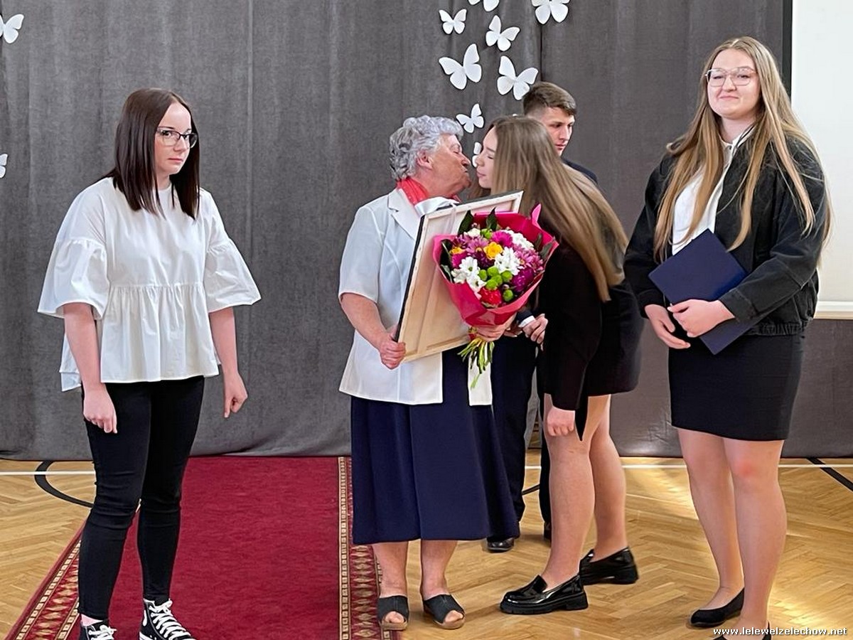 Cała społeczność szkolna pożegnała panią Basię. Samorząd Uczniowski w imieniu wszystkich obecnych uczniów oraz wielu wcześniejszych roczników podziękował za dobroć, otwarte serce i pomoc. Licealiści wręczyli kwiaty oraz specjalnie namalowany przez Amelię Borek obraz. Życzenia i podziękowania złożyła pani Dyrektor Sylwia Tomaszek, nauczyciele i pracownicy niepedagogiczni szkoły. Do życzeń dołączyli pan Starosta oraz pan Burmistrz- absolwent szkoły.