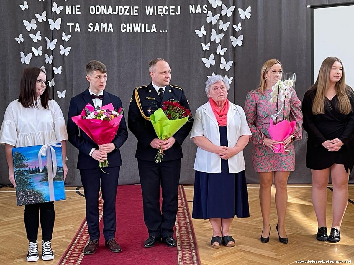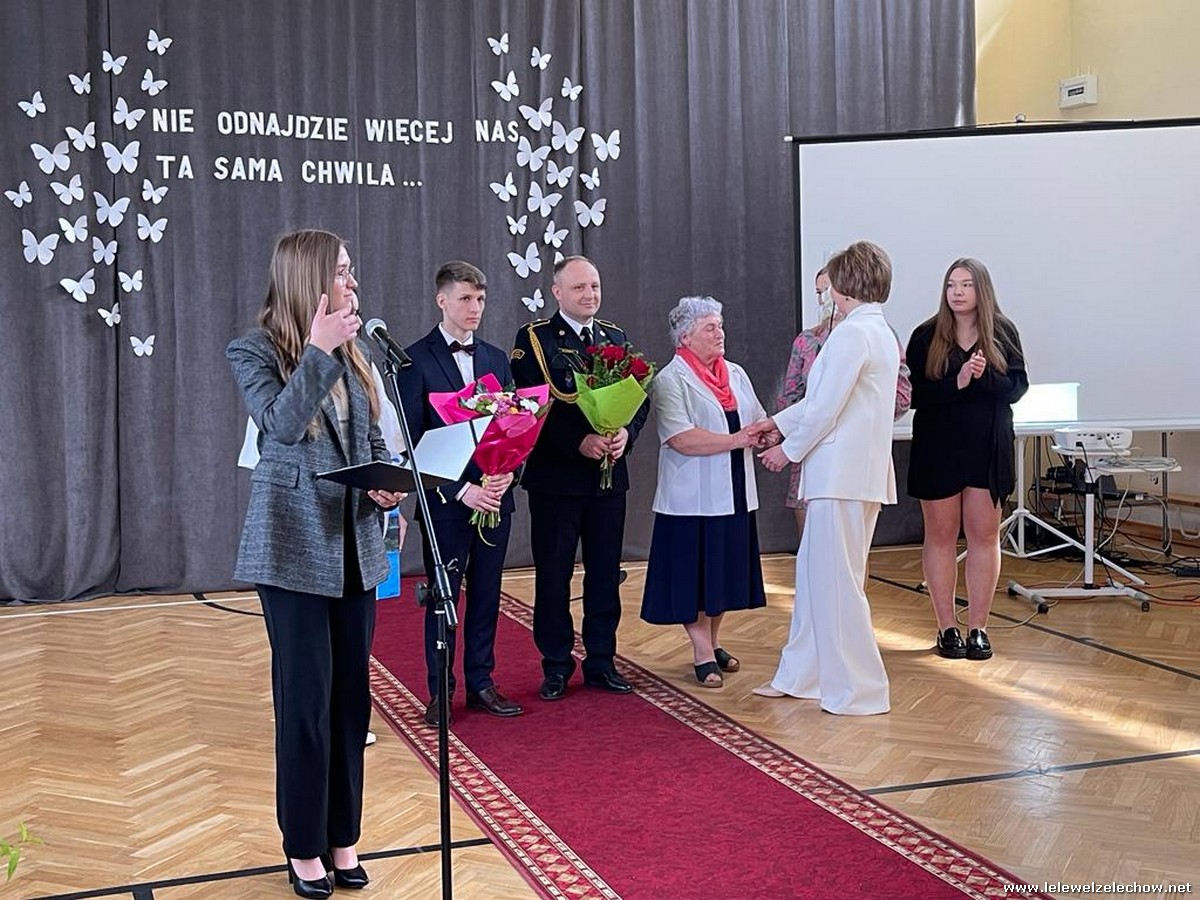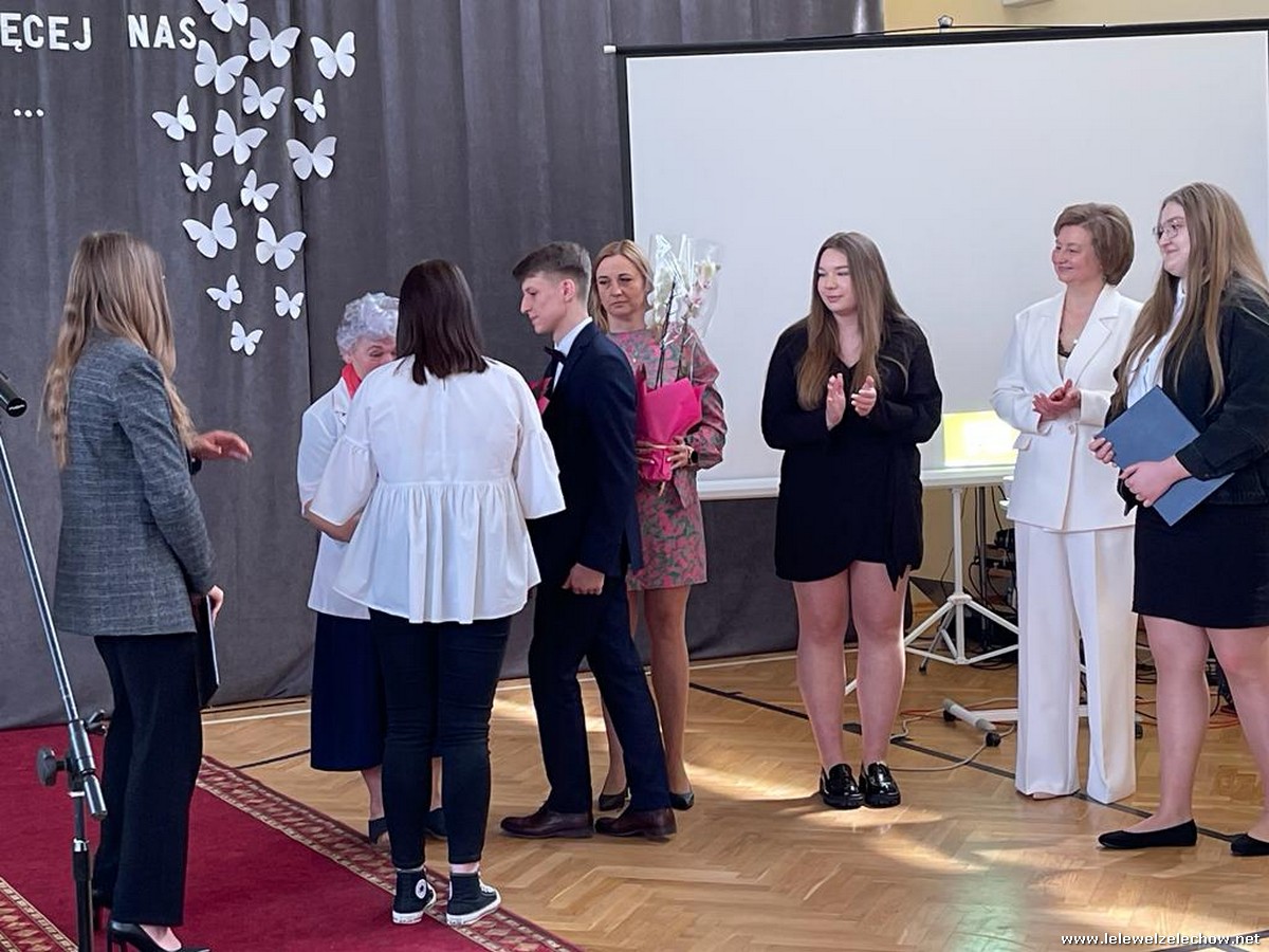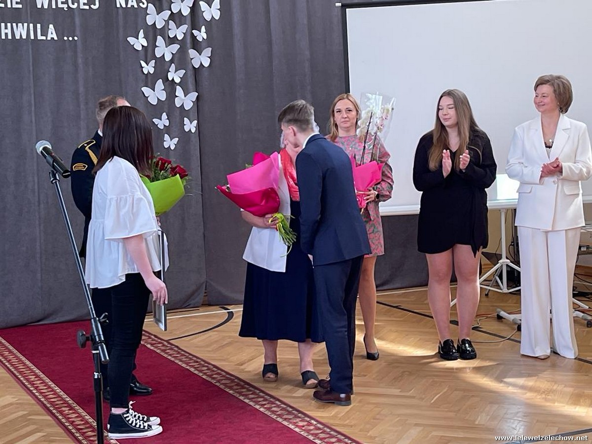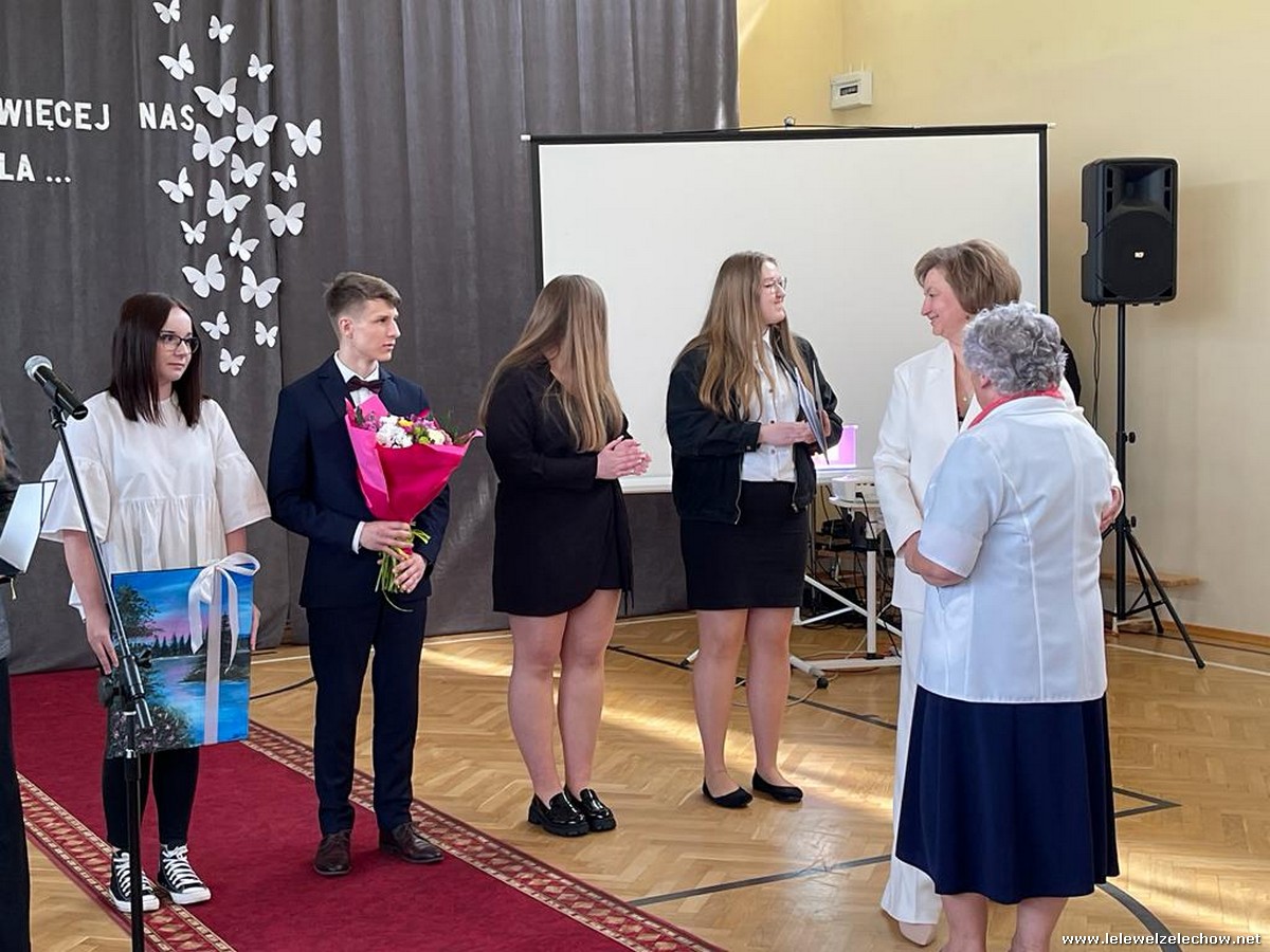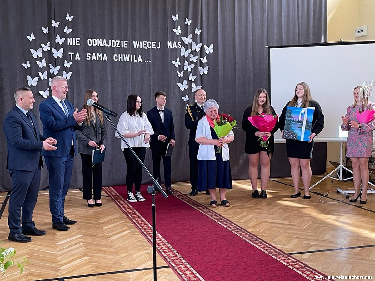 Cała społeczność szkolna pożegnała panią Basię. Samorząd Uczniowski w imieniu wszystkich obecnych uczniów oraz wielu wcześniejszych roczników podziękował za dobroć, otwarte serce i pomoc. Licealiści wręczyli kwiaty oraz specjalnie namalowany przez Amelię Borek obraz. Życzenia i podziękowania złożyła pani Dyrektor Sylwia Tomaszek, nauczyciele i pracownicy niepedagogiczni szkoły. Do życzeń dołączyli pan Starosta oraz pan Burmistrz- absolwent szkoły.
