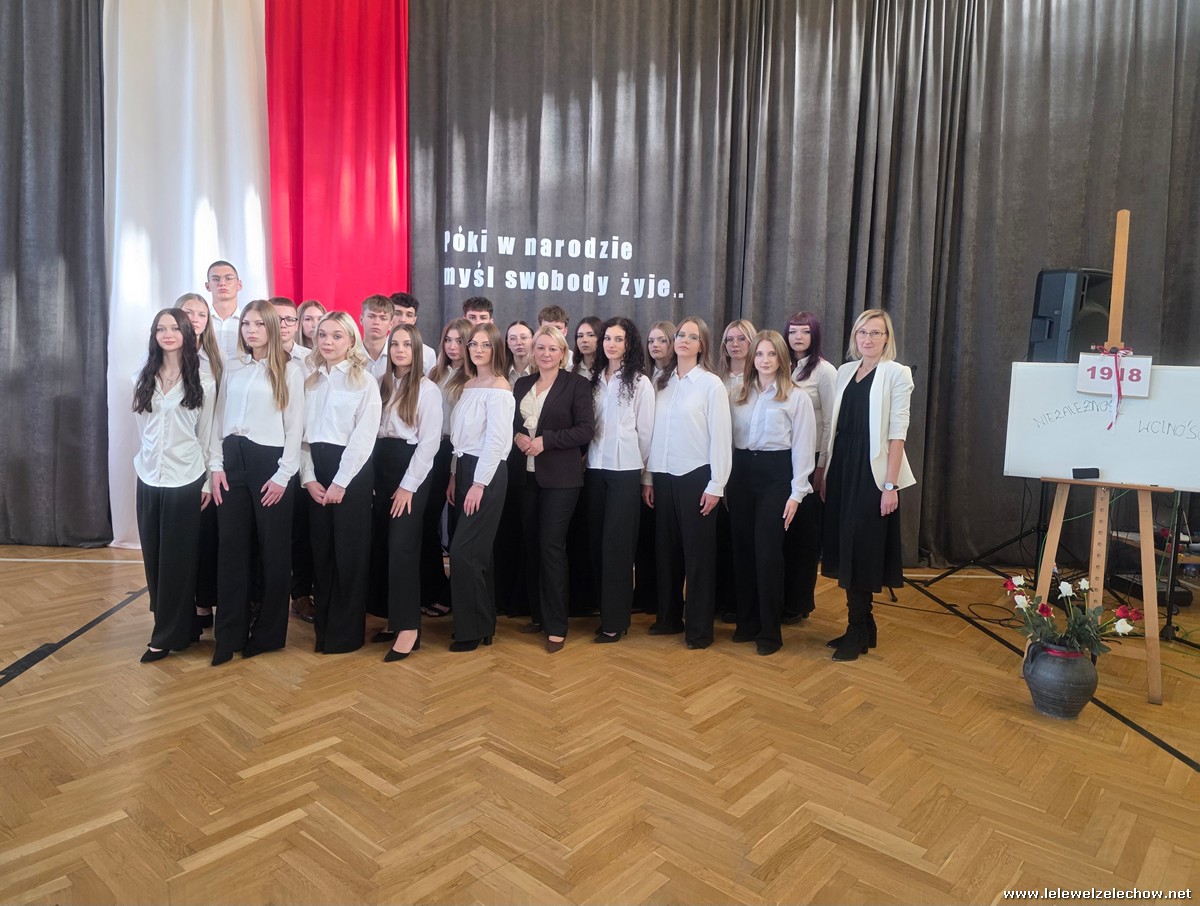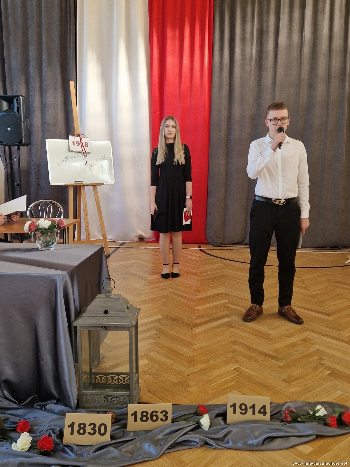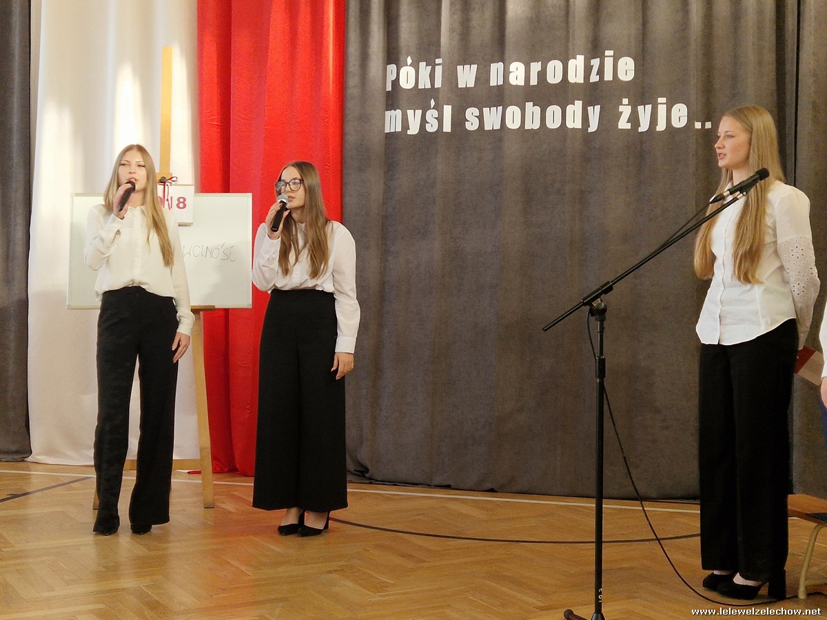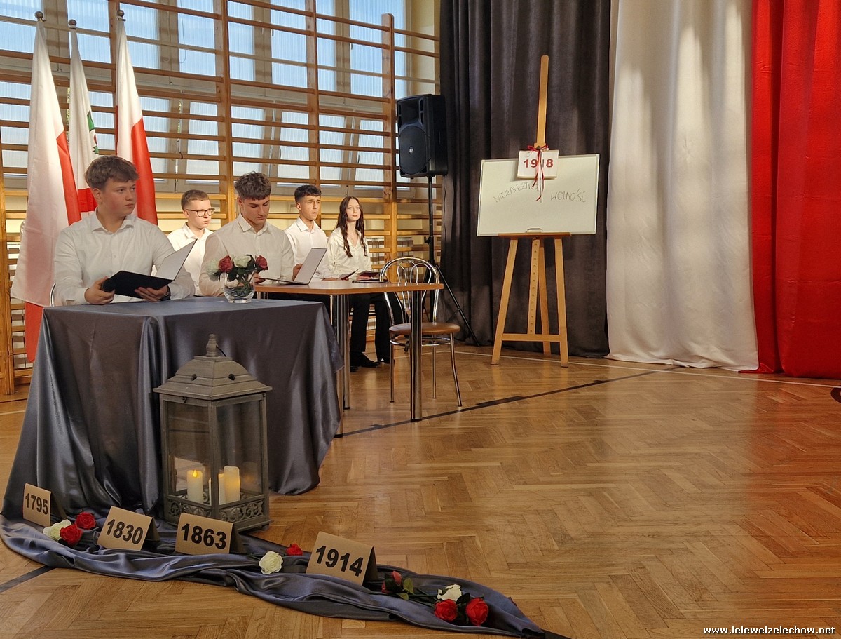 Uczniowie klas III poprowadzili nas pieśnią i poezją przez czas 123 lat polskiej niewoli. Od rozbiorów, poprzez zrywy niepodległościowe, walkę o polskość pod zaborami, czyn zbrojny I wojny światowej aż po uzyskanie upragnionej wolności. To tę wartość wielokrotnie podkreślano w programie, zaznaczając, że nie była ona również w 1918 roku Polakom dana raz na zawsze...
