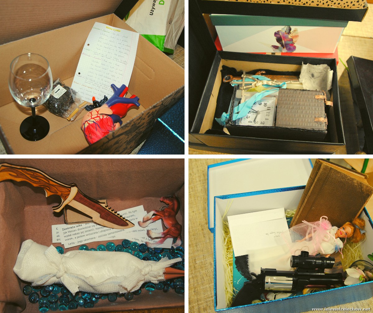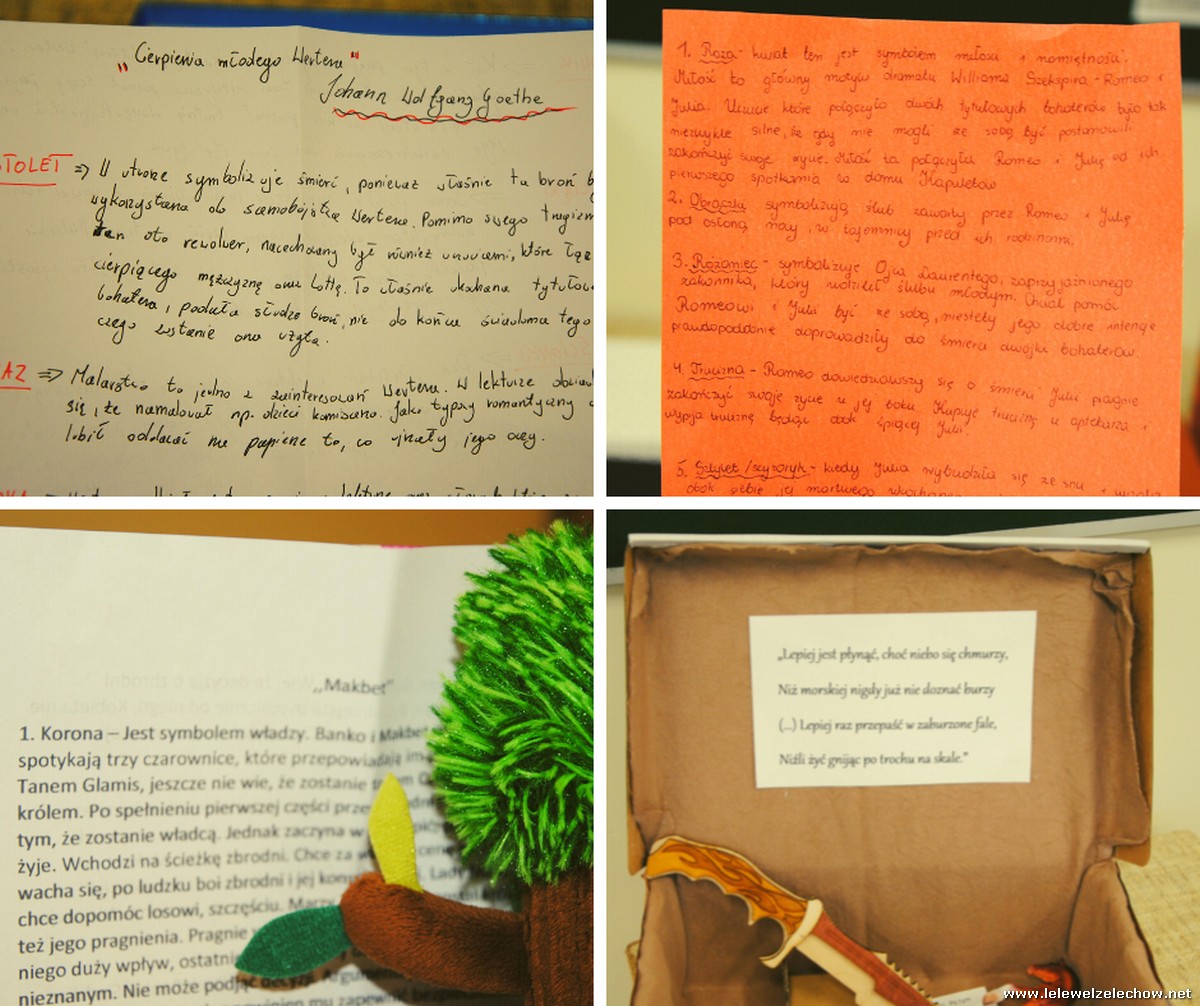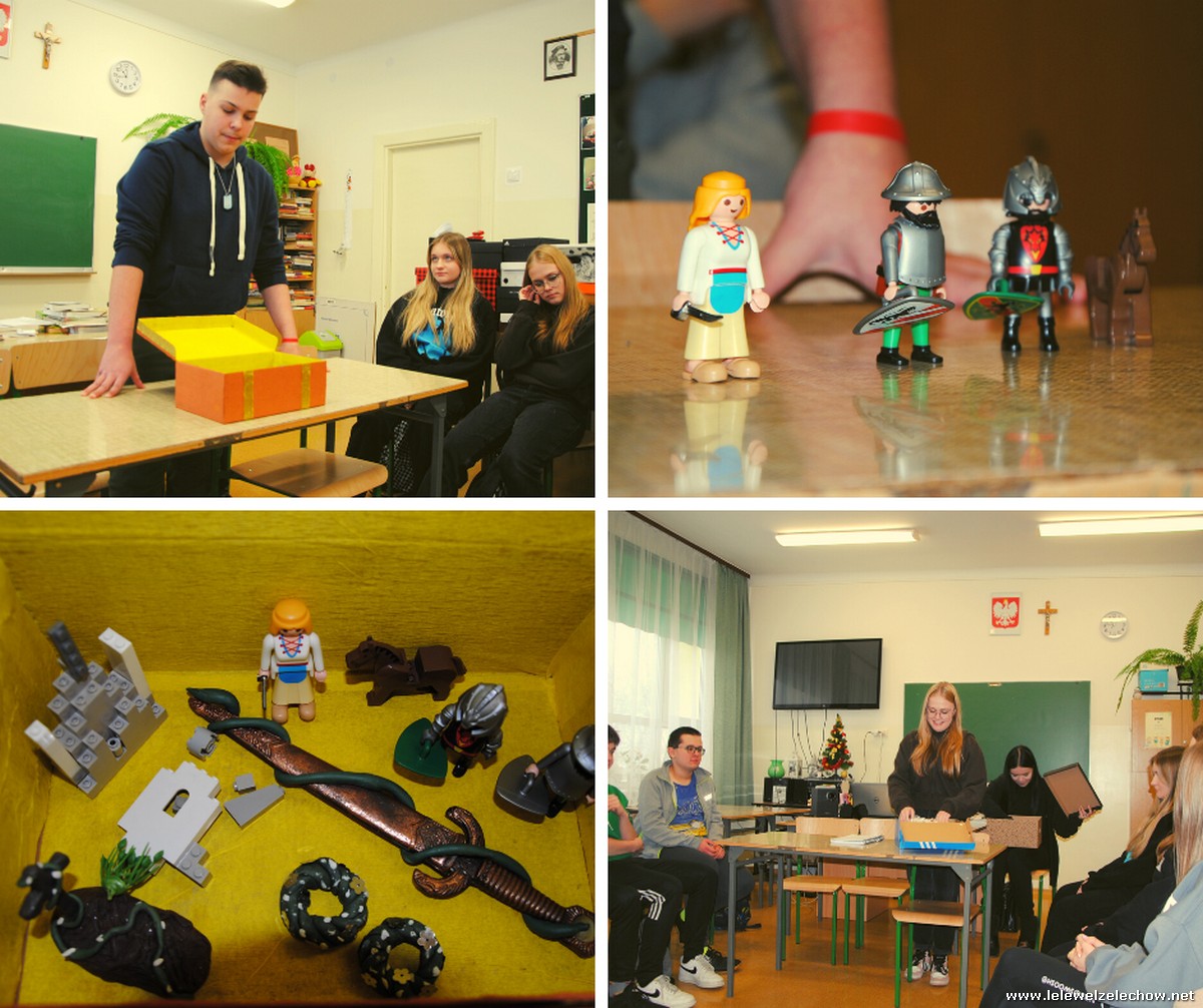 W jaki sposób plaster z opatrunkiem może kojarzyć się z II częścią „Dziadów”, figurka z klocków Lego z balladą „Świtezianka”, a lalka Barbie z „Makbetem”? Na te pytania można było poznać odpowiedź podczas lekcji języka polskiego, na której uczniowie wraz z panią Anna Włodarczyk w niekonwencjonalny sposób mówili o literaturze. Zadaniem drugoklasistów było przedstawić wylosowaną lekturęza pomocą przynajmniej pięciu przedmiotów, które w sposób dosłowny lub symboliczny miałynawiązywać do treści utworu. Lekturowe pudełka uczniowie przygotowali w domu. W szkole odbyła się ich prezentacja. Wśród omawianychtekstów literackich były dramaty Williama Szekspira: „Romeo i Julia”, „Makbet”, „Hamlet”, komedia Moliera pt.„Skąpiec”, bajki i satyry Ignacego Krasickiego, „Cierpienia młodego Wertera”Johanna Wolfganga Goethego, „Giaur” George’a Byrona, utwory Adama Mickiewicza: ballady, II i IV cz. „Dziadów”. Uczniowie obserwujący prezentacjęodgadywali, w jaki sposób dany przedmiot może być kluczem do odczytania dzieła literackiego. A ci, którzy przedstawiali wybrane rekwizyty, mieli za zadanie dokładnie wyjaśnić, jak daną rzecz powiązać z lekturą. Lekcja pobudziła wyobraźnię i uczniowską kreatywność orazbyła okazją do utrwalenia sobie poznanych w I semestrze lektur. Jak się okazało literaturę można omawiać czy też poznawać na różne sposoby, co widać na załączonych zdjęciach.