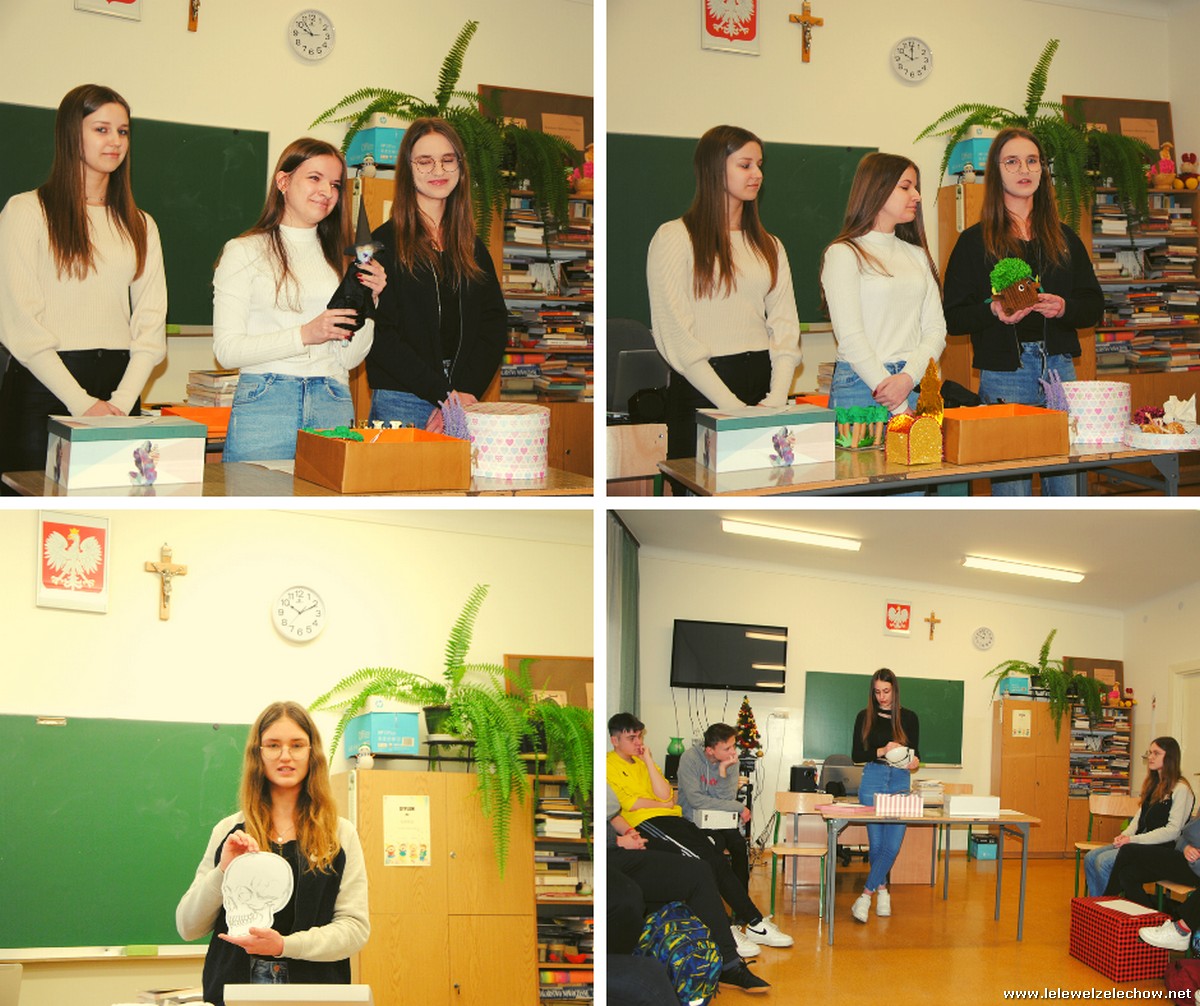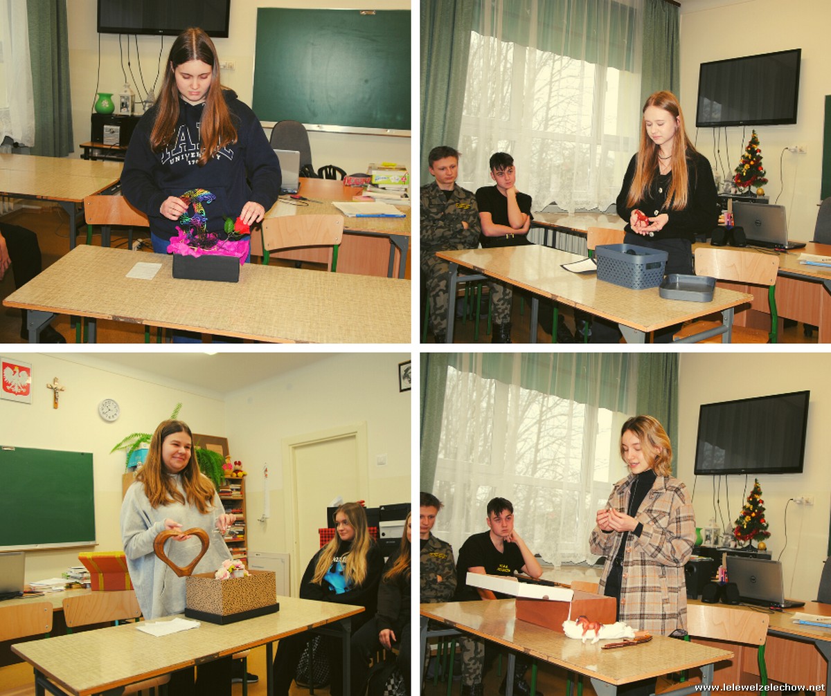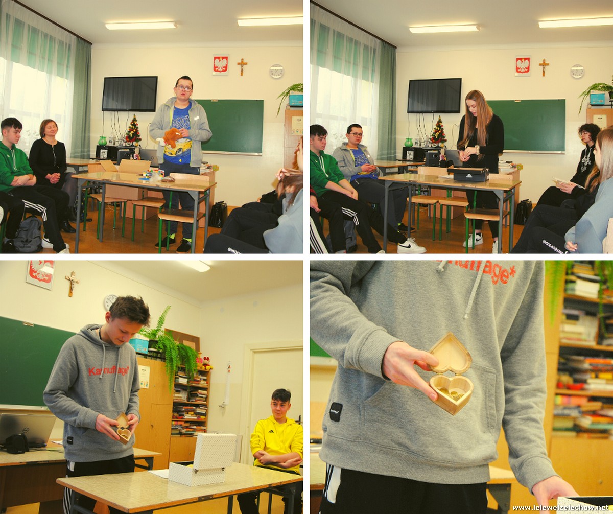 W jaki sposób plaster z opatrunkiem może kojarzyć się z II częścią „Dziadów”, figurka z klocków Lego z balladą „Świtezianka”, a lalka Barbie z „Makbetem”? Na te pytania można było poznać odpowiedź podczas lekcji języka polskiego, na której uczniowie wraz z panią Anna Włodarczyk w niekonwencjonalny sposób mówili o literaturze. Zadaniem drugoklasistów było przedstawić wylosowaną lekturęza pomocą przynajmniej pięciu przedmiotów, które w sposób dosłowny lub symboliczny miałynawiązywać do treści utworu. Lekturowe pudełka uczniowie przygotowali w domu. W szkole odbyła się ich prezentacja. Wśród omawianychtekstów literackich były dramaty Williama Szekspira: „Romeo i Julia”, „Makbet”, „Hamlet”, komedia Moliera pt.„Skąpiec”, bajki i satyry Ignacego Krasickiego, „Cierpienia młodego Wertera”Johanna Wolfganga Goethego, „Giaur” George’a Byrona, utwory Adama Mickiewicza: ballady, II i IV cz. „Dziadów”. Uczniowie obserwujący prezentacjęodgadywali, w jaki sposób dany przedmiot może być kluczem do odczytania dzieła literackiego. A ci, którzy przedstawiali wybrane rekwizyty, mieli za zadanie dokładnie wyjaśnić, jak daną rzecz powiązać z lekturą. Lekcja pobudziła wyobraźnię i uczniowską kreatywność orazbyła okazją do utrwalenia sobie poznanych w I semestrze lektur. Jak się okazało literaturę można omawiać czy też poznawać na różne sposoby, co widać na załączonych zdjęciach.