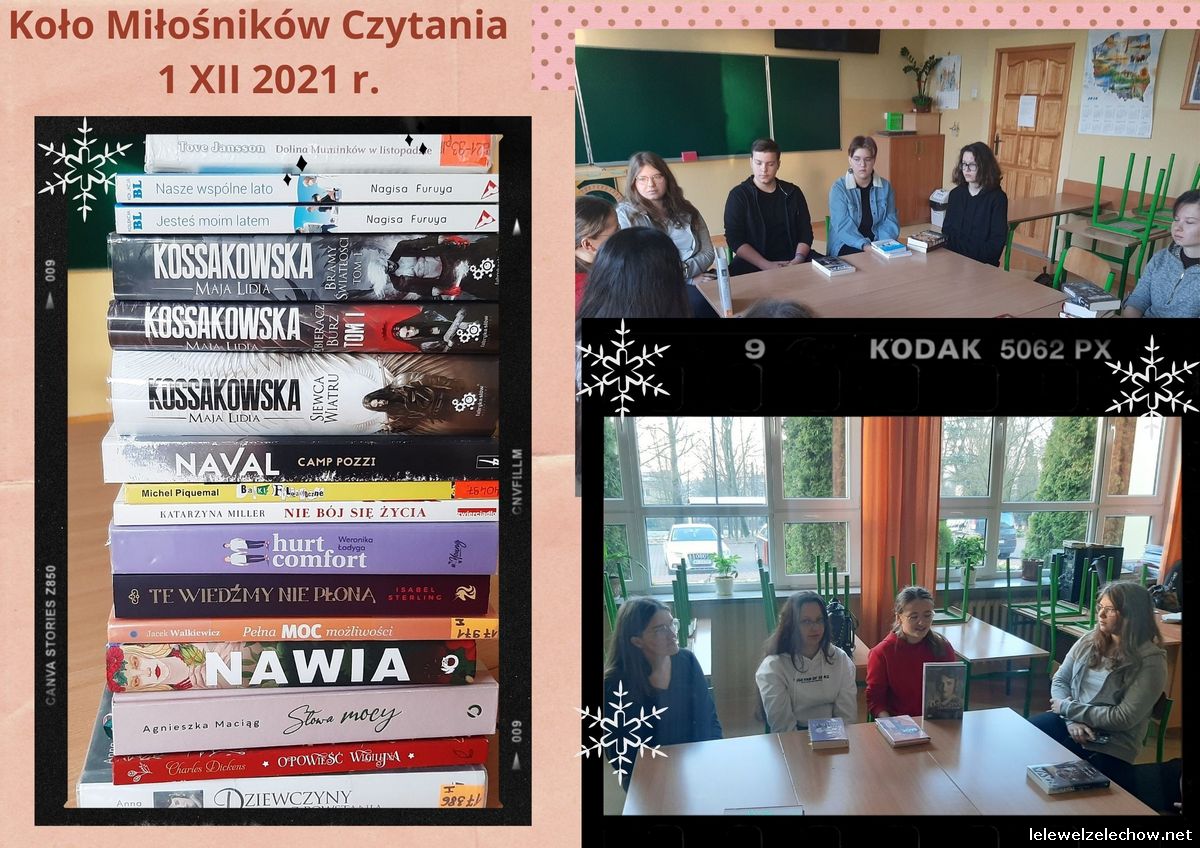 „Książki kochają każdego, kto je otwiera, dając mu poczucie bezpieczeństwa i przyjaźń, niczego w zamian nie żądając” – słowami Cornelii Funke otworzyliśmy kolejne spotkanie Koła Miłośników Czytania, które odbyło się 1 XII 2021 r. Literaturę wartą uwagi przedstawili uczniowie: Anna Gula (1a), Dominik Miszkurka (1a), Anita Osińska (1a), Karolina Król (3a), Emilia Chmielewska (3b), Wiktoria Grudzińska (3b), Julia Grzyb (3c), Aleksandra Kowalska (3d) oraz opiekunka koła pani Magdalena Woźniak. Rozmawialiśmy o ostatnio przeczytanych utworach. Wśród prezentowanych tytułów znalazły się: