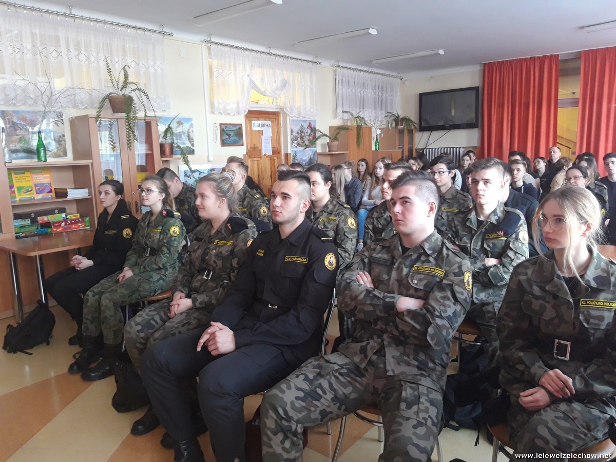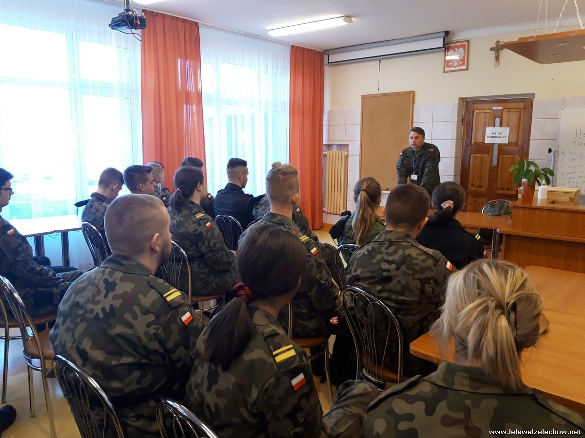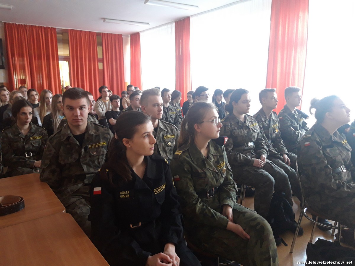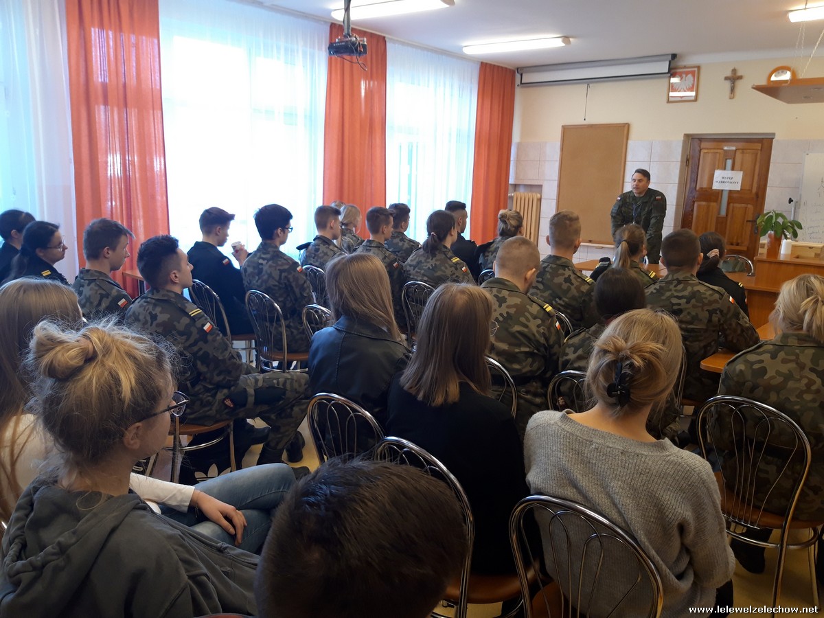 4 marca uczniowie klas 3a i 3b (mundurowi i nie mundurowi) spotkali się z przedstawicielem Wojskowej Komendy Uzupełnień w Garwolinie. Uczniowie dowiedzieli się o zbliżającej się tzw. kwalifikacji wojskowej dla ich rocznika jak również o wielu innych kwestiach związanych ze służbą w wojsku, a także planowanymi zmianami związanymi z projektem Ustawy o obronie ojczyzny. Uczniowie z uwagą wysłuchali słów prelegenta- szefa Wydziału Rekrutacji WKU- majora Sylwestra Kulika.