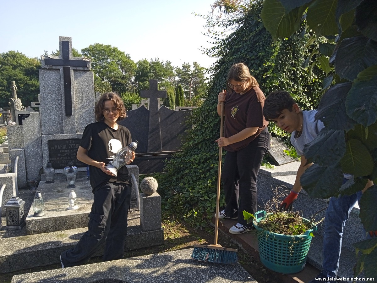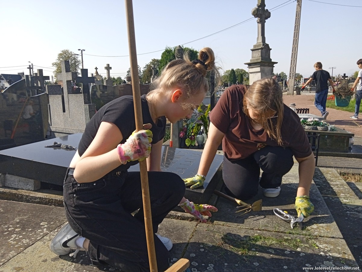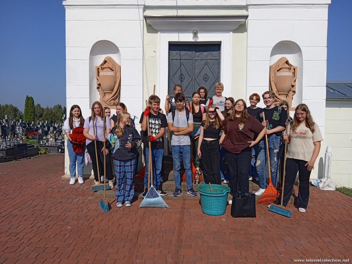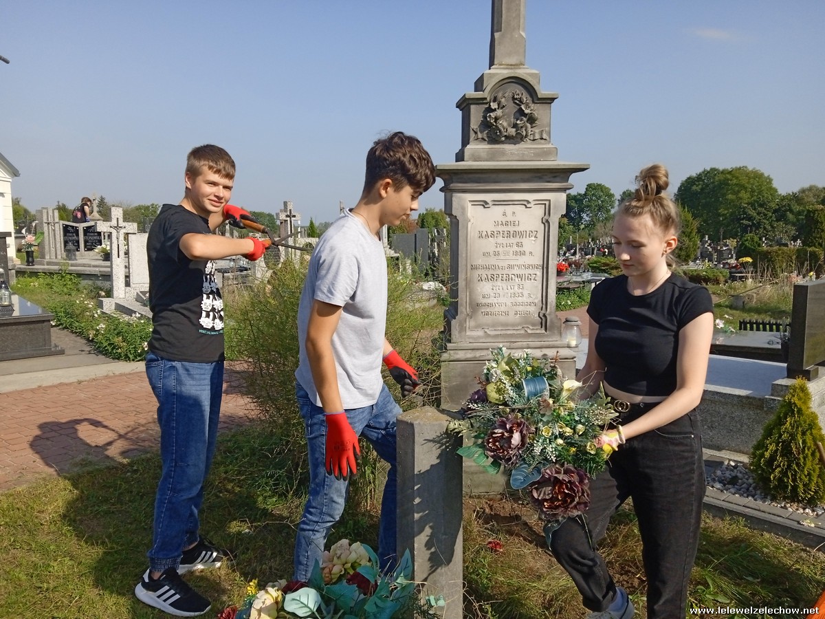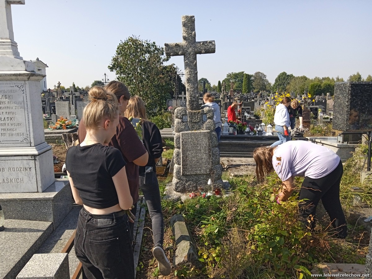 Tradycyjne sprzątanie zabytkowych nagrobków na cmentarzu w Żelechowie. Przy sprzyjającej wrześniowo-letniej pogodzie prace porządkowe, pod kierunkiem p.Urszuli Kobielus, wykonali uczniowie klas 2ab.