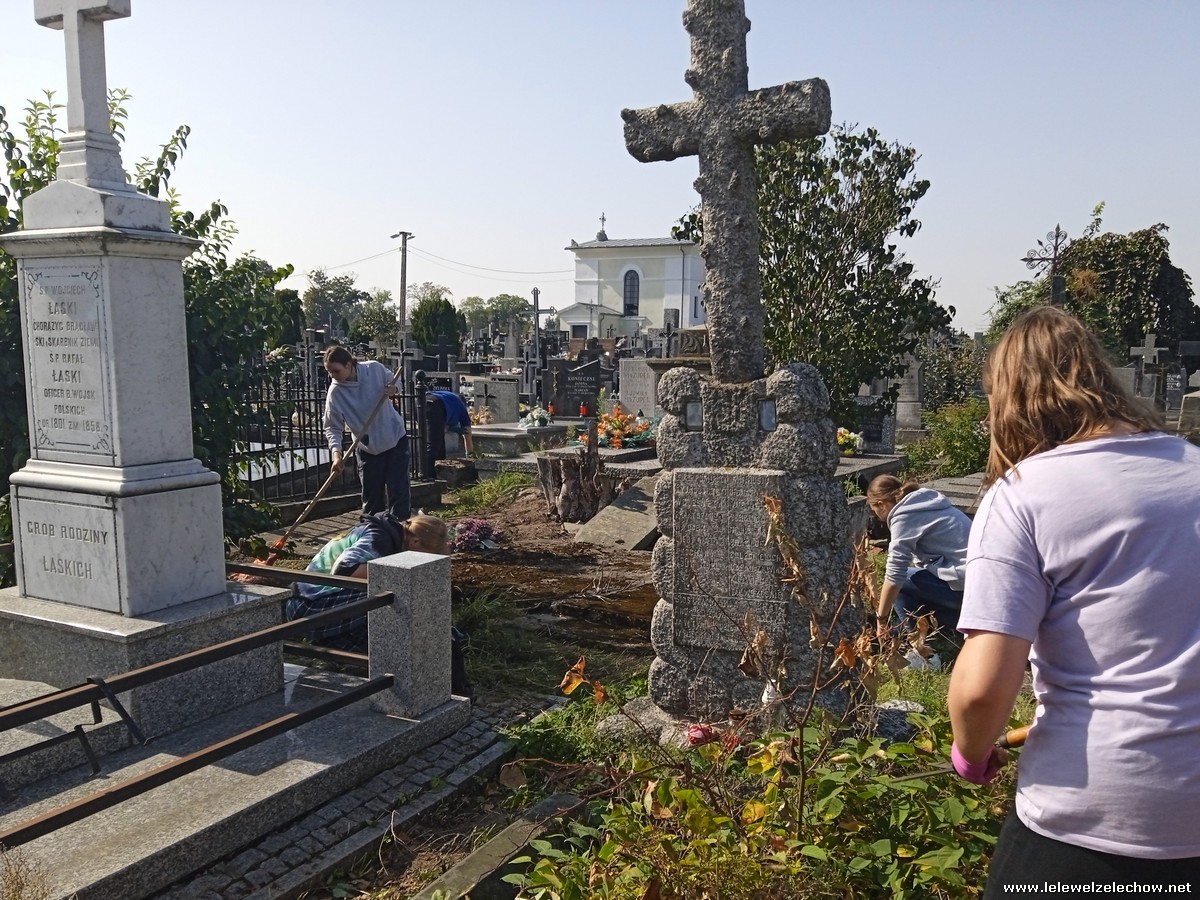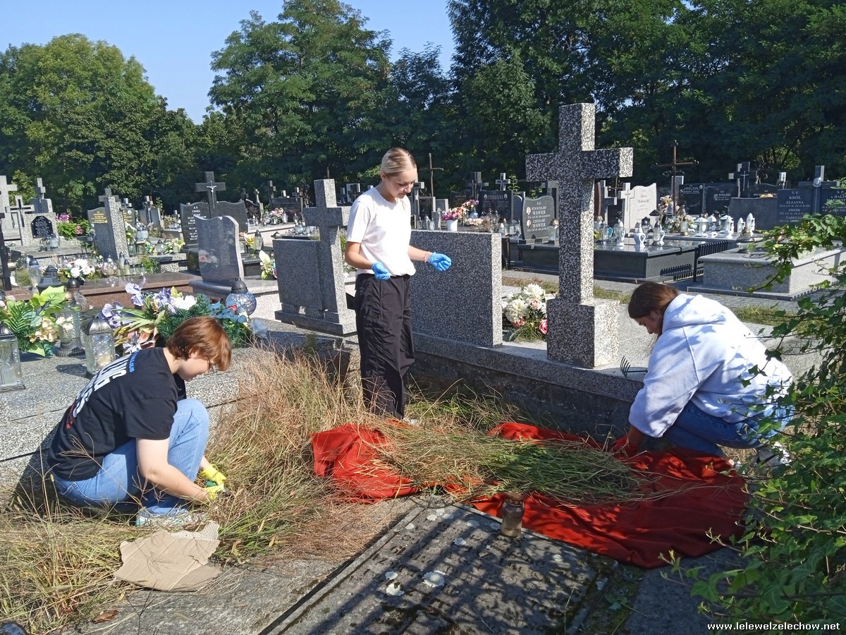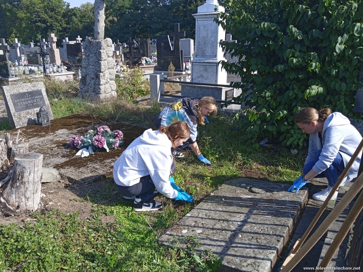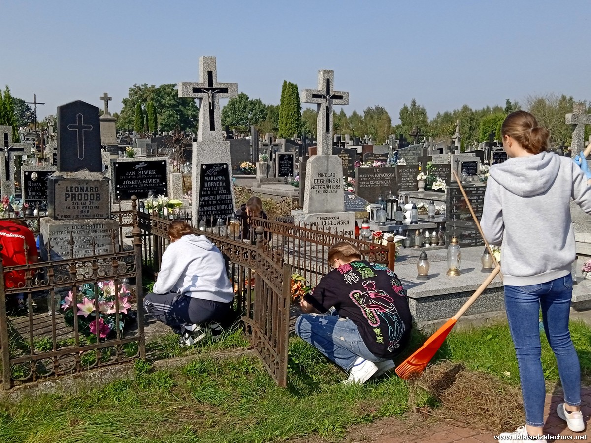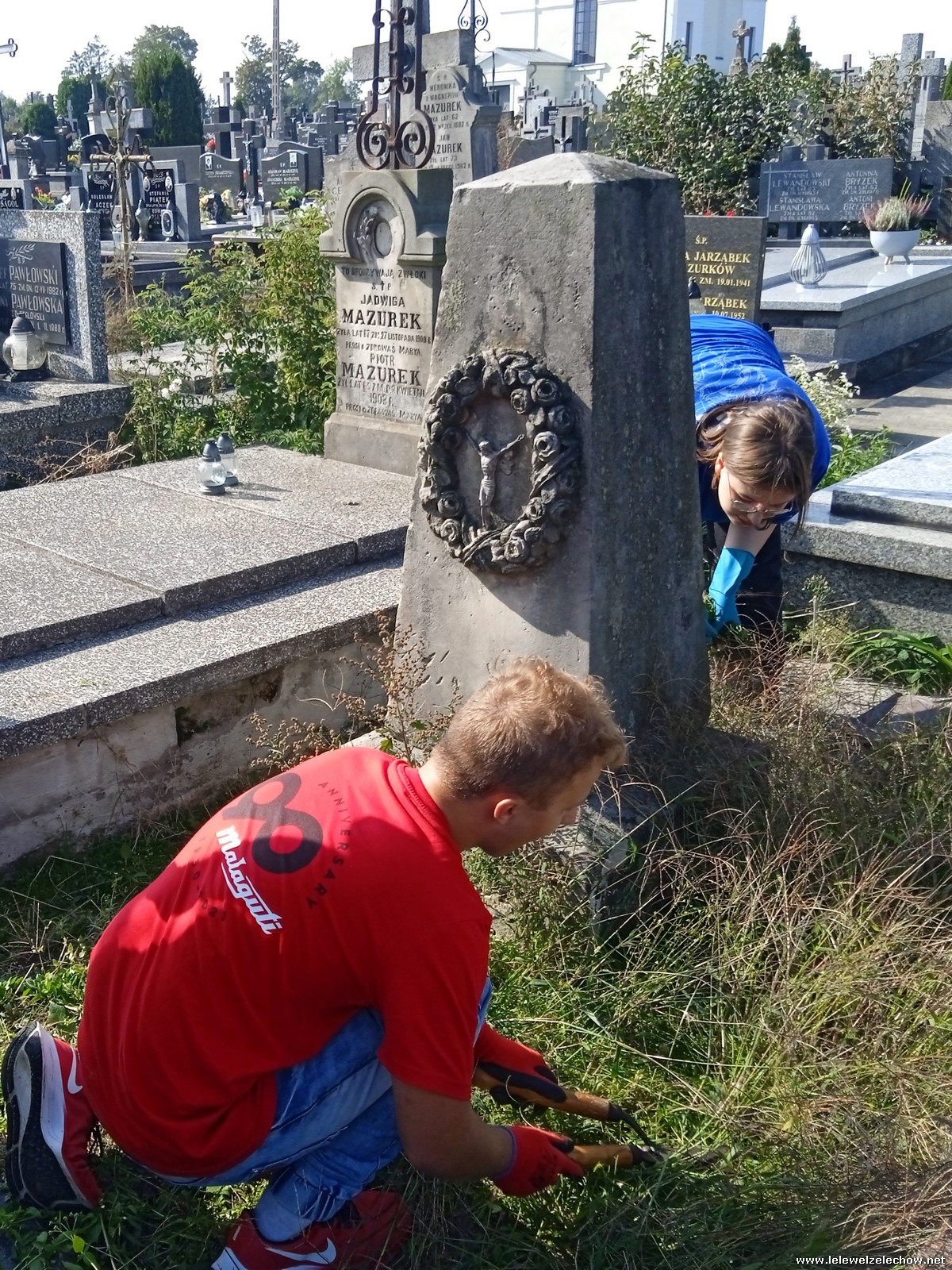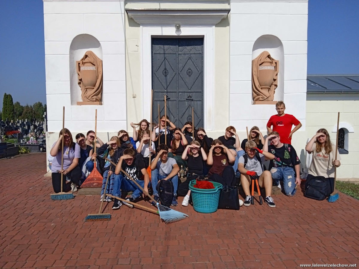Tradycyjne sprzątanie zabytkowych nagrobków na cmentarzu w Żelechowie. Przy sprzyjającej wrześniowo-letniej pogodzie prace porządkowe, pod kierunkiem p.Urszuli Kobielus, wykonali uczniowie klas 2ab.