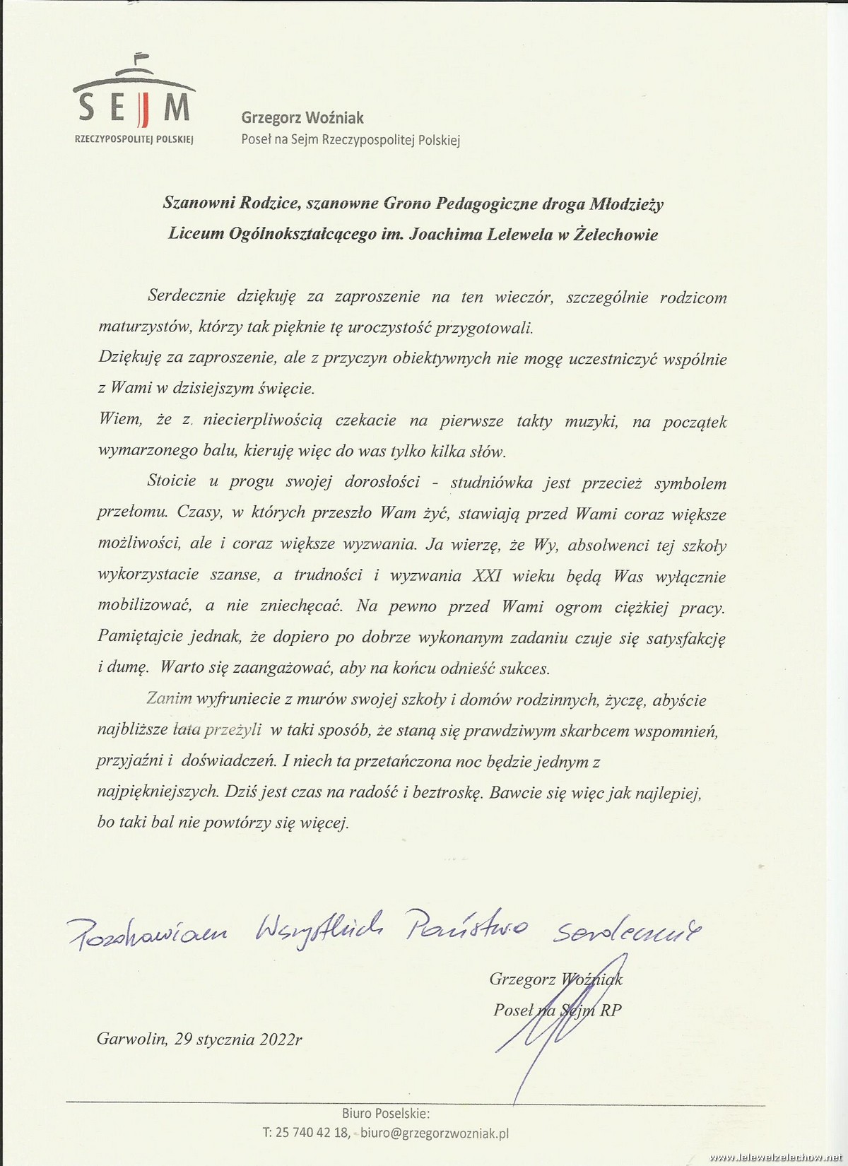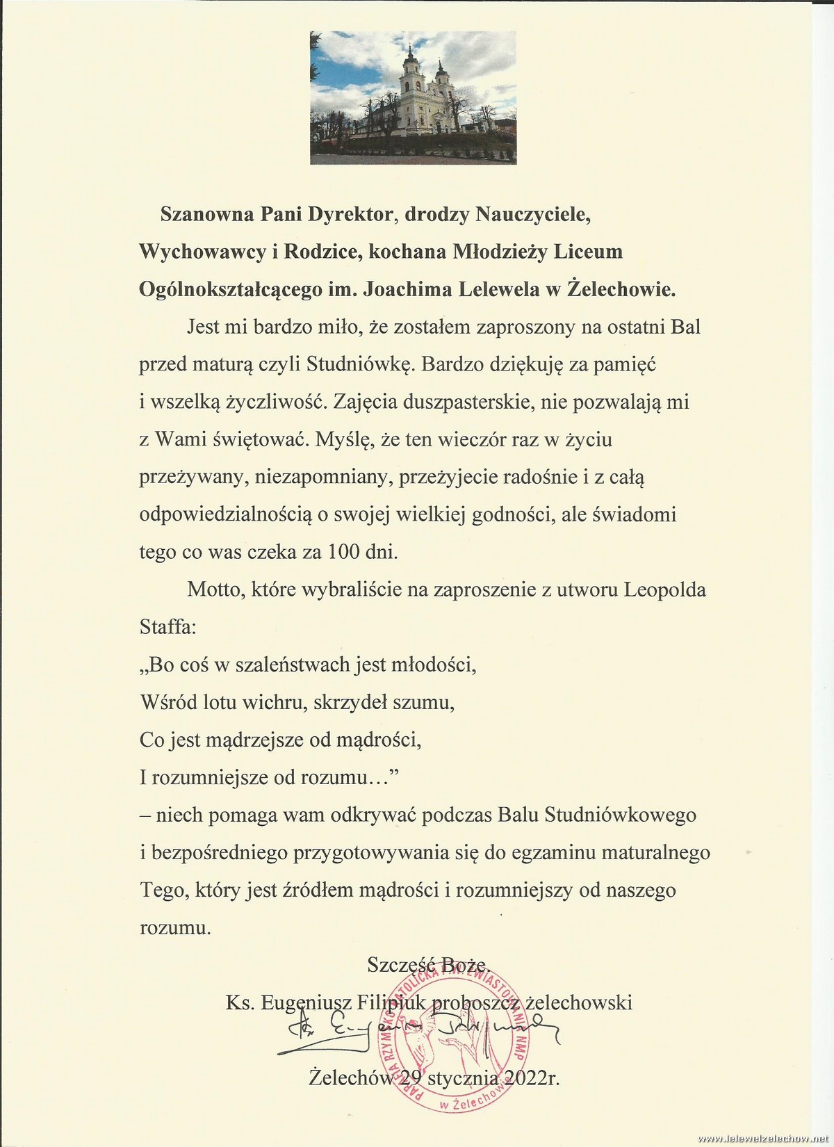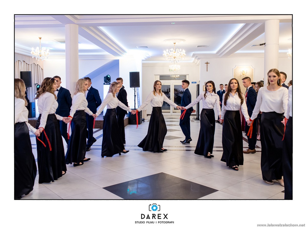 Młodzież z dwóch klas maturalnych wraz z wychowawczyniami, nauczycielami i rodzicami świętowała wyjątkową uroczystość - bal odbywający się tradycyjnie sto dni przed maturą. Rozpoczął się on przemówieniem pani Dyrektor, która po powitaniu zgromadzonych, podkreśliła wyjątkowy czas, jakim były lata nauki w liceum, integracja we wspólnych działaniach, pracach, spotkaniach. Odczytała także listy od Gości, którzy, ze względu na pandemiczną sytuację, nie mogli przybyć. Słowa do zgromadzonych skierowali: Poseł na Sejm Rzeczypospolitej Polskiej pan Grzegorz Woźniak, Starosta Powiatu Garwolińskiego pan Mirosław Walicki, Wicestarosta Powiatu Garwolińskiego pan Marek Ziędalski, Przewodniczący Rady Powiatu Garwolińskiego pan Waldemar Trzaskowski. Ksiądz Leszek Mućka zabrał głos w imieniu Księdza Eugeniusza Filipiuka, Proboszcza żelechowskiej parafii. Wszyscy podkreślali wyjątkowość i ulotność trwającej chwili, życzyli zgromadzonym udanej zabawy. Następnie wystąpiła przewodnicząca Komitetu Studniówkowego, pani Irena Jadanowska, dziękując nauczycielom za czas i uwagę poświęcone licealistom. Młodzież, zwracając się do grona pedagogicznego, pracowników szkoły oraz rodziców, wyraziła słowa wdzięczności za wsparcie w procesie nauczania, troskę i cierpliwość, którymi byli otaczani w czasie nauki w szkole średniej. Podkreślili świadomość tego, że za kilka miesięcy ich wspólna droga się zakończy i każdy, biorąc odpowiedzialność za własne życie, wybierze swoją własną ścieżkę. Obiecali też, że po balu studniówkowym skoncentrują się na nauce, aby jak najlepiej mogli poradzić sobie na majowych egzaminach maturalnych. Część oficjalną zakończył pięknie wykonany przez maturzystów polonez, przygotowany pod czujnym okiem nauczycielki wychowania fizycznego, pani Joanny Włodarczyk.
