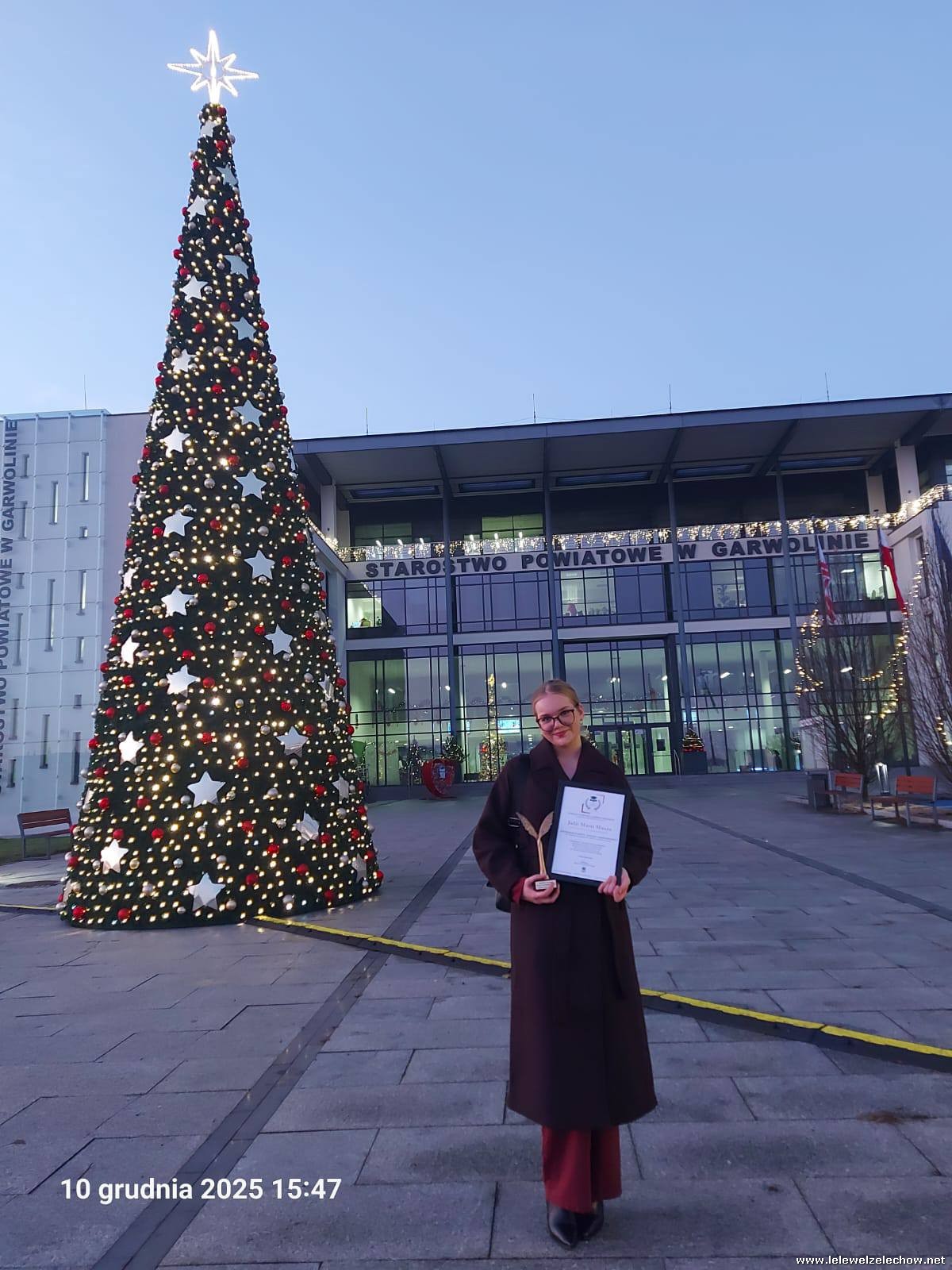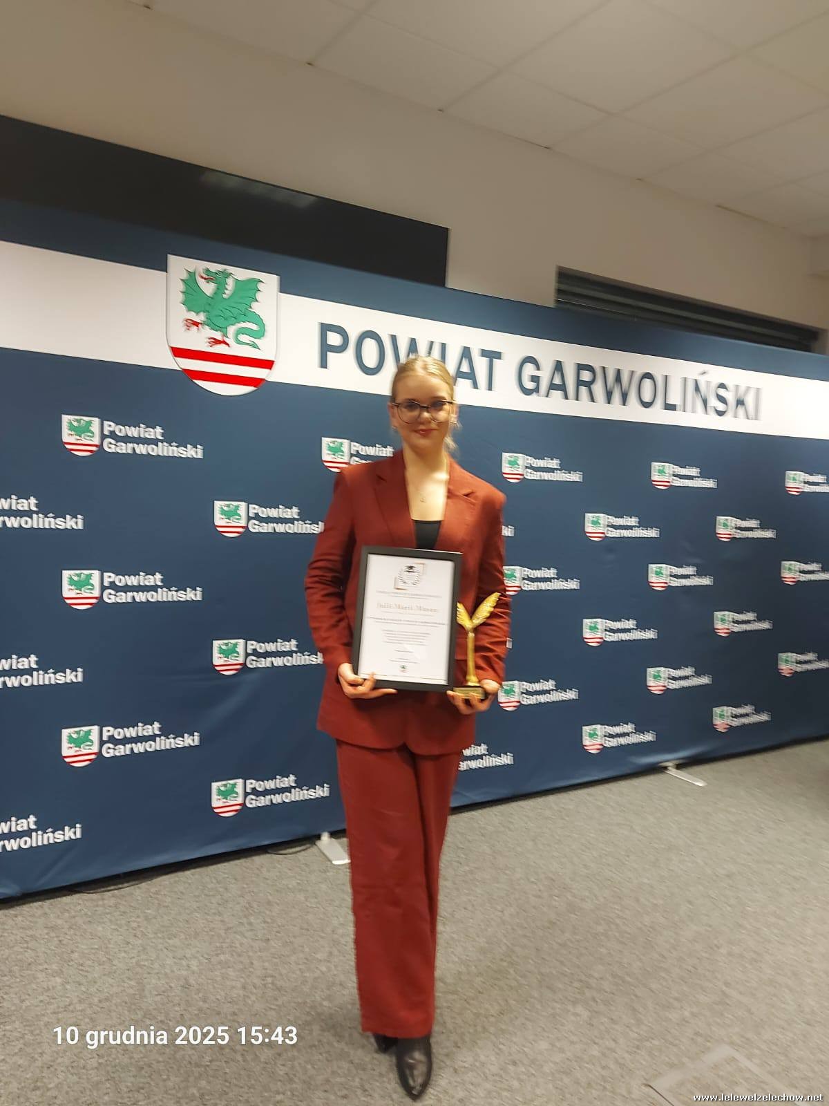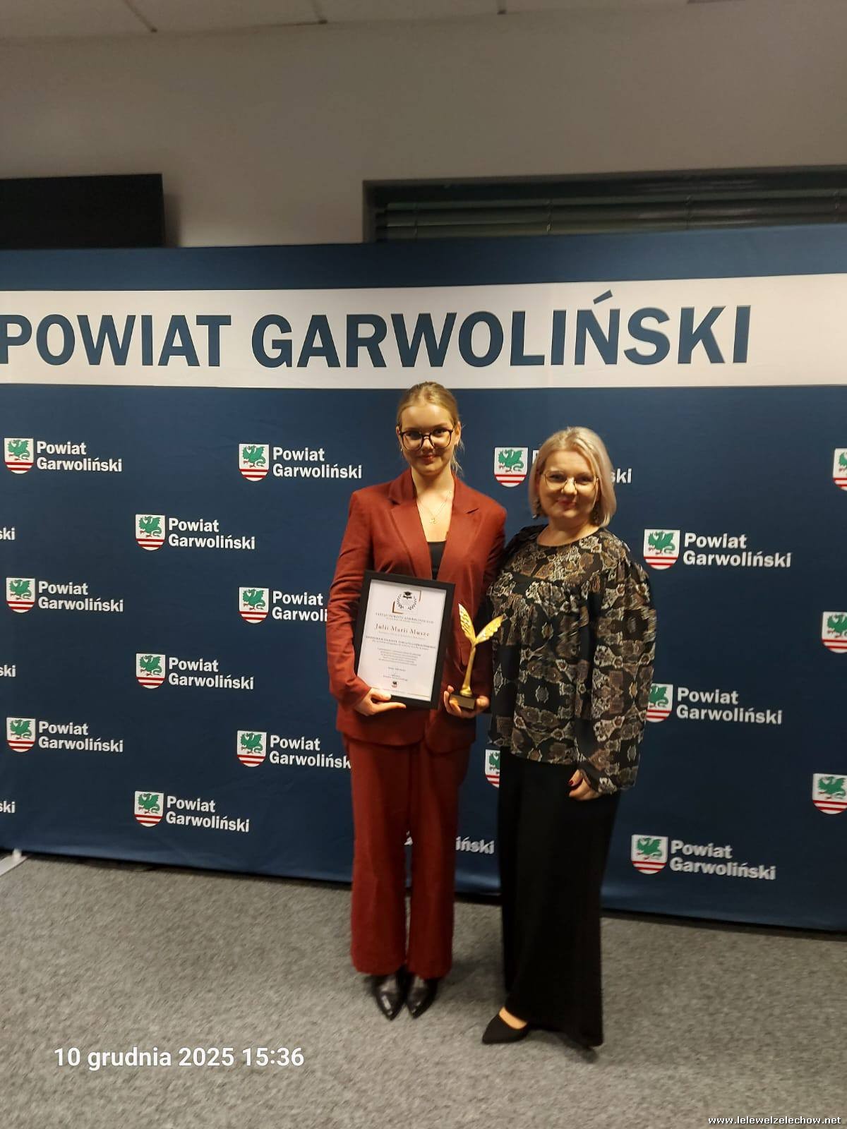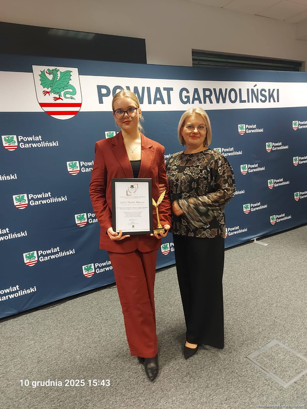 Julia Mucha otrzymała Stypendium Starosty Powiatu Garwolińskiego dla uczniów osiągających wybitne wyniki w nauce oraz wykazujących się zaangażowaniem społecznym.