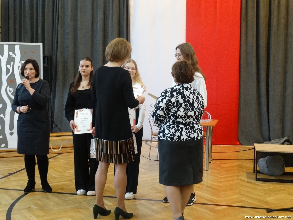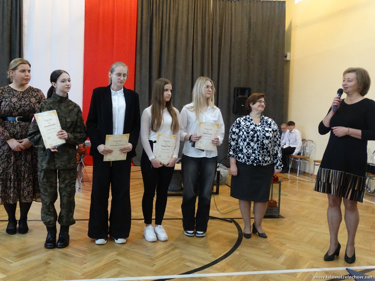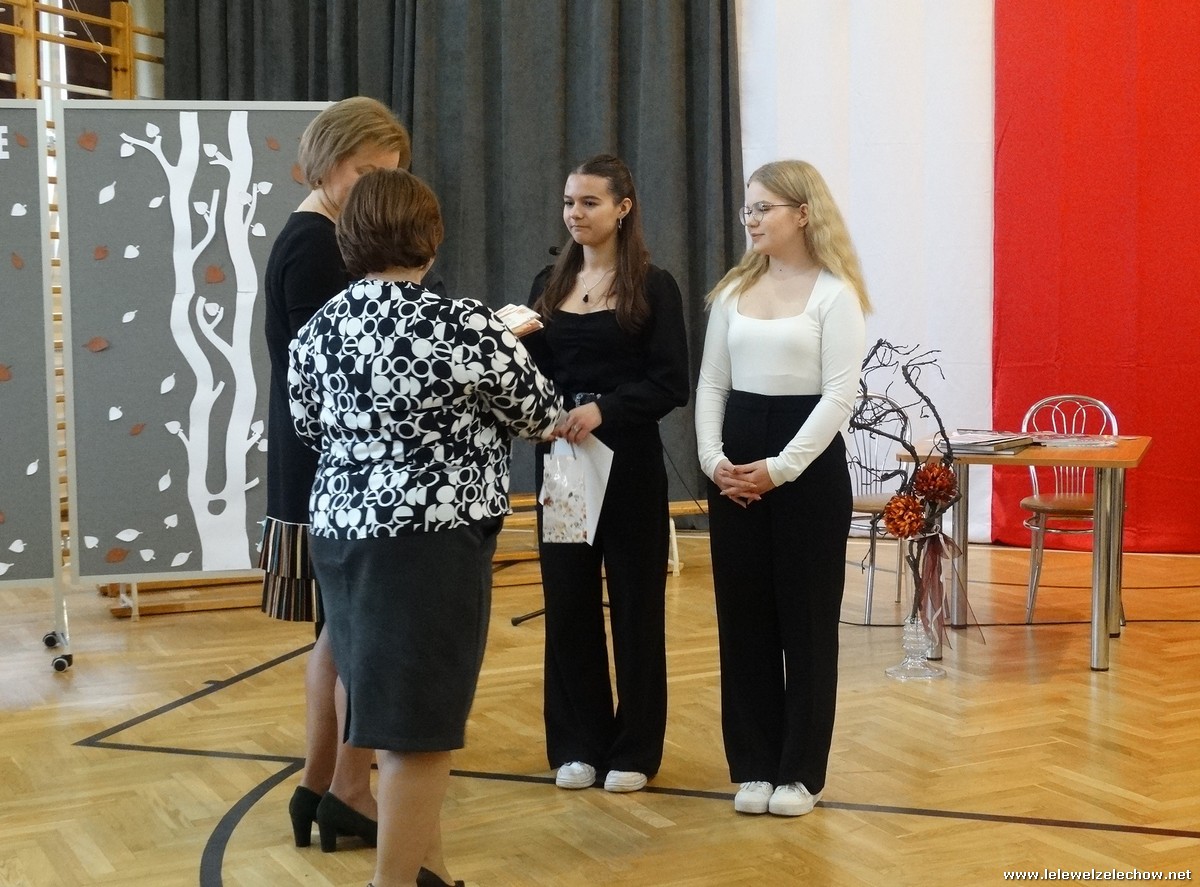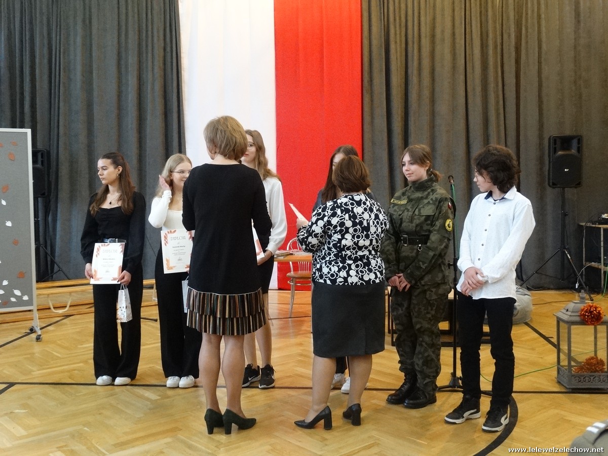 Pani Anna Włodarczyk wyróżniła uczniów za konkurs recytatorski poezji Wisławy Szymborskiej. Pani Anetta Dziak przyznała nagrody w konkursie fotograficznym ,,Złota polska jesień”. Pani Urszula Kobielus podziękowała uczniom za udział w Sympozjum Kościuszkowskim w Sobolewie - przygotowane wystąpienie oraz udział w konkursie a także wręczyła nagrody w konkursie o szkole i Patronie.