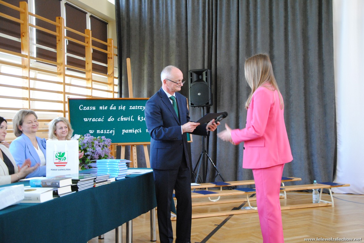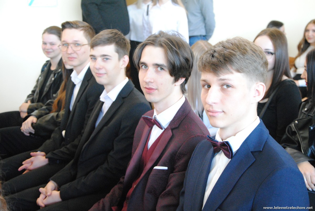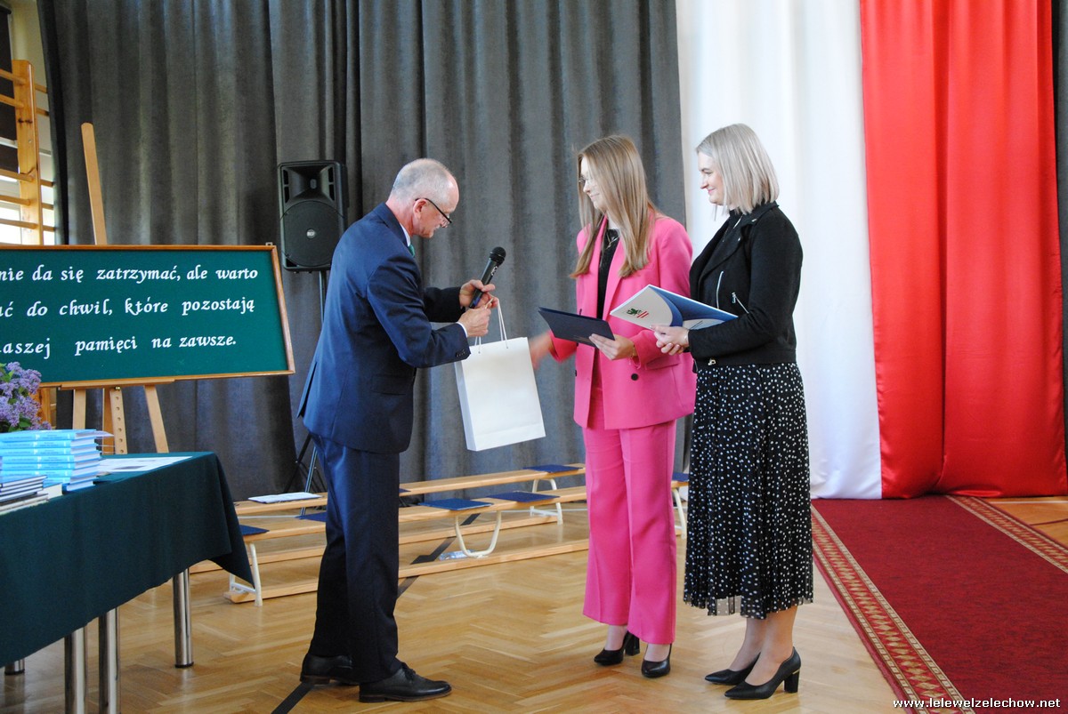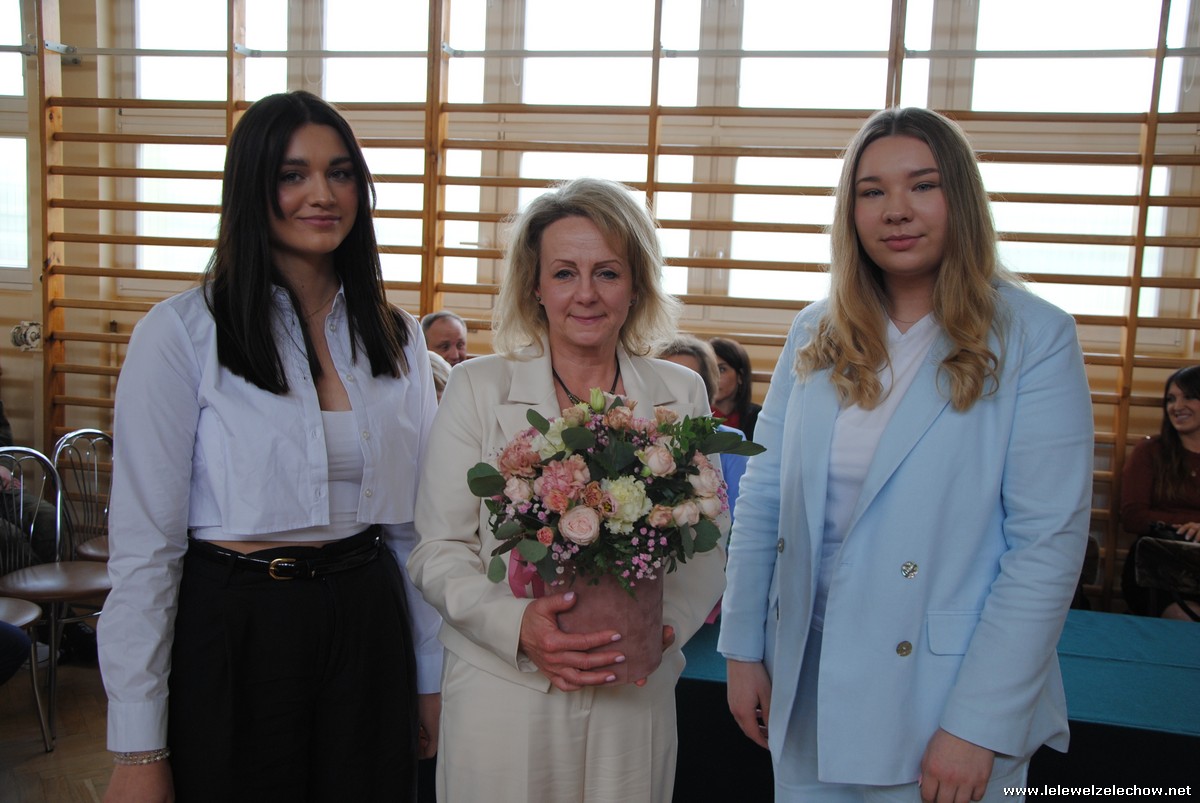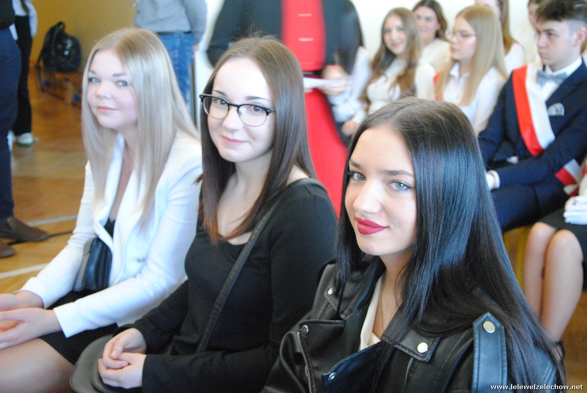 Głos zabrali również zaproszeni goście. Pan Krzysztof Ośka – członek zarządu Powiatu Garwolińskiego odczytał list pana Mirosława Walickiego - Starosty Powiatu Garwolińskiego, skierował do uczniów ciepłe słowa oraz wręczył nagrodę dla najlepszej uczennicy – Oliwii Długaszek. Pan Łukasz Bogusz – Burmistrz Żelechowa w swoim wystąpieniu podkreślił, że też jest absolwentem Lelewela i z sentymentem wspomina czas spędzony w tej szkole. Życzył maturzystom wielu sukcesów w dorosłym życiu oraz powodzenia na egzaminach maturalnych. Z rąk Pana Burmistrza nagrodę otrzymała Maria Majek za udział w uroczystościach lokalnych i godne reprezentowanie Gminy Żelechów.