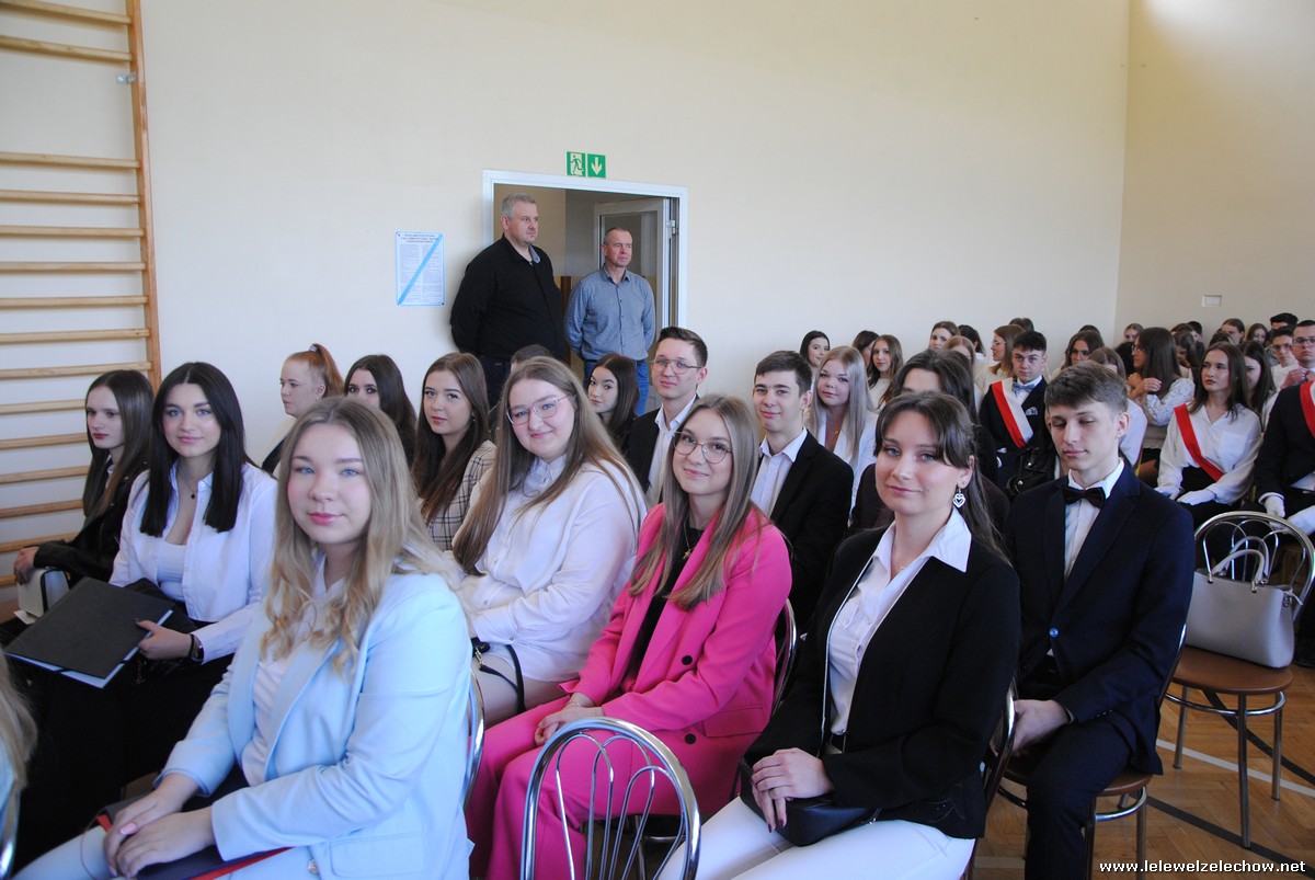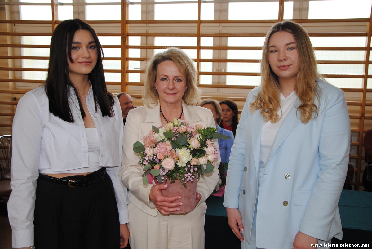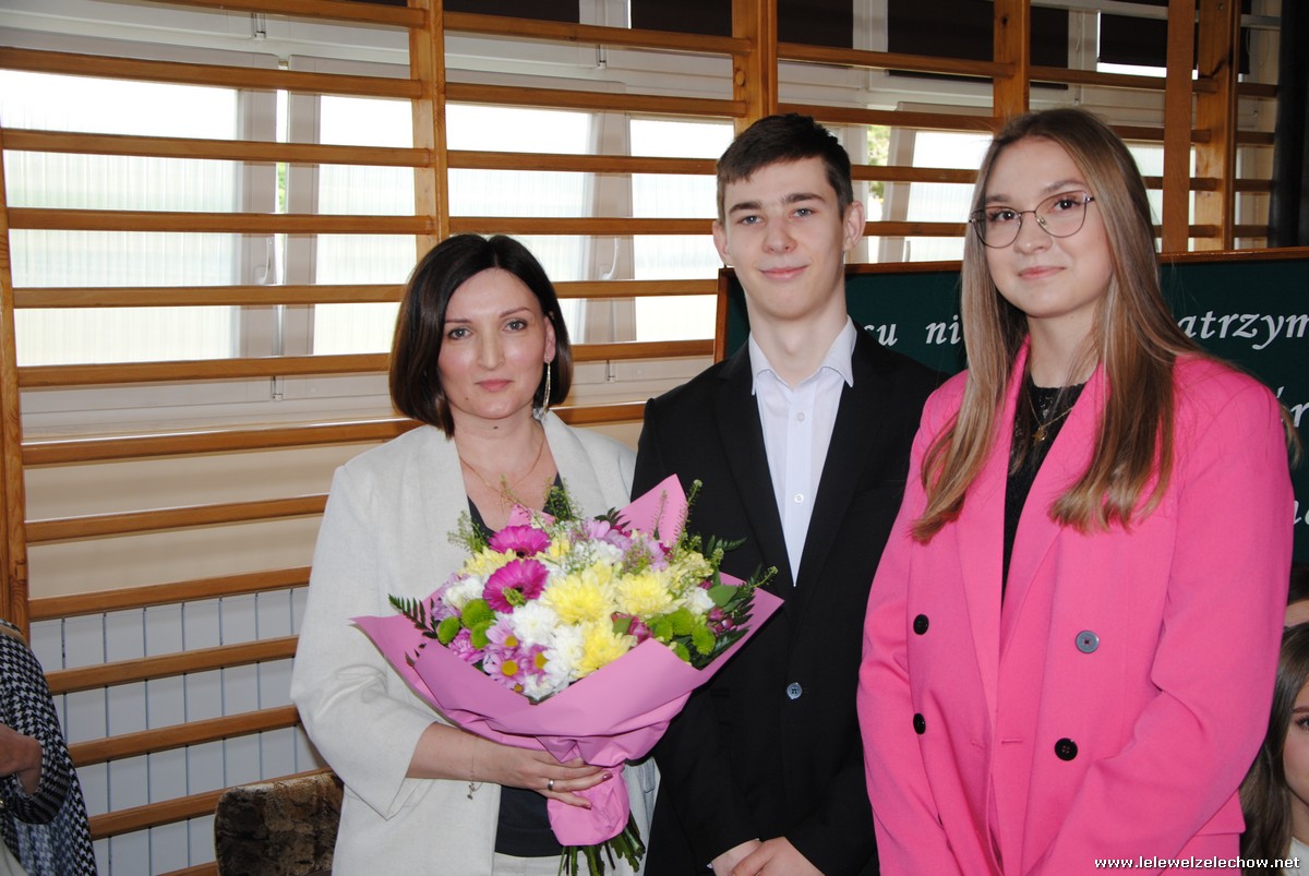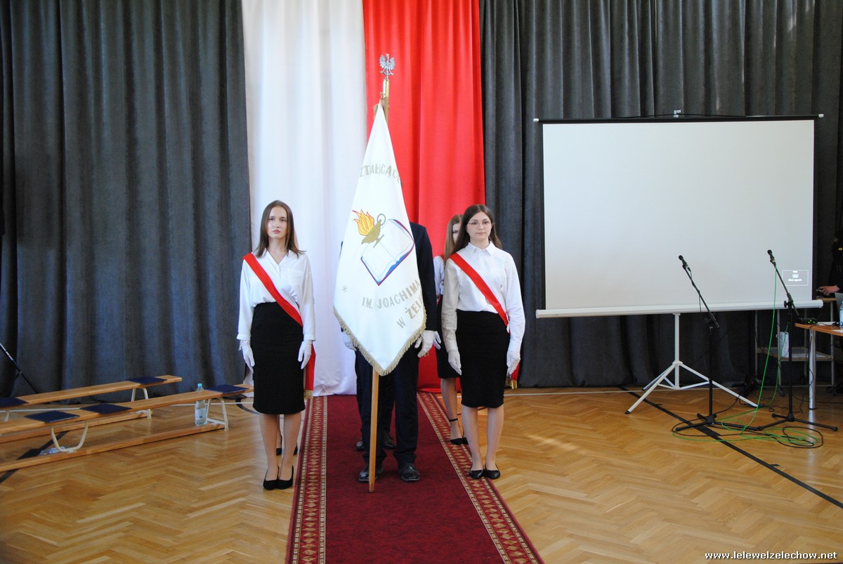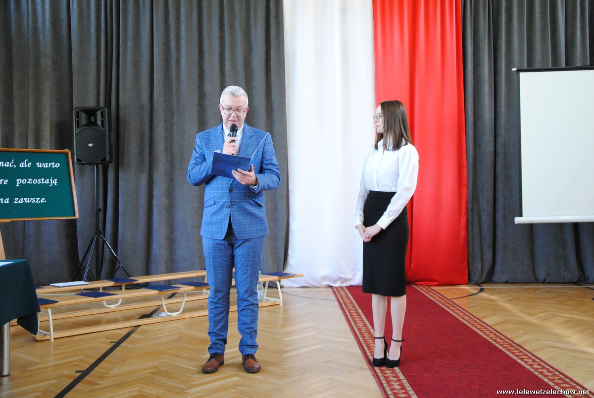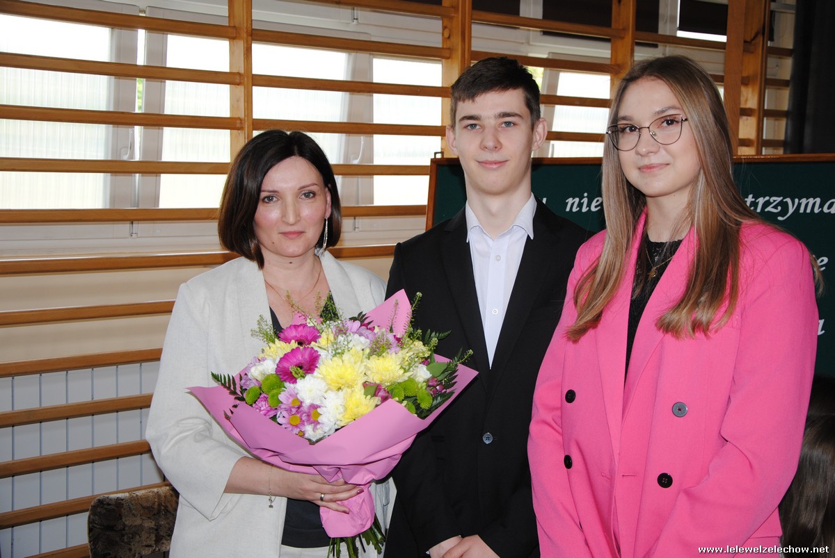 Głos zabrali również zaproszeni goście. Pan Krzysztof Ośka – członek zarządu Powiatu Garwolińskiego odczytał list pana Mirosława Walickiego - Starosty Powiatu Garwolińskiego, skierował do uczniów ciepłe słowa oraz wręczył nagrodę dla najlepszej uczennicy – Oliwii Długaszek. Pan Łukasz Bogusz – Burmistrz Żelechowa w swoim wystąpieniu podkreślił, że też jest absolwentem Lelewela i z sentymentem wspomina czas spędzony w tej szkole. Życzył maturzystom wielu sukcesów w dorosłym życiu oraz powodzenia na egzaminach maturalnych. Z rąk Pana Burmistrza nagrodę otrzymała Maria Majek za udział w uroczystościach lokalnych i godne reprezentowanie Gminy Żelechów.