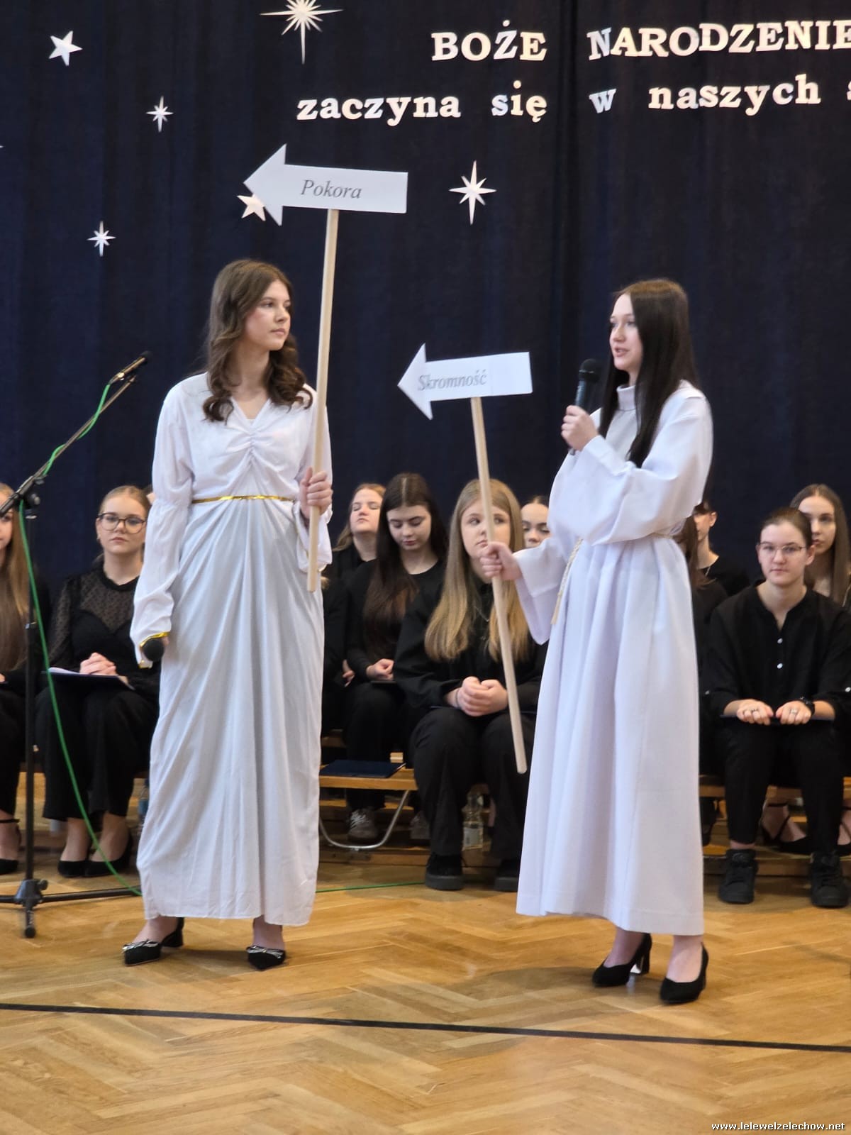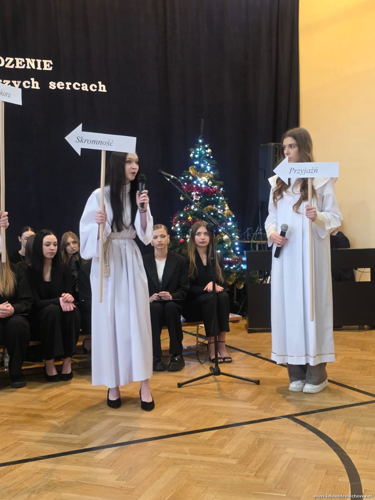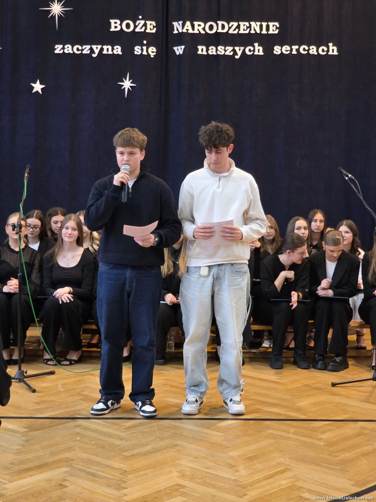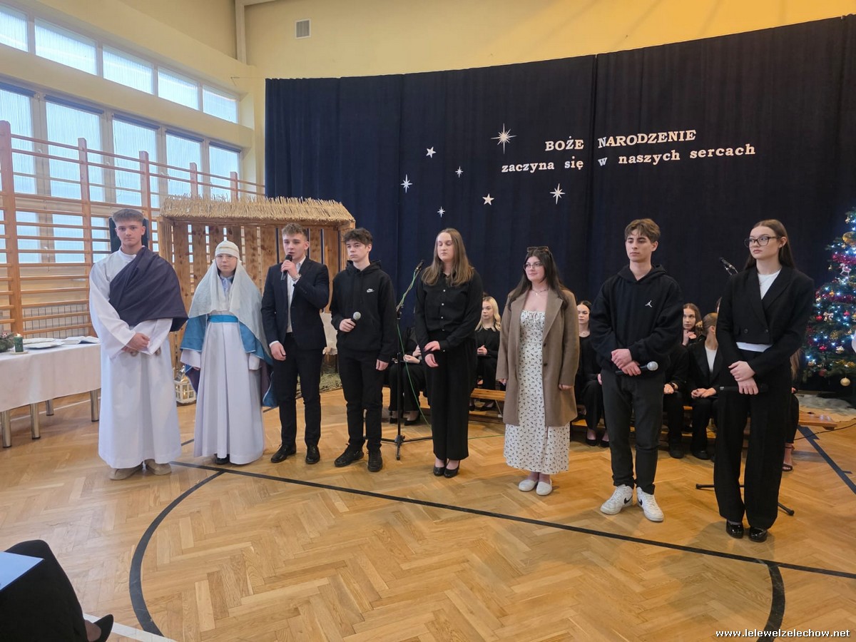 W tym roku jasełkom przyświecało hasło "W drodze do Betlejem". Uczniowie klas drugich w kilku scenkach uświadomili nam, że w świętach najważniejsze jest spotkanie z Bogiem i drugim człowiekiem, a Boże Narodzenie zaczyna się w naszych sercach. Solistki i chórek klas drugich przy wsparciu starszych koleżanek pięknie zaśpiewali kolędy. Po jasełkach goście, pani dyrektor Sylwia Tomaszek, przedstawiciele Samorządu Uczniowskiego złożyli życzenia, następnie ksiądz Mariusz Rompa odczytał fragment Pisma Świętego, po czym podzieliliśmy się opłatkiem.