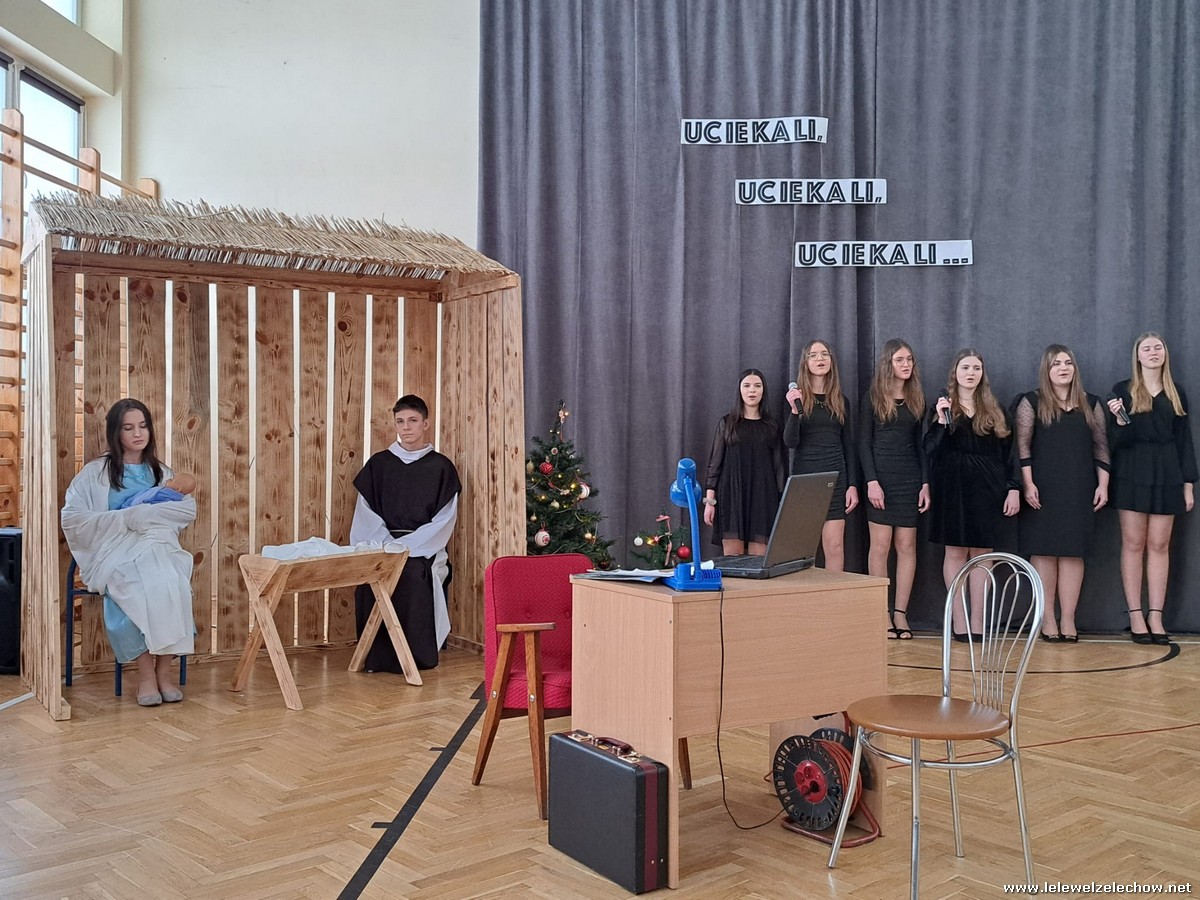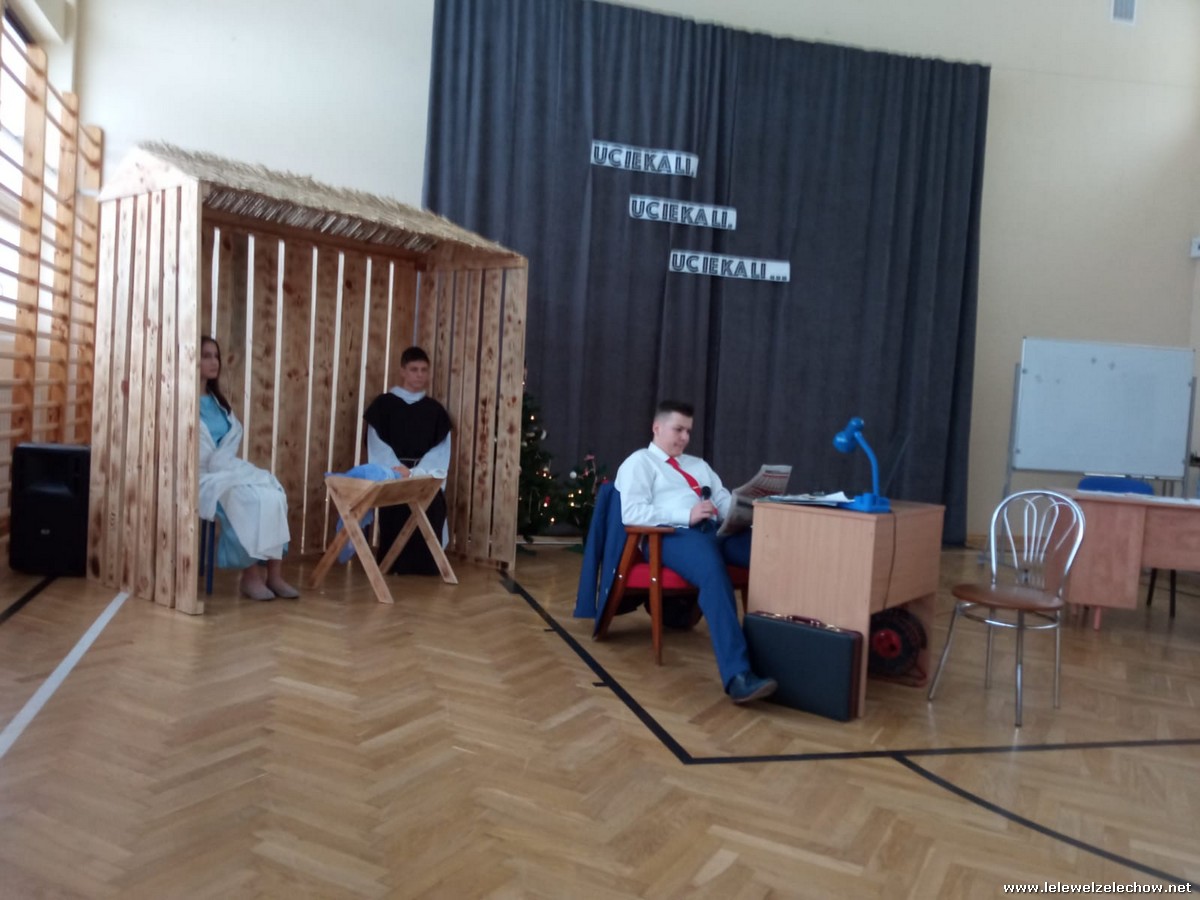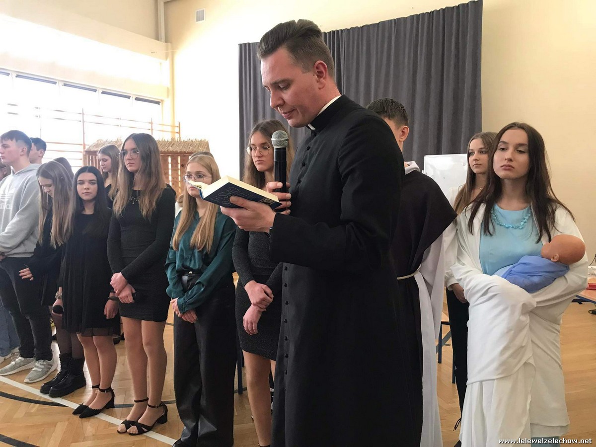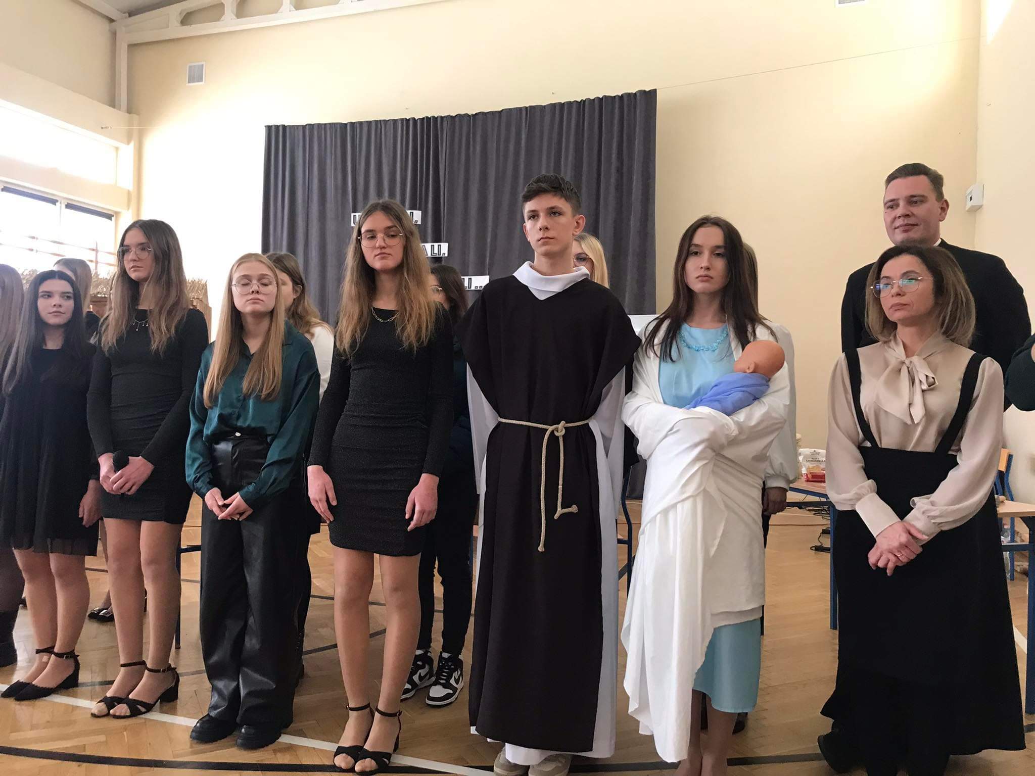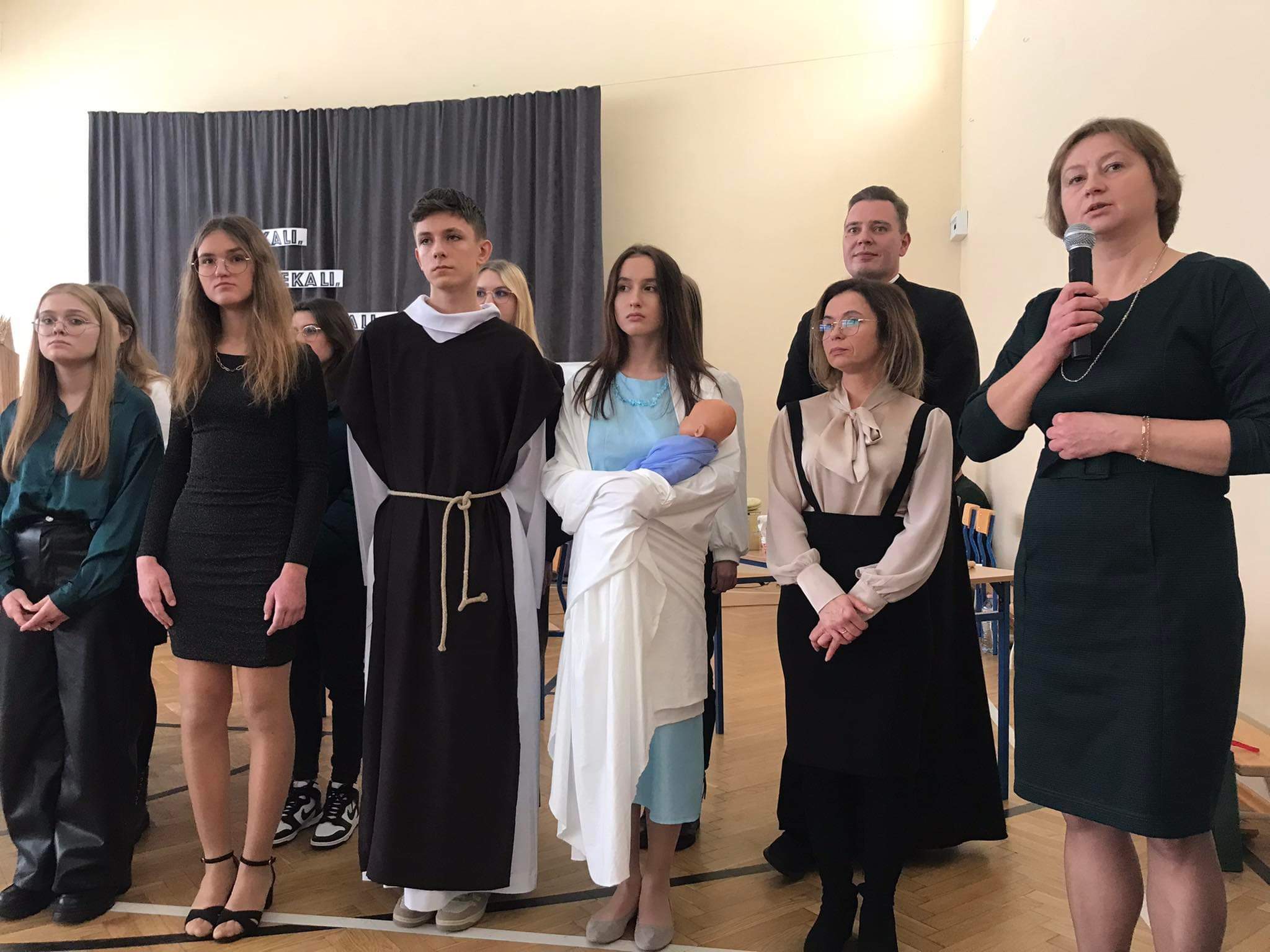 W tygodniu poprzedzającym Święta Bożego Narodzenia w naszej szkole odbyła się niejedna wigilia. Każda z klas spotkała się przy wspólnym stole, podzieliła się opłatkiem, życząc sobie dobra i piękna. To wyjątkowy, magiczny czas, który wprowadza nas w te najbardziej wyczekiwane święta w roku. I mimo tego, że zarówno w szkole, jak i w domu obowiązków nie brakowało, to dało się odczuć radość i atmosferę oczekiwania. Szczególnie doświadczyliśmy tego podczas Szkolnej Wigilii, która była okazją do spotkania sią całej społeczności szkolnej. Mogliśmy podczas niej wejść głębiej w tajemnice Bożego Narodzenia i zastanowić się, co ten czas dla nas znaczy. Umożliwili nam to uczniowie, którzy pod opieką księdza Mariusza Rompy i pani Anny Majewskiej przygotowali piękny i pełen głębokich treści program artystyczny. Każdy z uczestników wigilii, o ile uważnie oglądał i słuchał, mógł odnaleźć w tym przedstawieniu siebie. Poszczególne scenki przeplatane kolędami były okazją do refleksji nad własnym życiem. Dziękujemy wszystkim uczestnikom programu za tak wiele mądrych myśli i wzruszeń, za piękny śpiew i akompaniament, za wymowną scenkę spotkania przy stajence. Podczas spotkania nie zabrakło też kolęd i życzeń, które składaliśmy sobie nawzajem. Do całej społeczności szkolnej zwrócili się: Pani Dyrektor, Ksiądz prałat Eugeniusz Filipiuk, Ksiądz Mariusz Rompa, Samorząd Uczniowski. Niech święta Bożego Narodzenia napełnią nas nadzieją, dobrem, życzliwością i abyśmy potrafili dzielić się tym wszystkim z drugim człowiekiem.