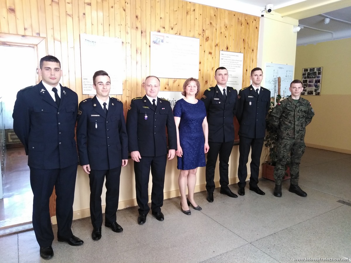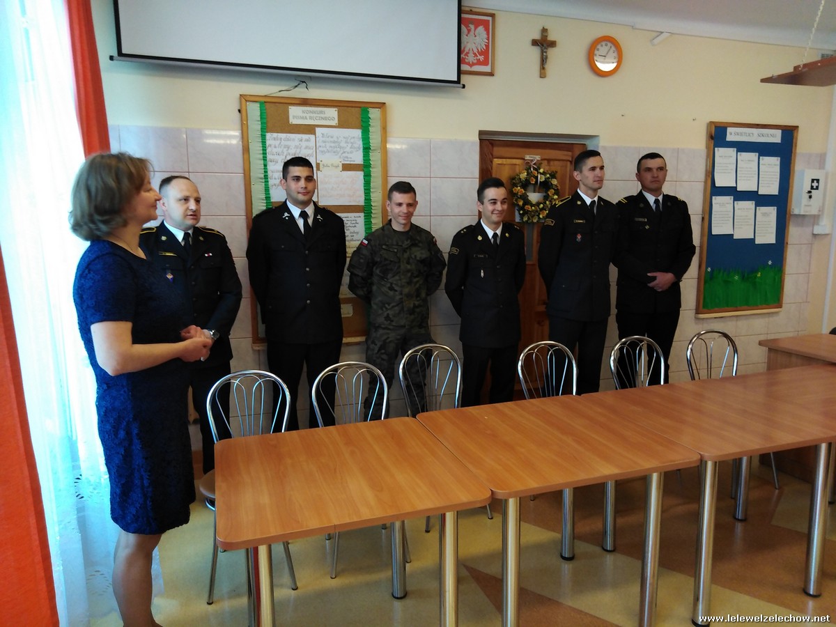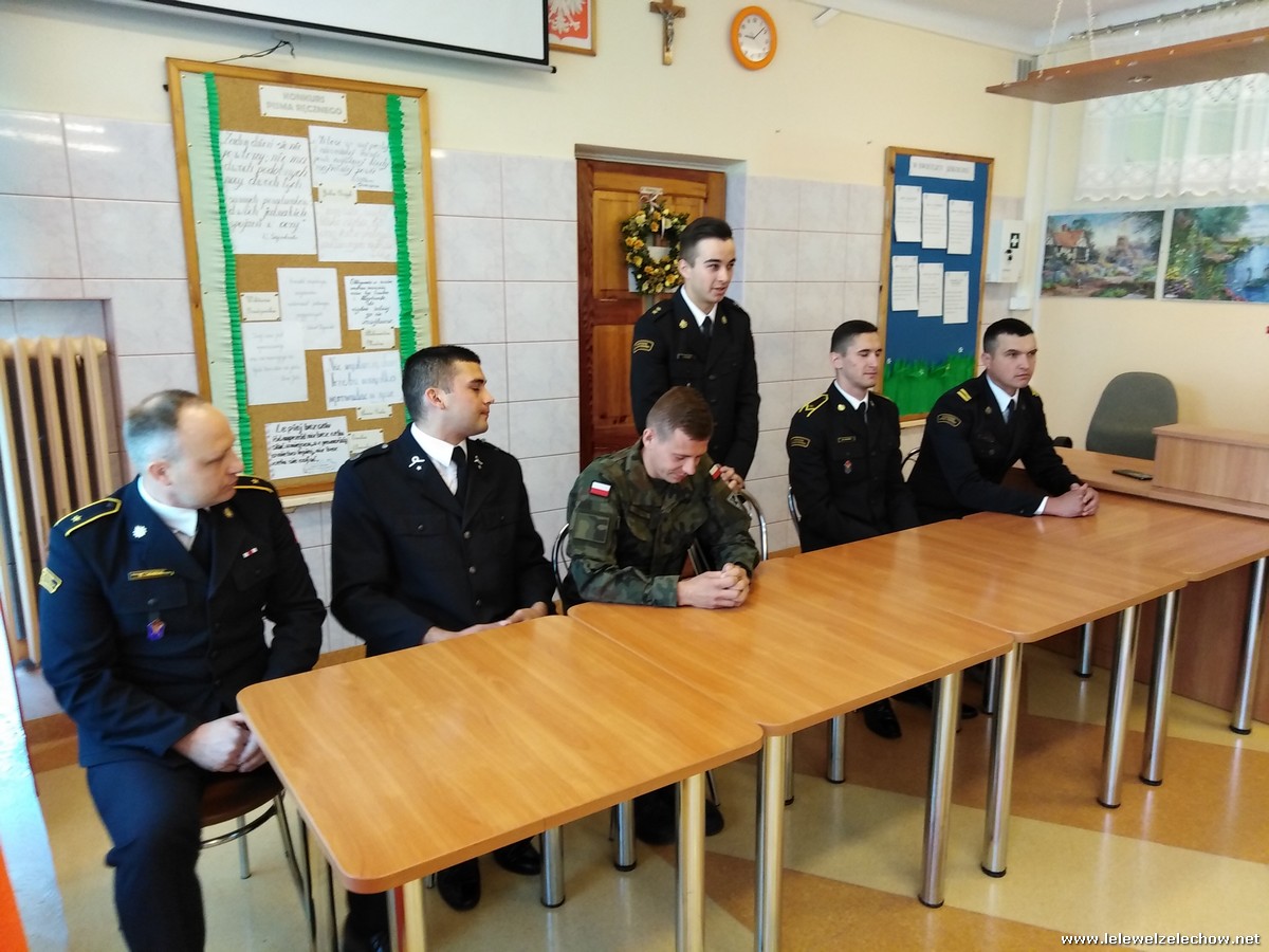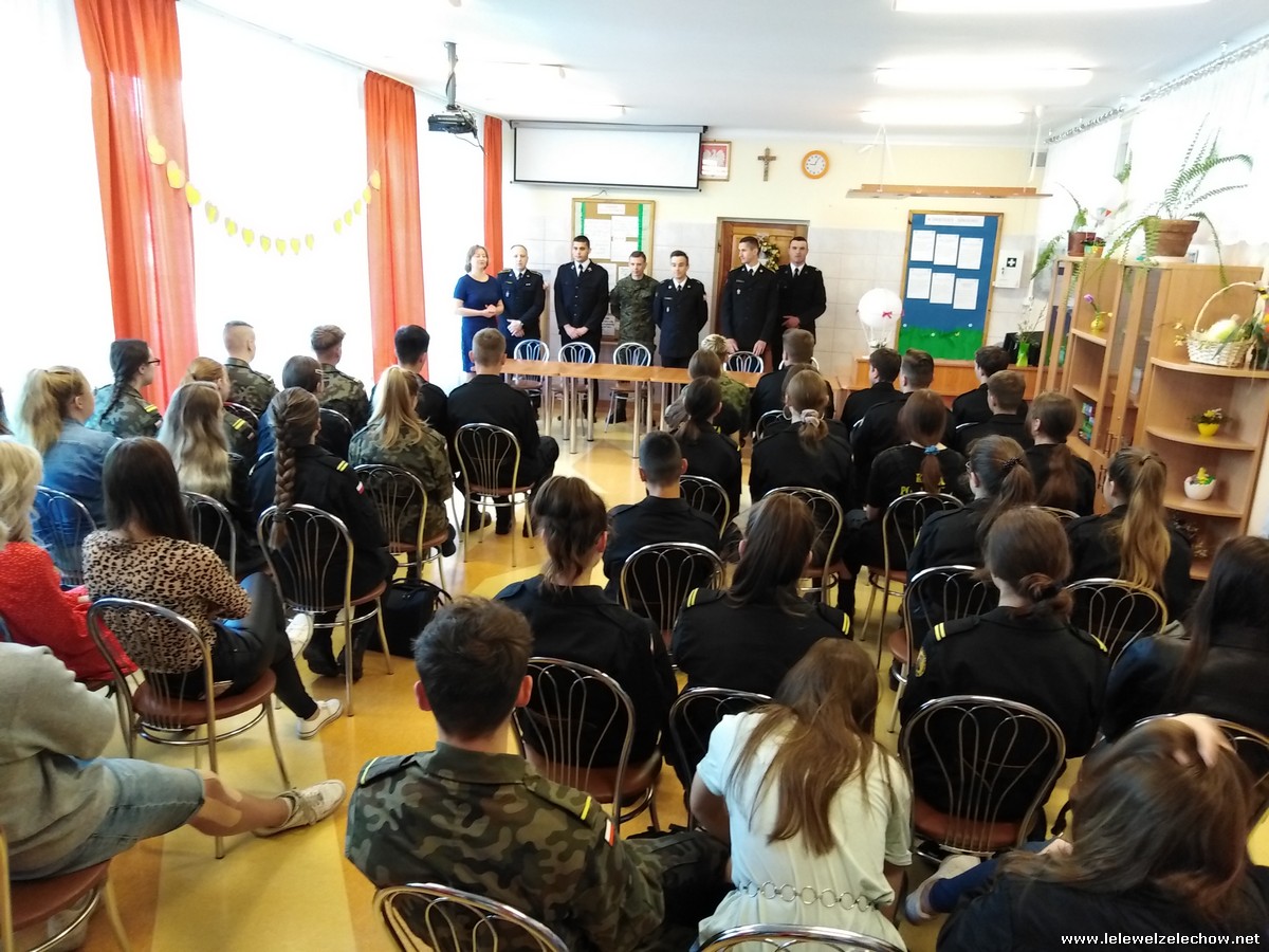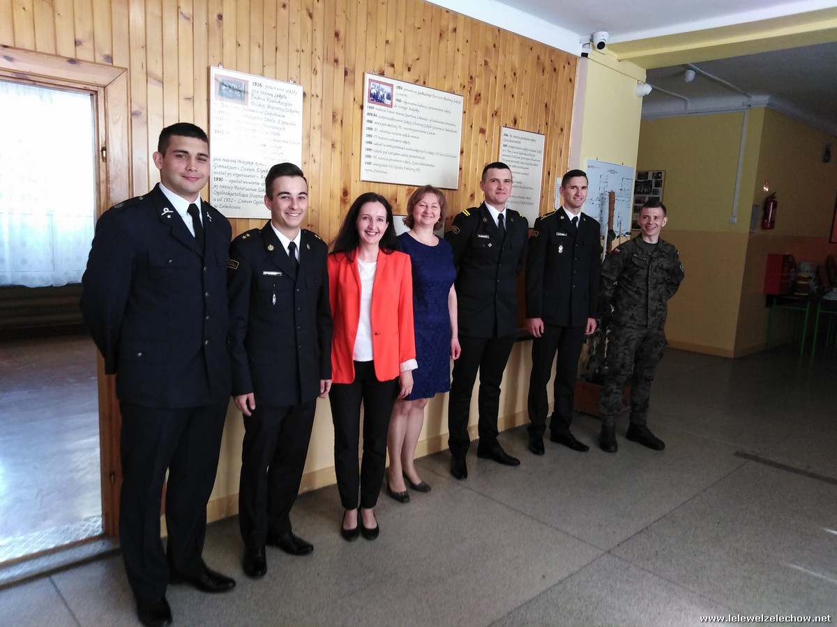 Na zaproszenie naszego niezastąpionego sora pana asp. Marcina Cicheckiego (który również jest funkcjonariuszem KP PSP w Garwolinie) panowie opowiedzieli zgromadzonej młodzieży "mundurowej" o swojej ścieżce do służby w Straży Pożarnej i odpowiedzieli na pytania uczniów. Chyba każdemu ze słuchaczy zaimponowała wytrwałość, z jaką realizowali swe cele i nadal pracują nad rozwojem osobistym. Dla nauczycieli to również było bardzo miłe spotkanie ze swoimi niedawnymi przecież uczniami Mamy nadzieję, że nasi goście z nie mniejszą radością odwiedzili szkolne mury