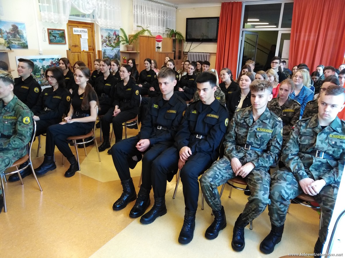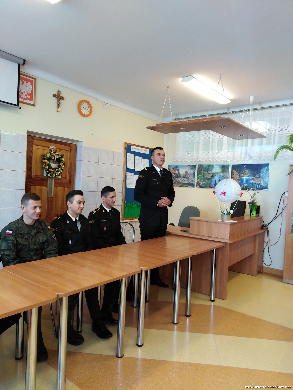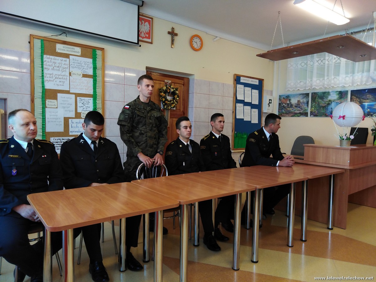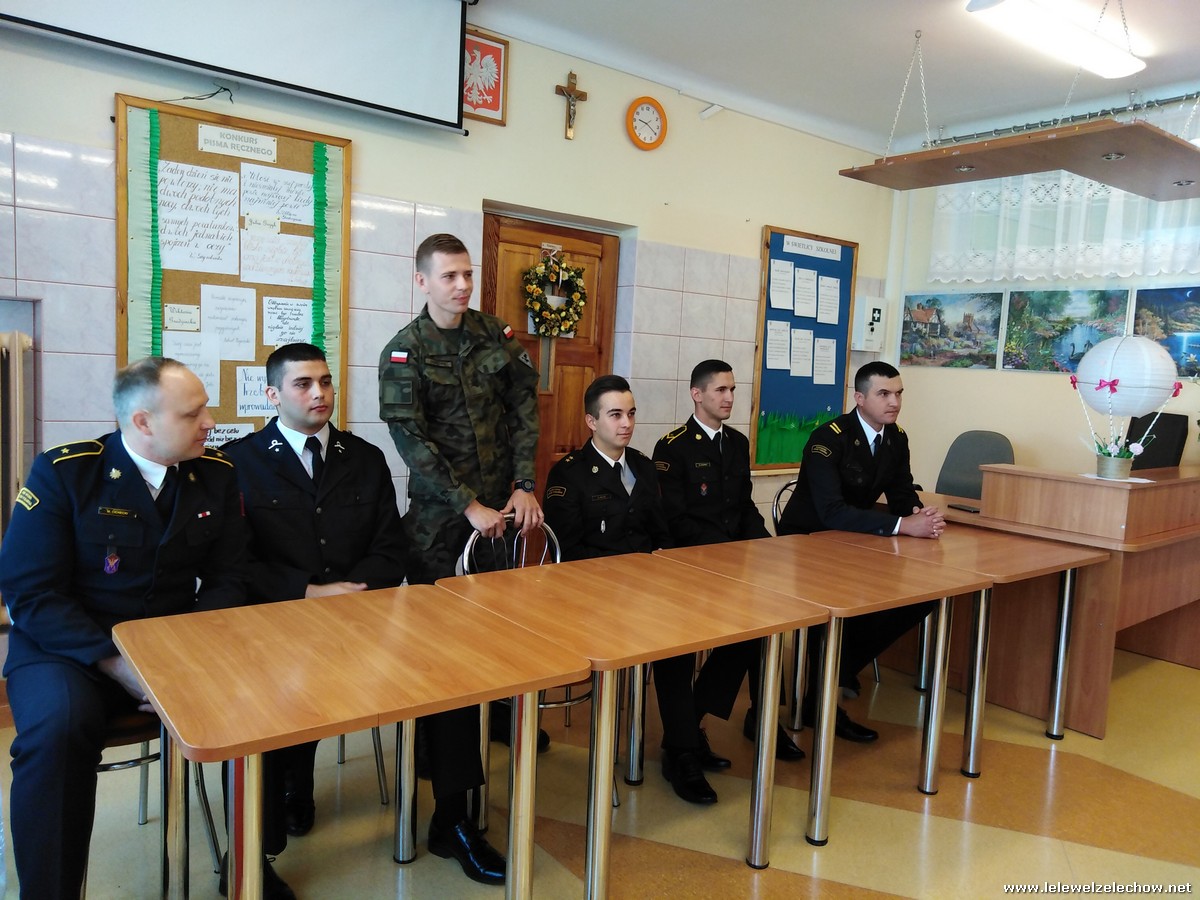 Na zaproszenie naszego niezastąpionego sora pana asp. Marcina Cicheckiego (który również jest funkcjonariuszem KP PSP w Garwolinie) panowie opowiedzieli zgromadzonej młodzieży "mundurowej" o swojej ścieżce do służby w Straży Pożarnej i odpowiedzieli na pytania uczniów. Chyba każdemu ze słuchaczy zaimponowała wytrwałość, z jaką realizowali swe cele i nadal pracują nad rozwojem osobistym. Dla nauczycieli to również było bardzo miłe spotkanie ze swoimi niedawnymi przecież uczniami Mamy nadzieję, że nasi goście z nie mniejszą radością odwiedzili szkolne mury