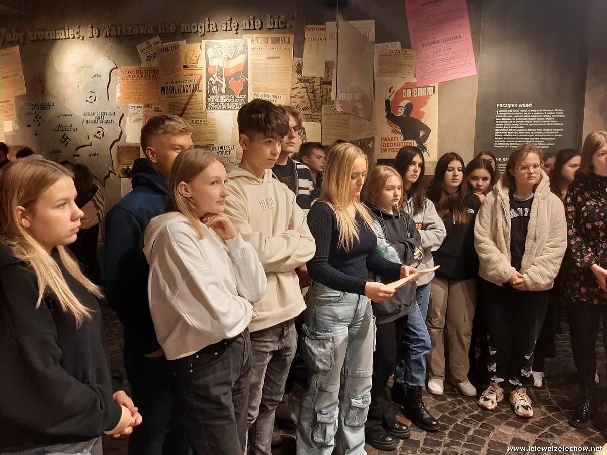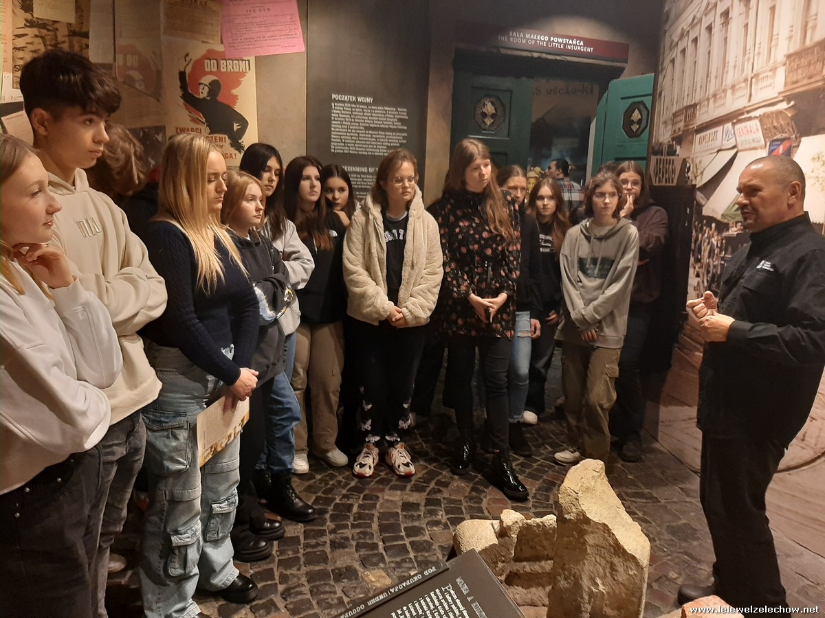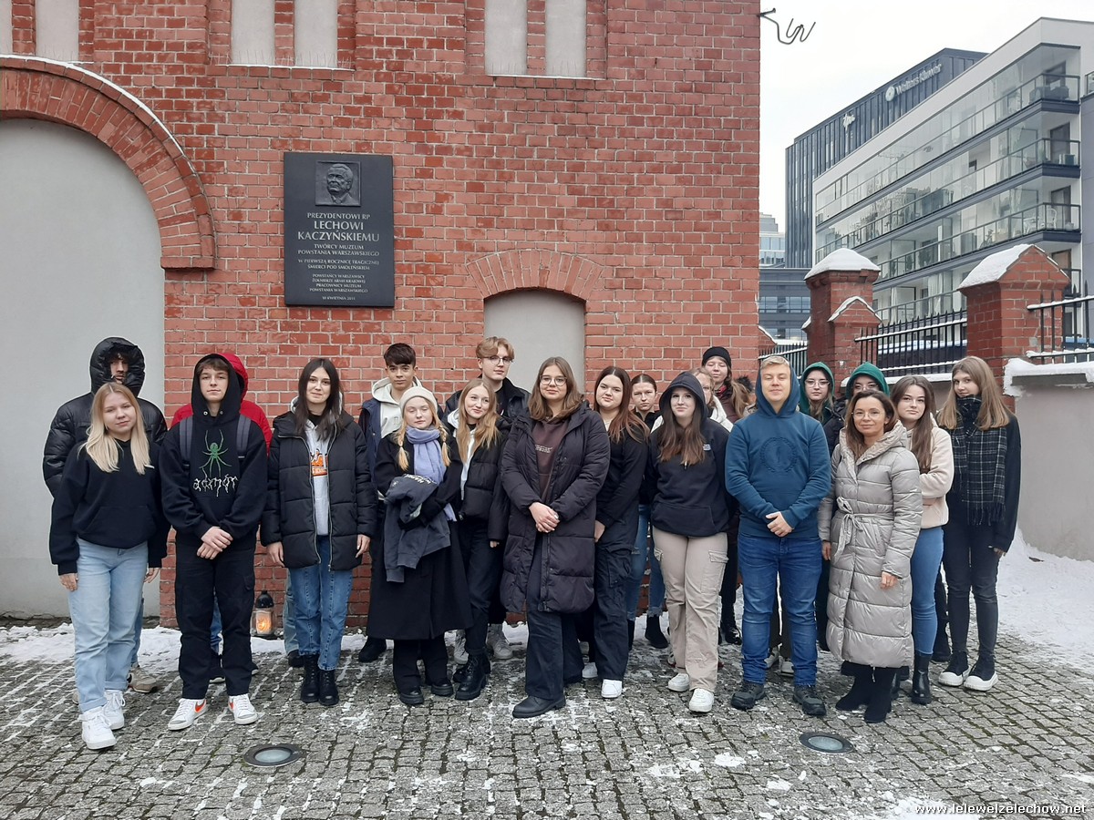 Grudniowe wycieczki mają swój niepowtarzalny klimat. Czuć już magię zbliżających się świąt, miasta przystrojone światełkami tworzą radosną atmosferę, a dodatkowo w tym roku od początku grudnia sypał śnieg. I właśnie w takim zimowym antruażu klasa 2b zastała stolicę 4 grudnia 2023 r., gdy przyjechała tu w ramach wycieczki. W programie było zwiedzanie Muzeum Powstania Warszawskiego. Pan przewodnik w zajmujący sposób opowiedział nam o dniach poprzedzających wybuch powstania oraz o jego przebiegu i upadku. Mogliśmy przypomnieć sobie to, co o wydarzeniach z sierpnia 1944 roku już wiedzieliśmy, ale też usłyszeliśmy wiele nowych informacji, np. o tym, które dzielnice włączały się w powstanie, w jaki sposób Niemcy prowadzili akcje propagandowe, jaka była kolejność walk powstańczych i jaką rolę odgrywało w nich przemieszczanie się kanałami. Usłyszeliśmy także o codziennym życiu w Warszawie oraz o roli kobiet w tym dramatycznym wydarzeniu. Obejrzeliśmy wstrząsający film „Miasto Ruin” - projekt przelotu nad zburzoną stolicą w technice 3D. Ogromne wrażenie zrobił na nas obraz wyludnionego miasta, jakim była Warszawa w 1945 roku orazwidok zniszczonych ulic ibudynków.