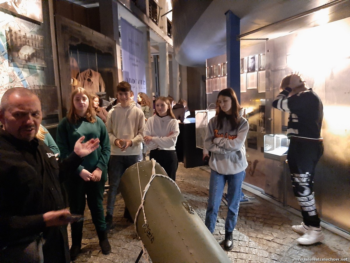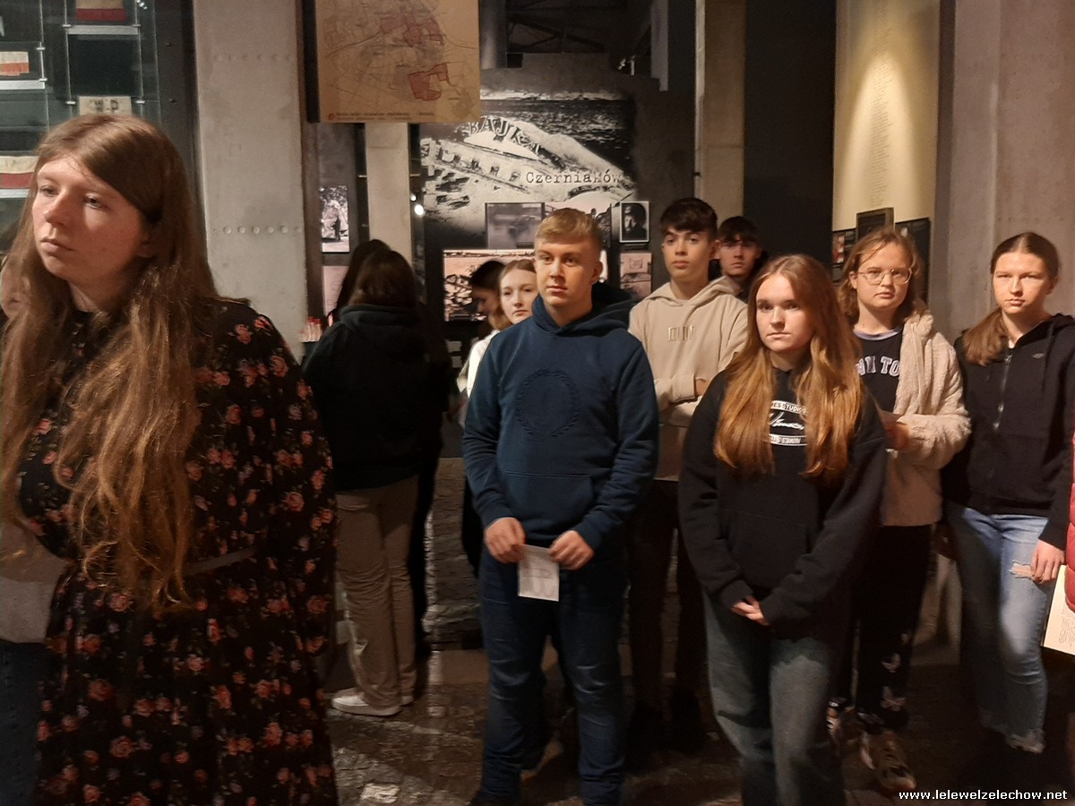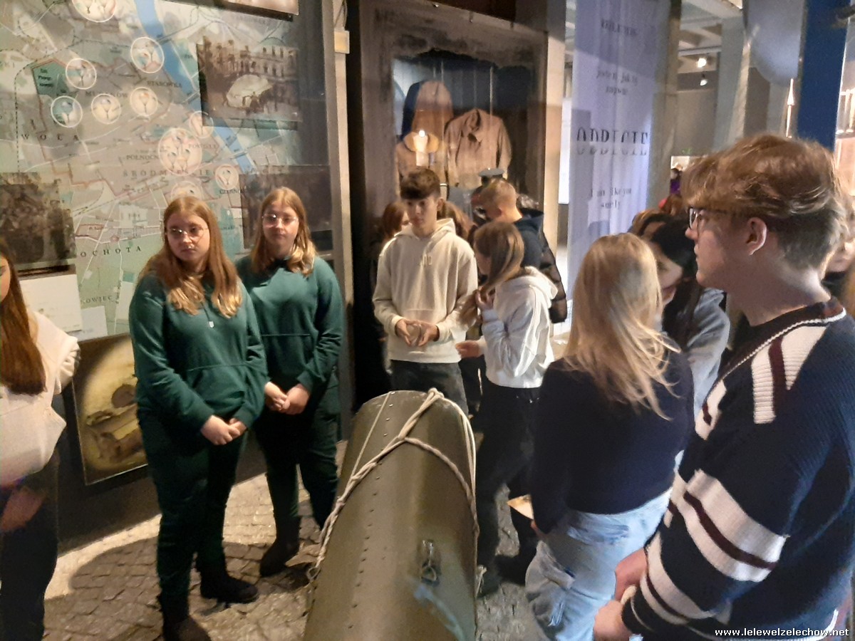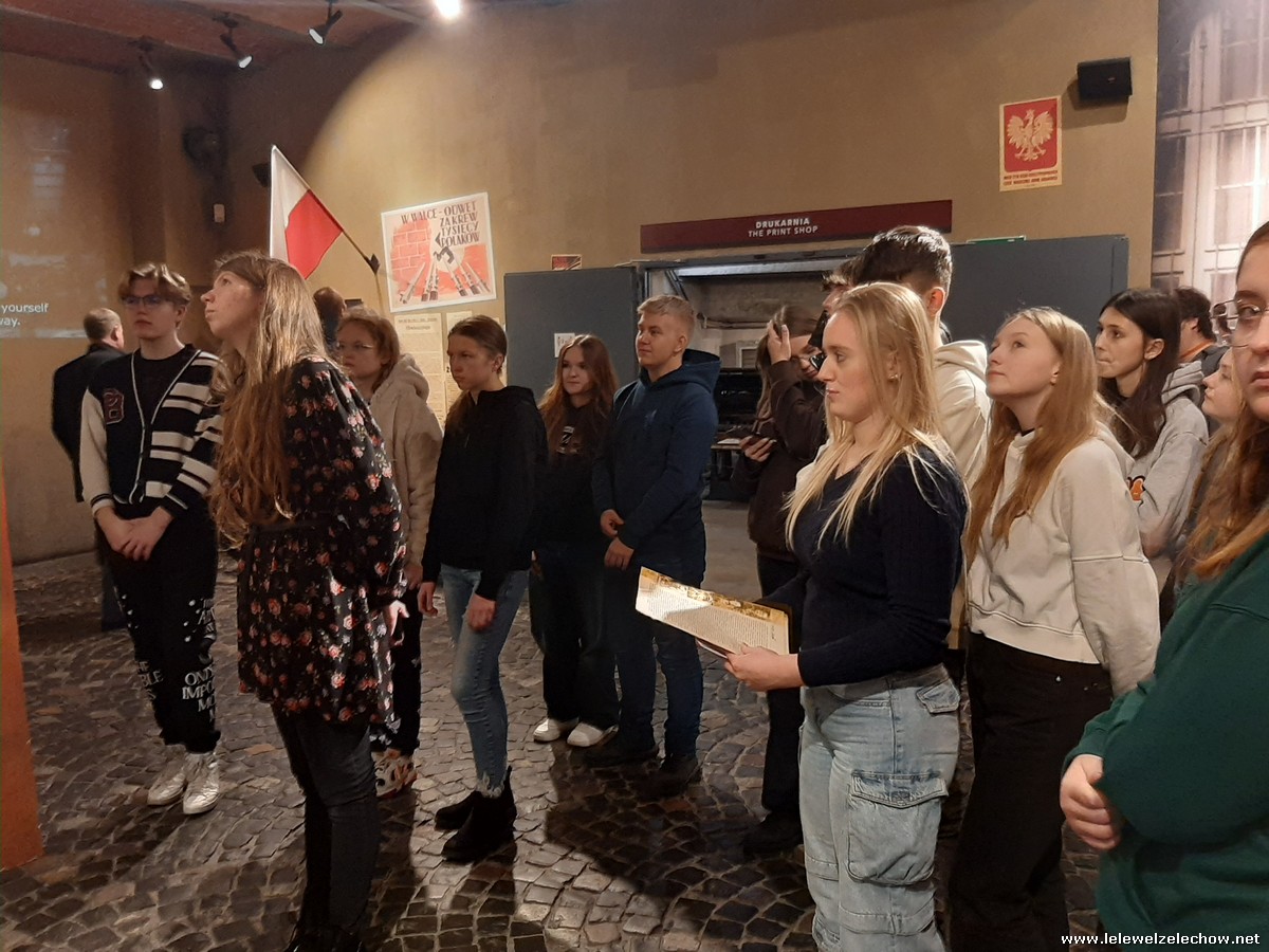 Grudniowe wycieczki mają swój niepowtarzalny klimat. Czuć już magię zbliżających się świąt, miasta przystrojone światełkami tworzą radosną atmosferę, a dodatkowo w tym roku od początku grudnia sypał śnieg. I właśnie w takim zimowym antruażu klasa 2b zastała stolicę 4 grudnia 2023 r., gdy przyjechała tu w ramach wycieczki. W programie było zwiedzanie Muzeum Powstania Warszawskiego. Pan przewodnik w zajmujący sposób opowiedział nam o dniach poprzedzających wybuch powstania oraz o jego przebiegu i upadku. Mogliśmy przypomnieć sobie to, co o wydarzeniach z sierpnia 1944 roku już wiedzieliśmy, ale też usłyszeliśmy wiele nowych informacji, np. o tym, które dzielnice włączały się w powstanie, w jaki sposób Niemcy prowadzili akcje propagandowe, jaka była kolejność walk powstańczych i jaką rolę odgrywało w nich przemieszczanie się kanałami. Usłyszeliśmy także o codziennym życiu w Warszawie oraz o roli kobiet w tym dramatycznym wydarzeniu. Obejrzeliśmy wstrząsający film „Miasto Ruin” - projekt przelotu nad zburzoną stolicą w technice 3D. Ogromne wrażenie zrobił na nas obraz wyludnionego miasta, jakim była Warszawa w 1945 roku orazwidok zniszczonych ulic ibudynków.