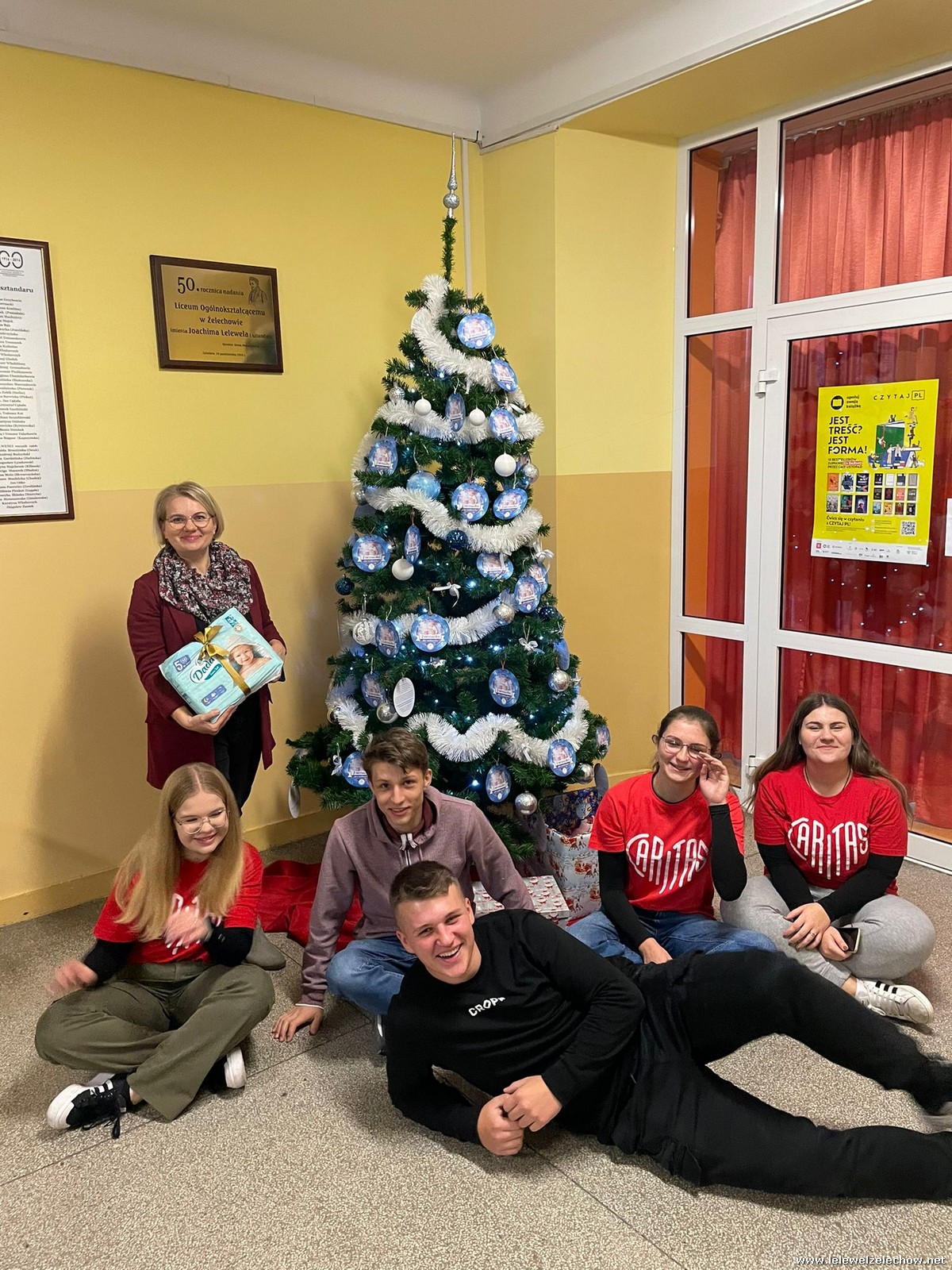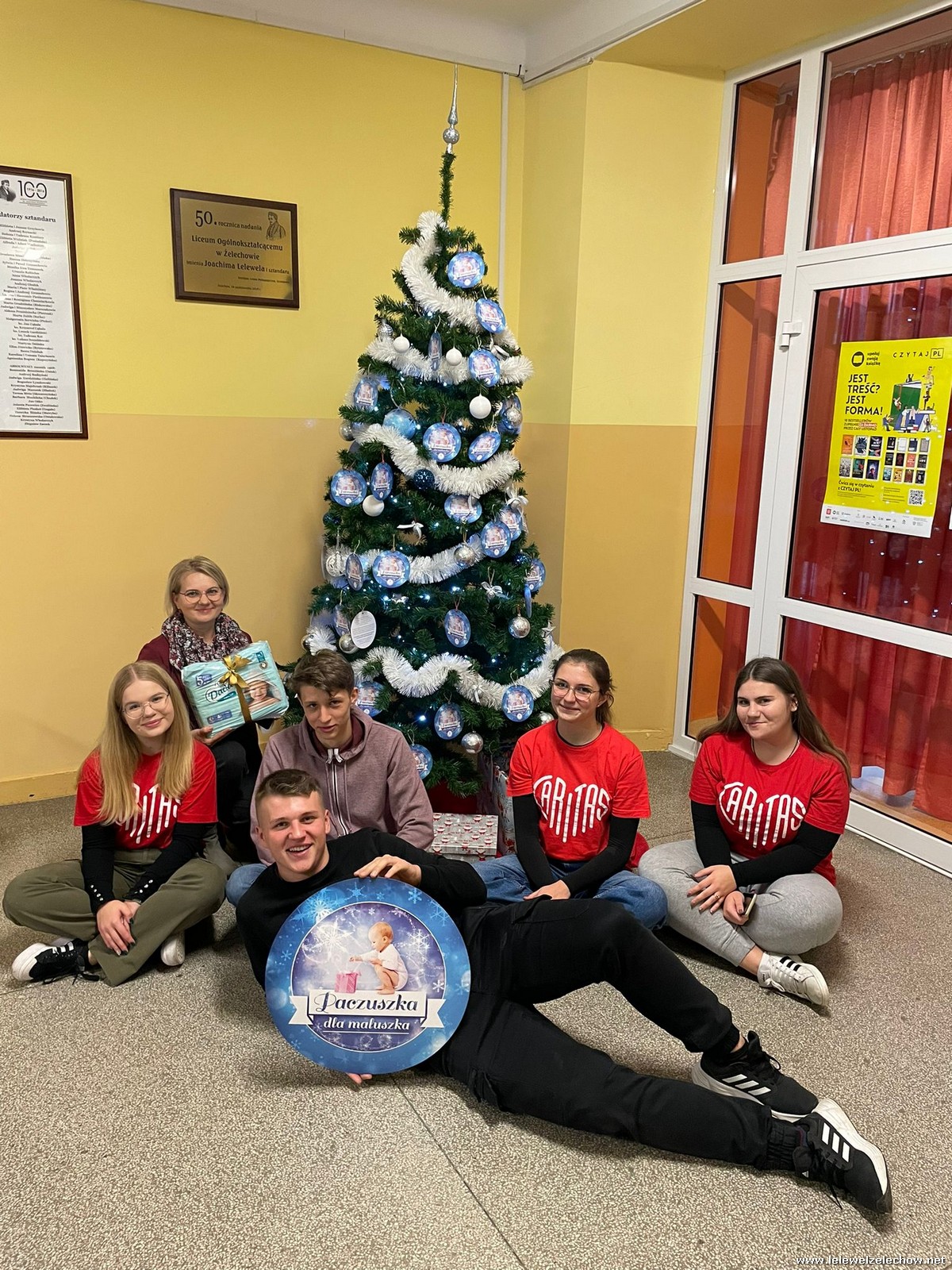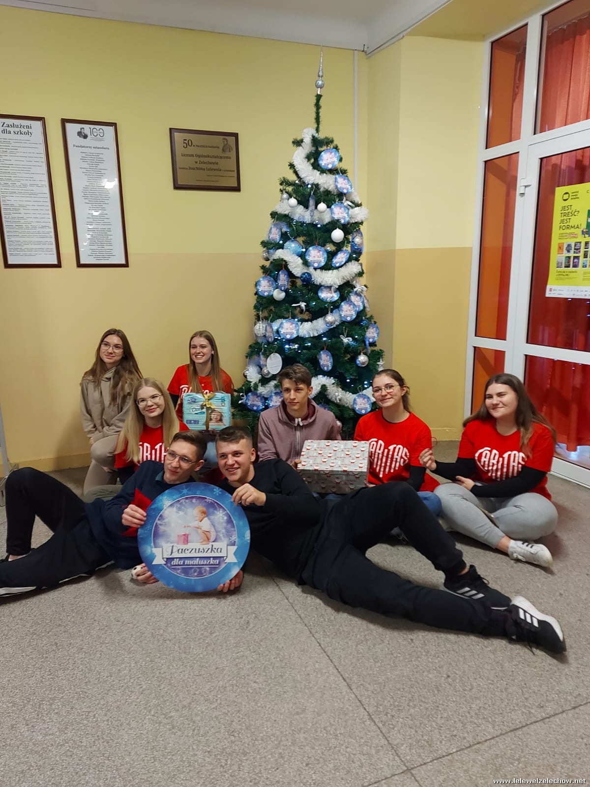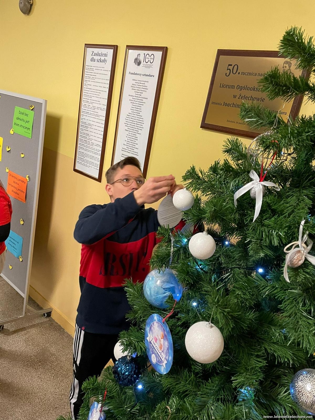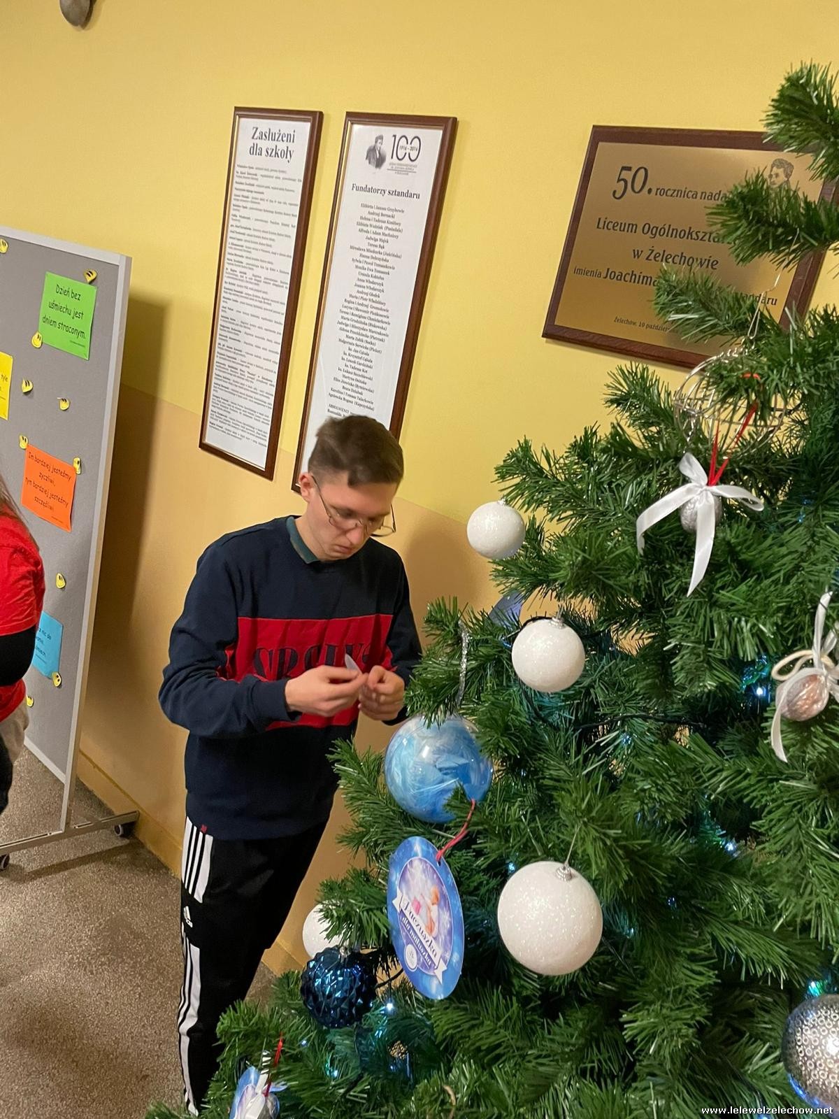 Wolontariusze Szkolnego Koła Caritas z księdzem Mariuszem oraz Samorządem Szkolnym ubrali choinkę, na której zawisły specjalne paczuszkowe bombki.