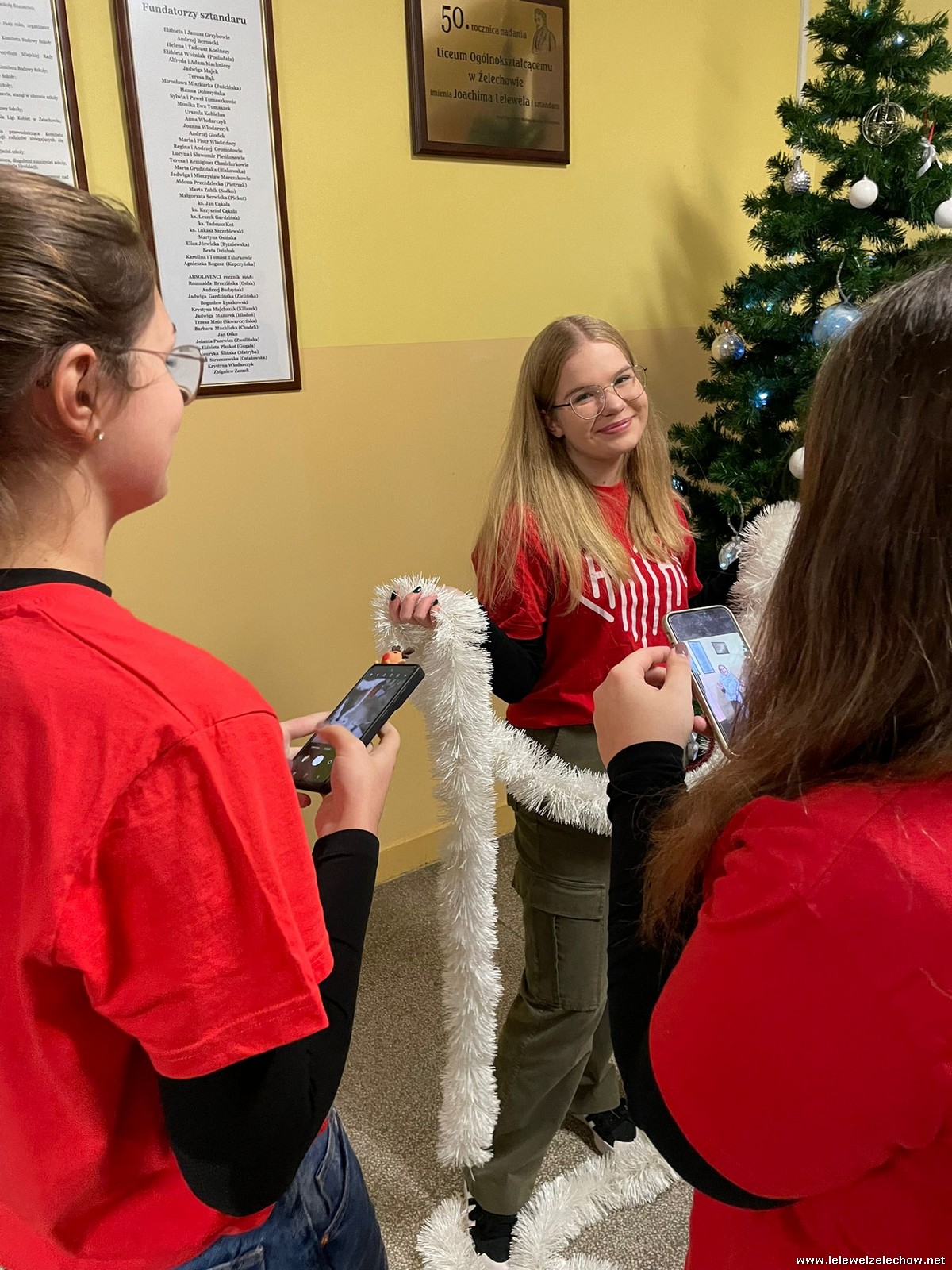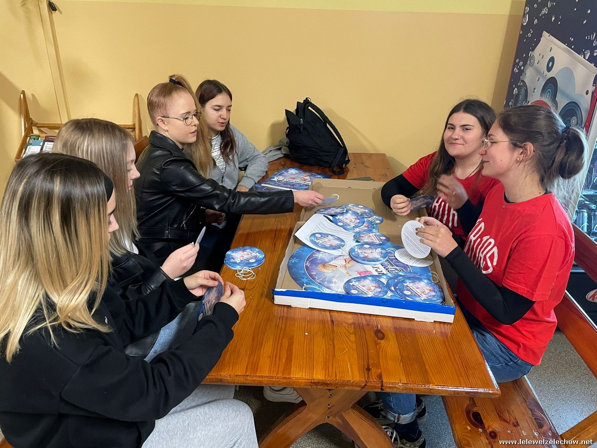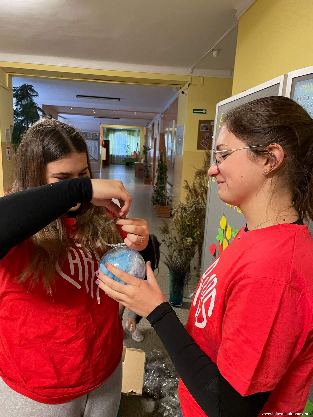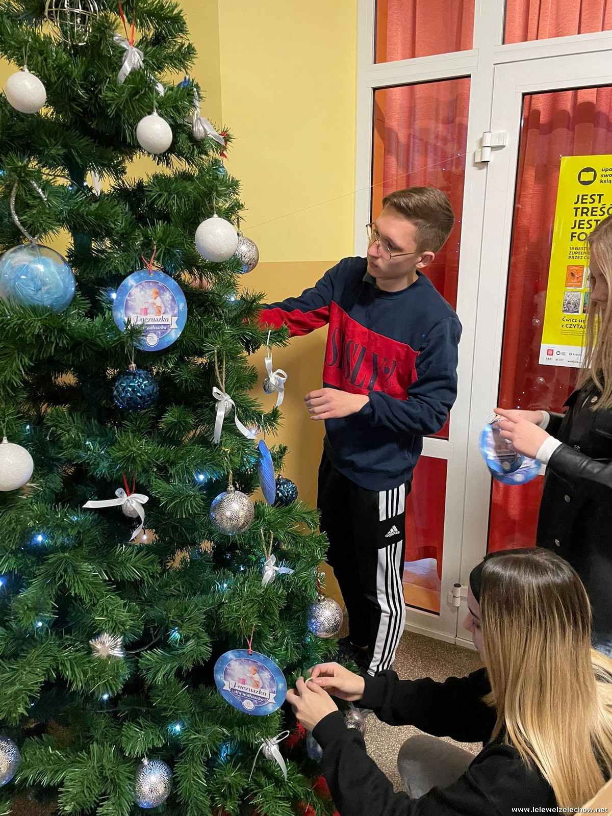 Wolontariusze Szkolnego Koła Caritas z księdzem Mariuszem oraz Samorządem Szkolnym ubrali choinkę, na której zawisły specjalne paczuszkowe bombki.
