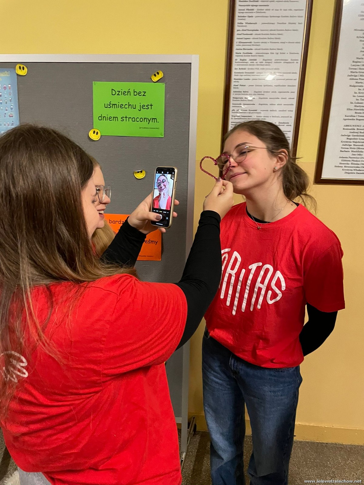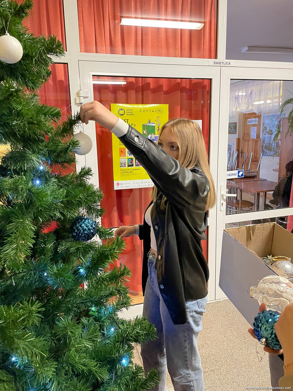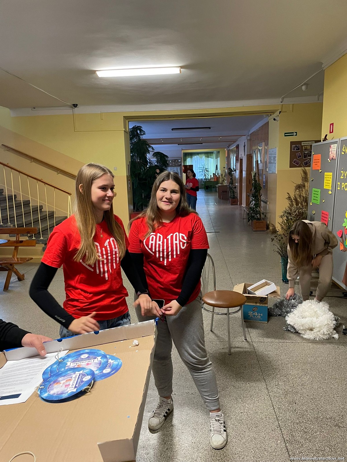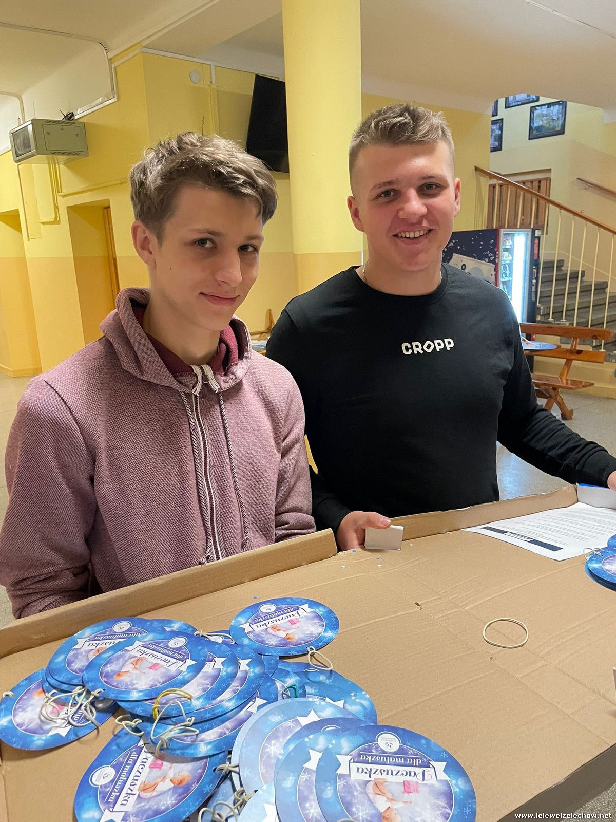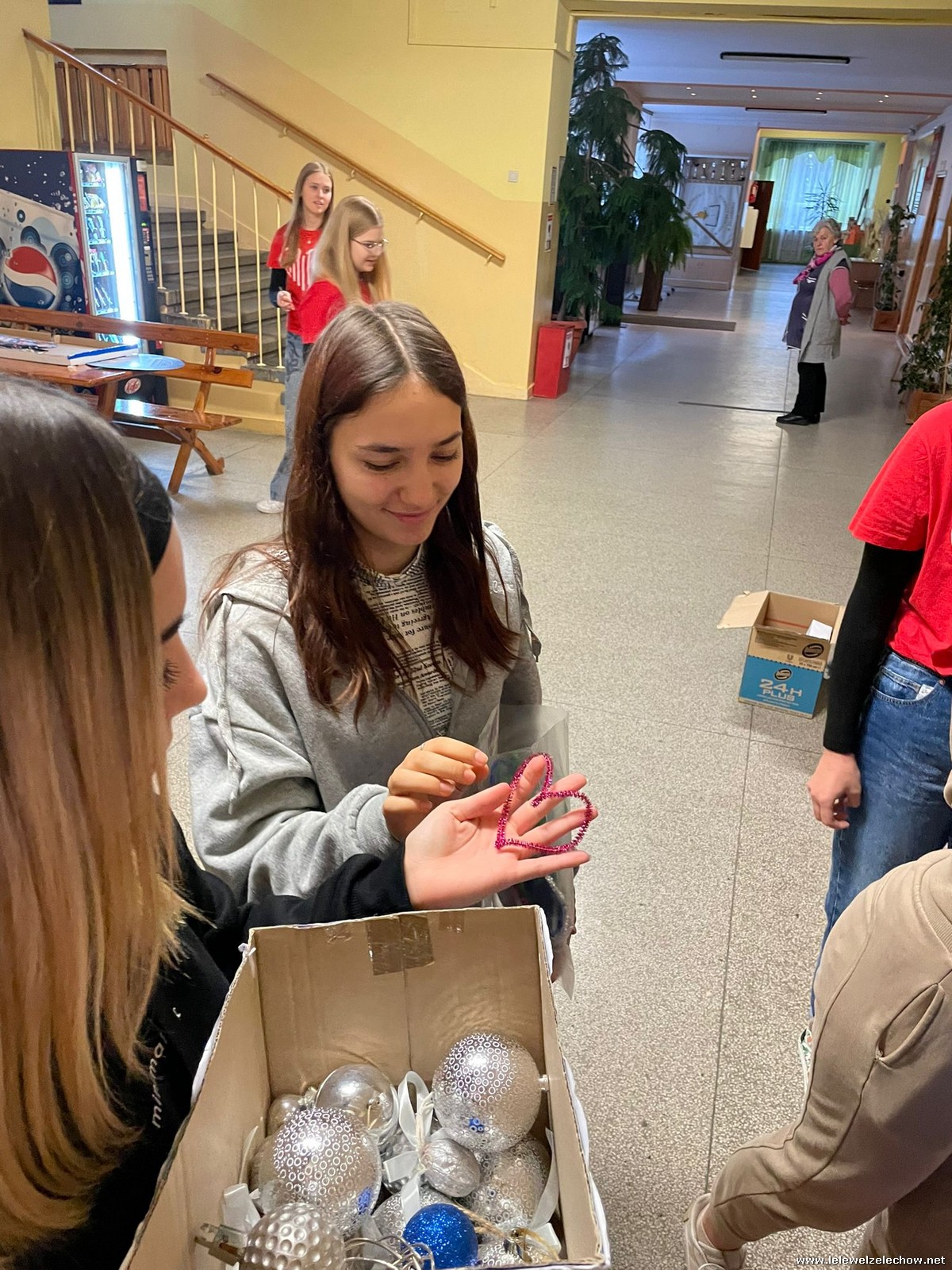 Wolontariusze Szkolnego Koła Caritas z księdzem Mariuszem oraz Samorządem Szkolnym ubrali choinkę, na której zawisły specjalne paczuszkowe bombki.
