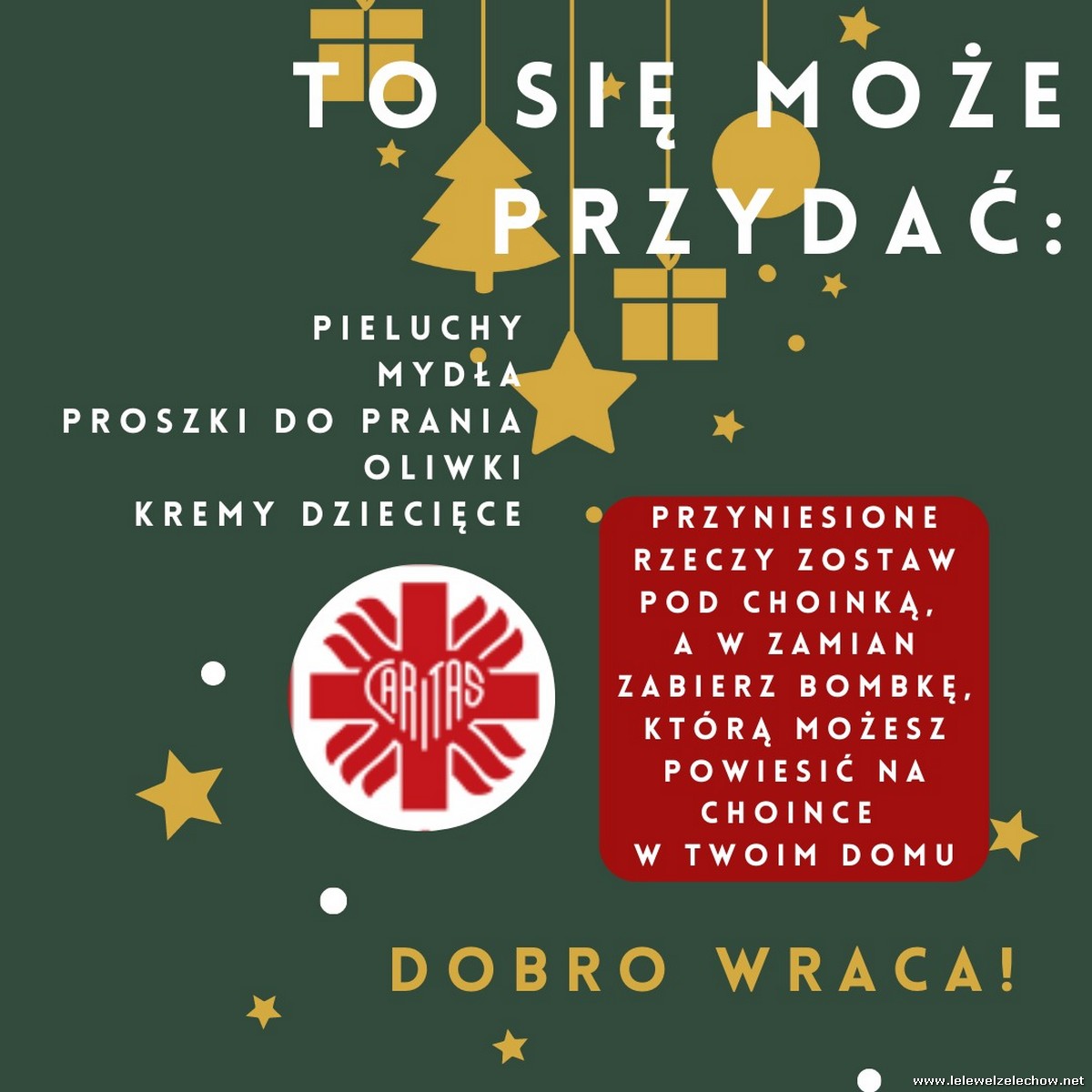 Każdy, kto zechce pomóc małym dzieciom i mamom w potrzebie, może wziąć bombkę, a w zamian proszony jest o przyniesienie „paczuszki dla maluszka”.